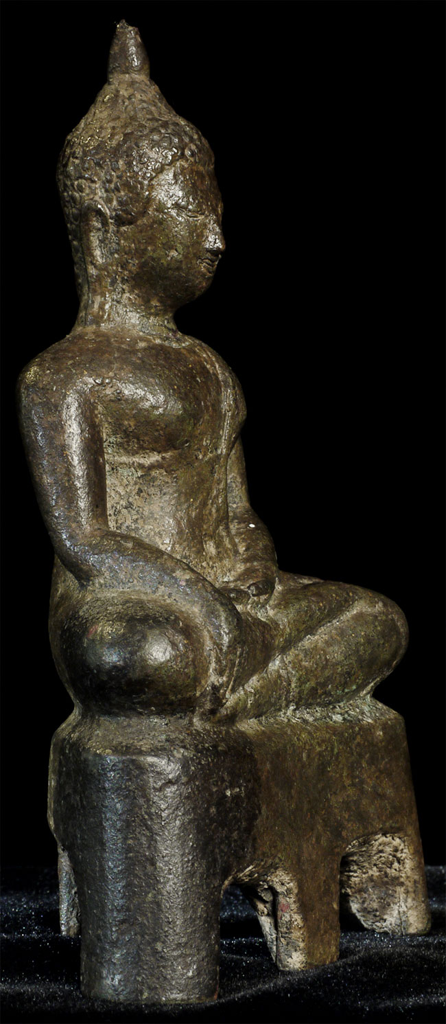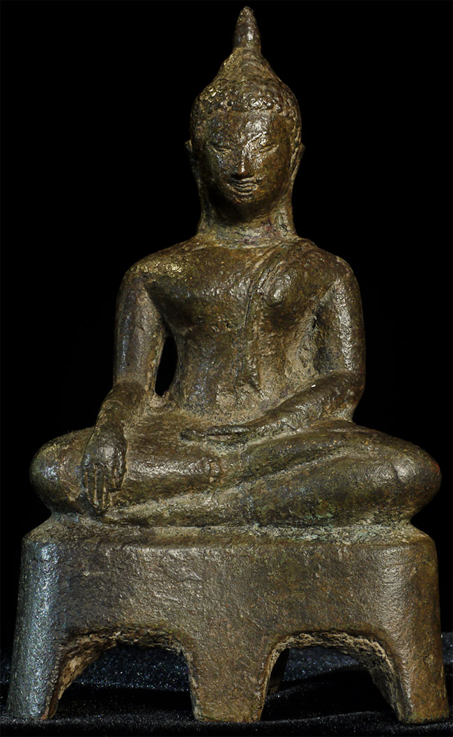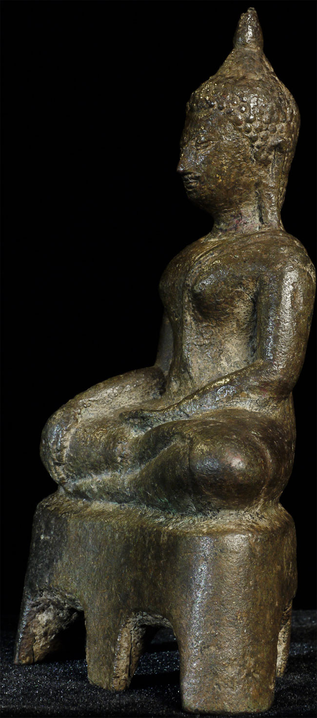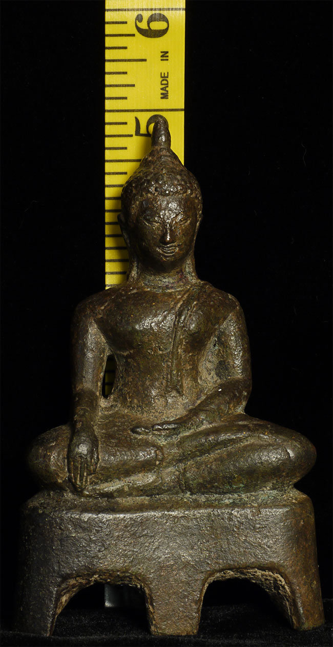 This is a nice Kampen Phet Thai Bronze Buddha. This style is also known as a late Sukothai, as it comes from a Kingdom near Sukothai that was at it's peak in the 15th century. He stands 5 inches high by 3 inches wide at the base.