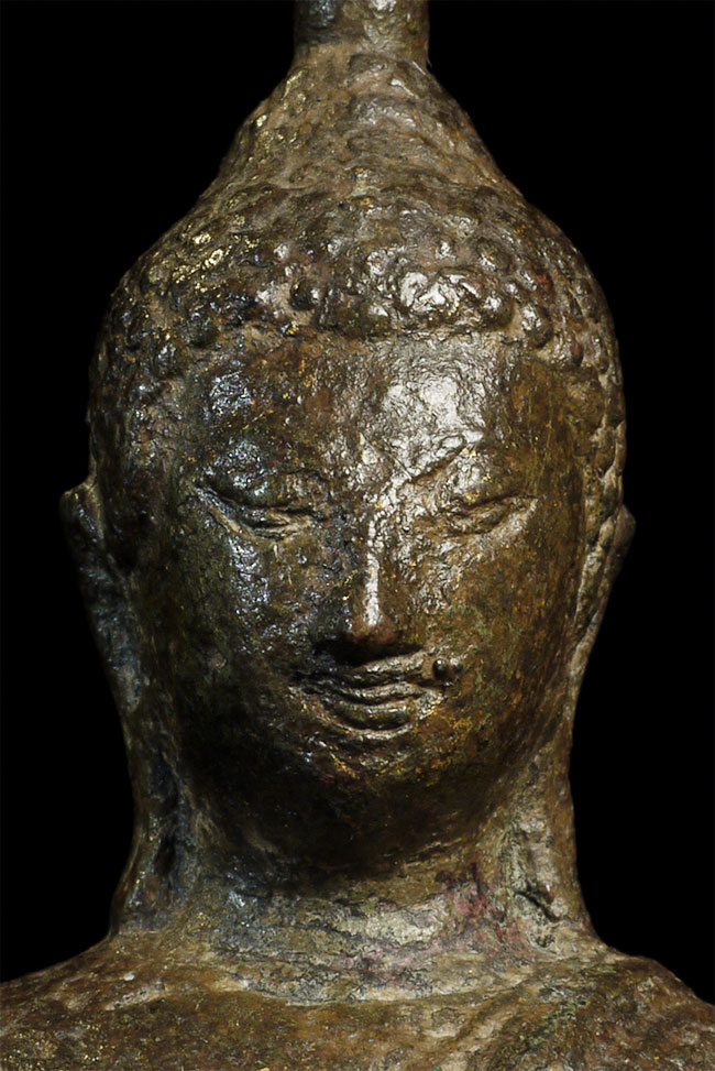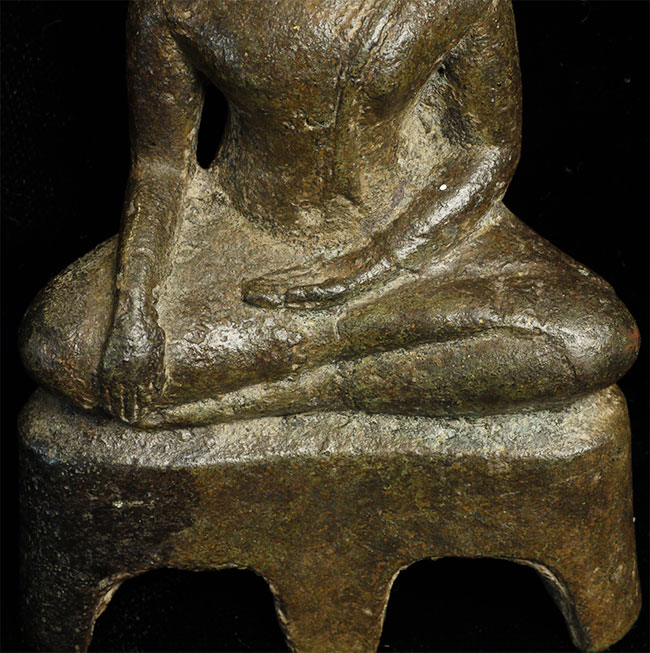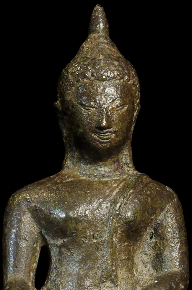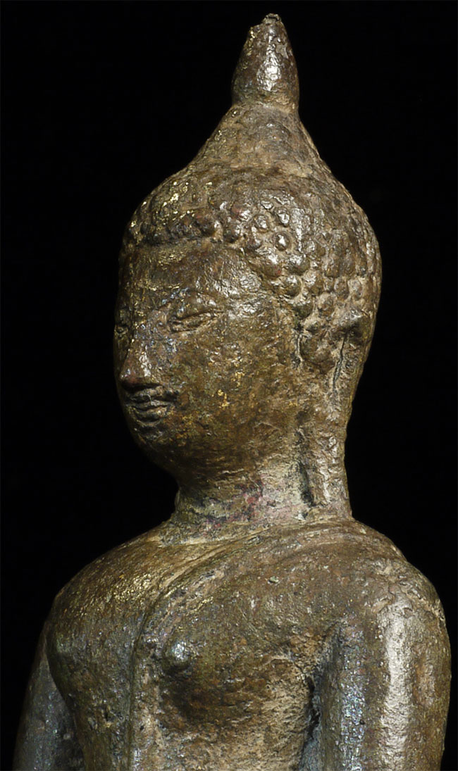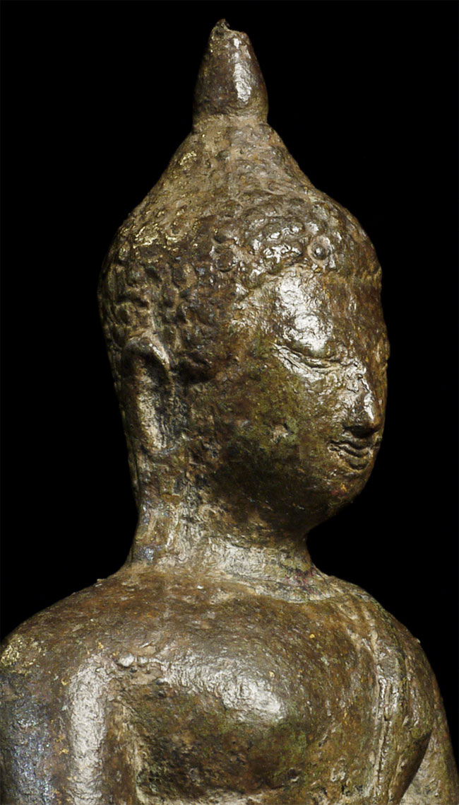 This is a nice Kampen Phet Thai Bronze Buddha. This style is also known as a late Sukothai, as it comes from a Kingdom near Sukothai that was at it's peak in the 15th century. He stands 5 inches high by 3 inches wide at the base.