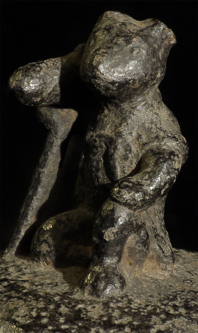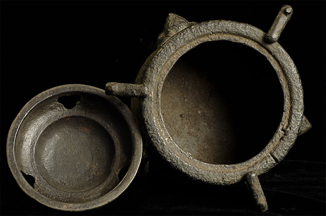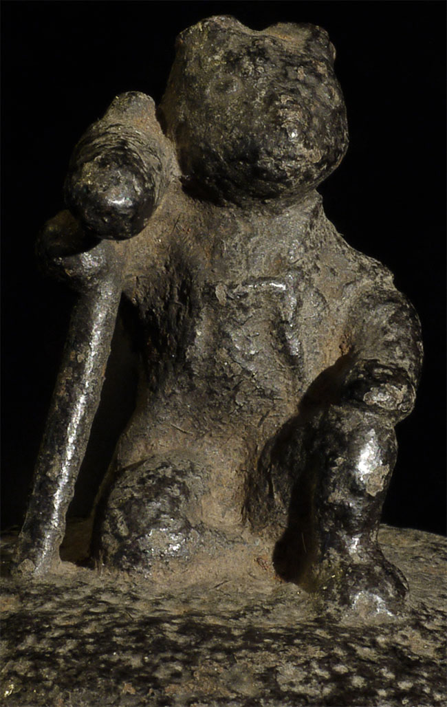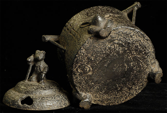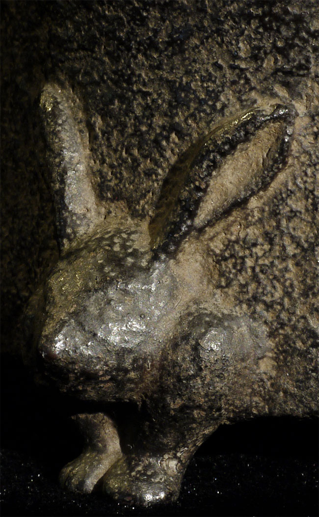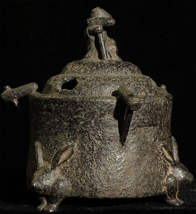 Antique Chinese(?) Iron censor. The top has a rabbit with a walking stick (he is missing his ears). Each of the 3 feet is another rabbit, with their 3 corresponding walking sticks holding the lid in place. Very unusual. Appears extremely old. 4.25" at tallest point. Diameter of 3.5"