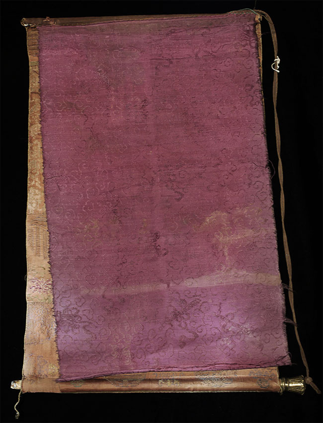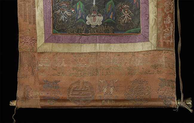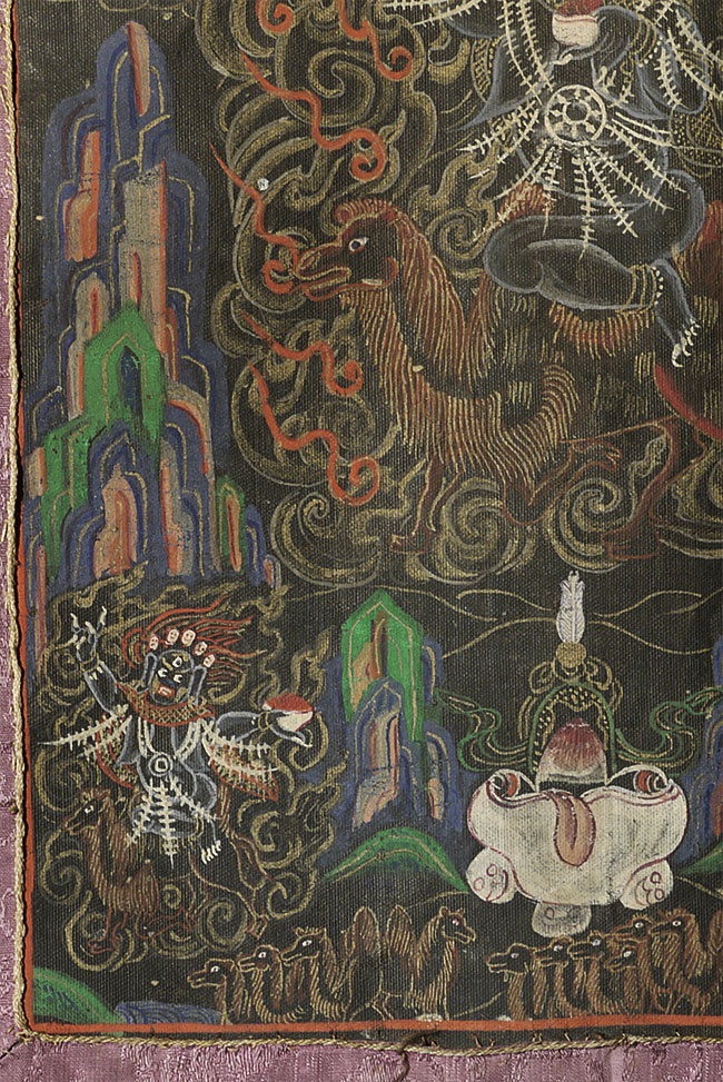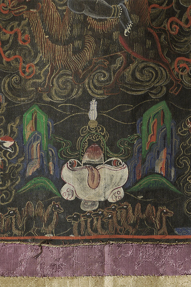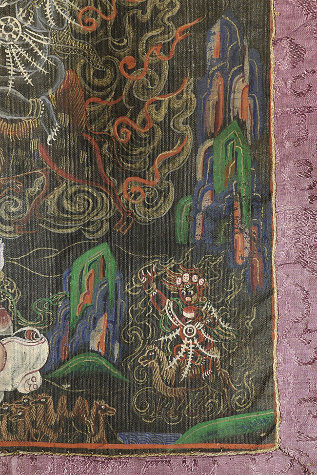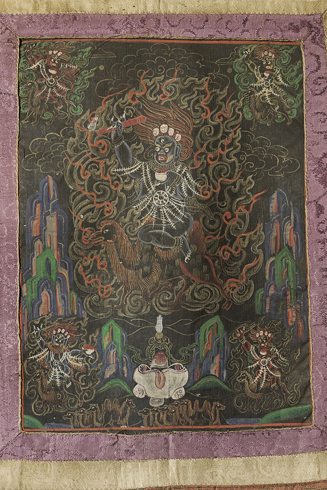 Vintage/Old Mongolian Black Ground Thangka. Fierce!. Size- is 10.75" x 7.5". Framed by hand-pieced silk. Total size is 20" x 14".