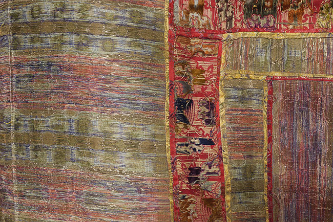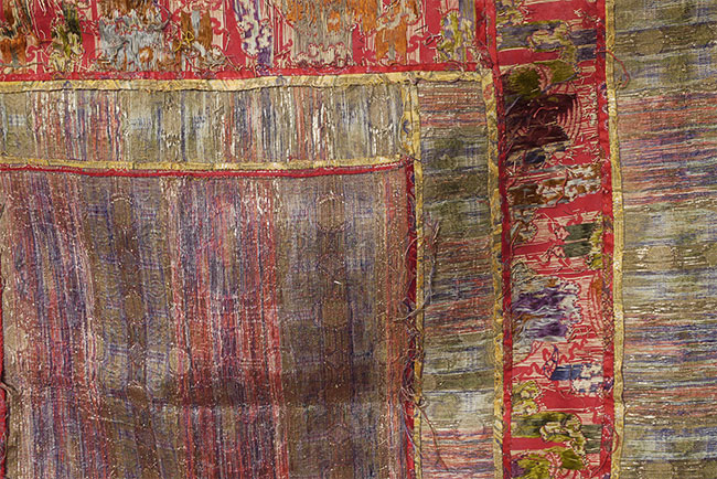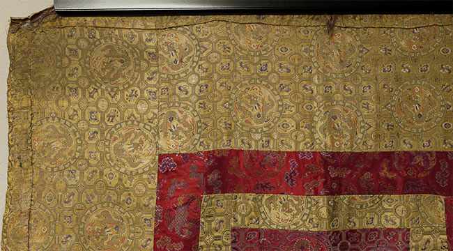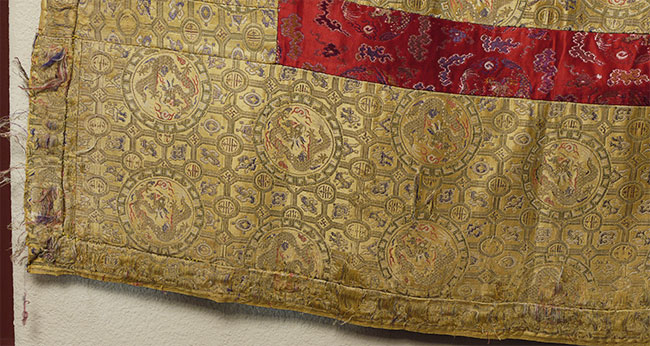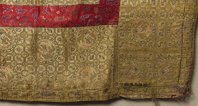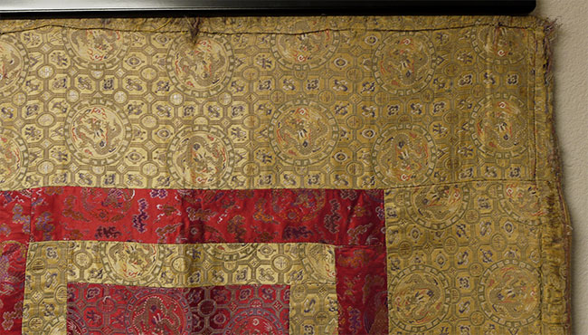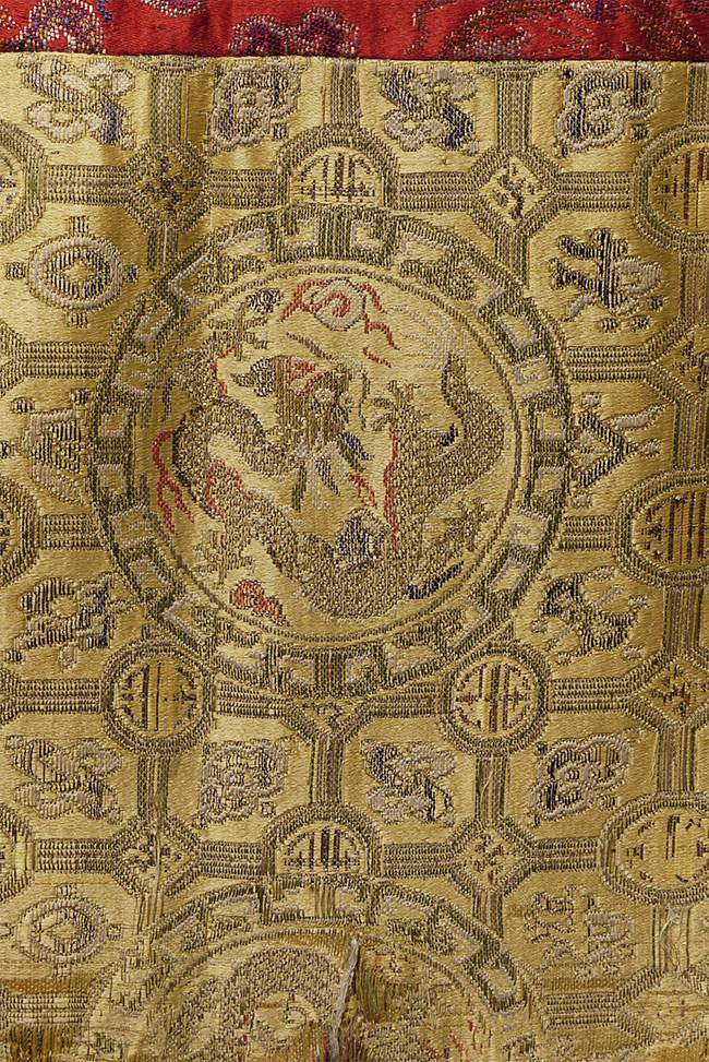 Large Tibetan Cushion Cover for a High Lama - Red and gold imperial silk w/ dragon/lattice design - 17th/18th c. 41" square