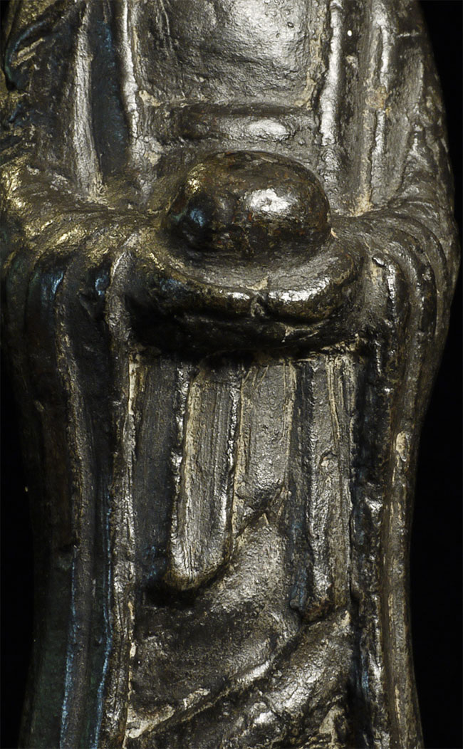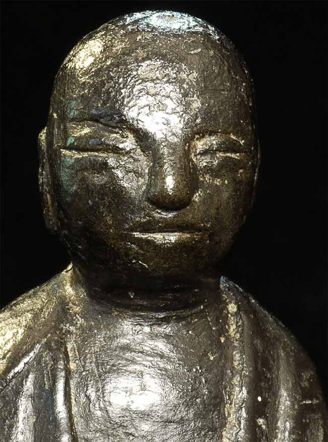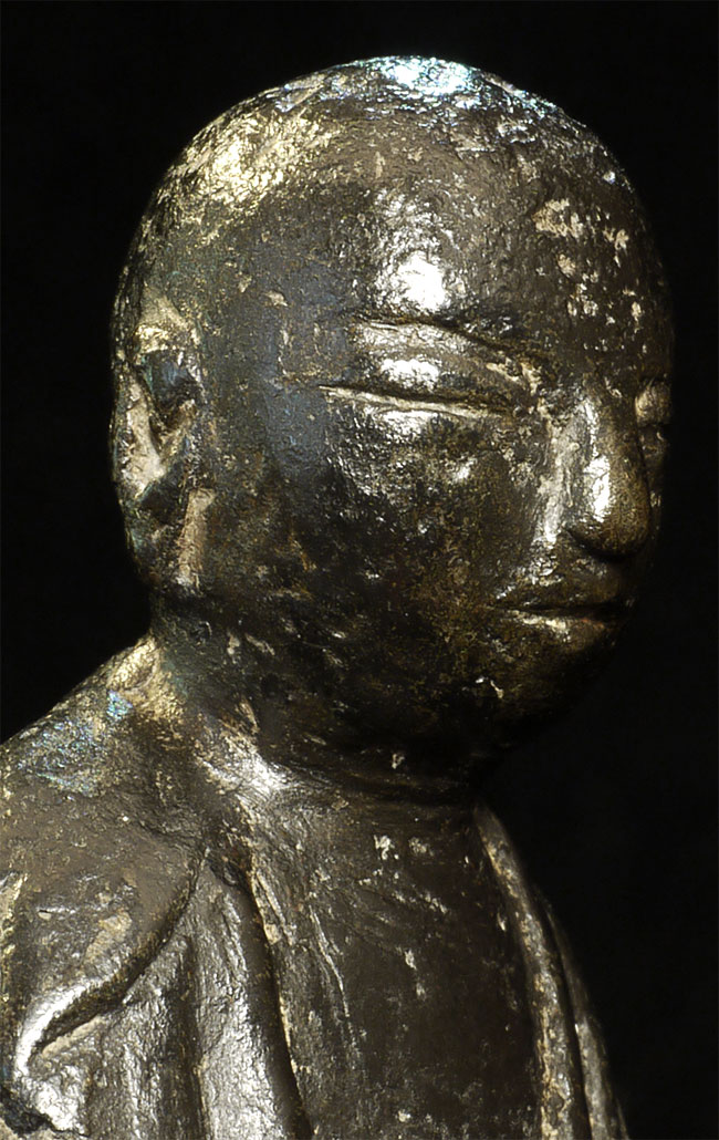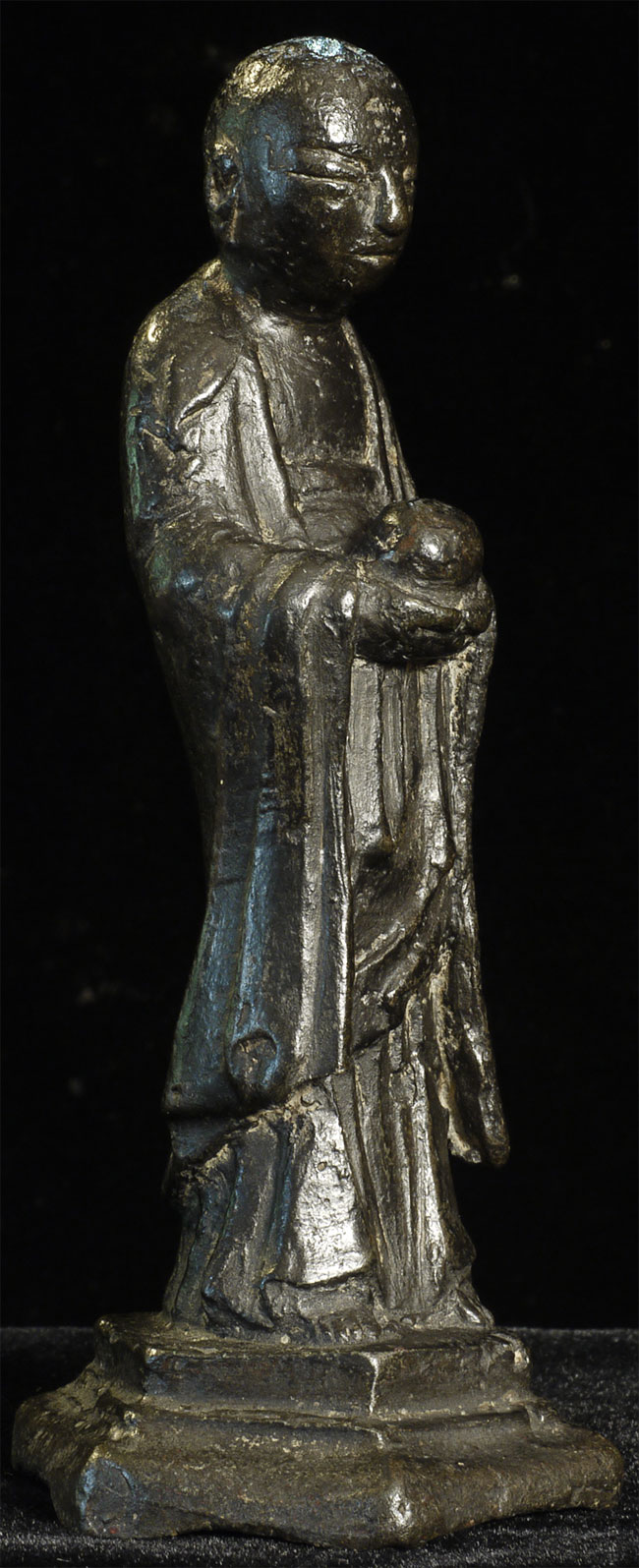 Delightful Chinese or Japanese bronze Monk. Wonderful! Unsure of dating, but looks to be quite early. Stands in deep concentration. 5.25" tall