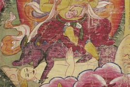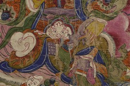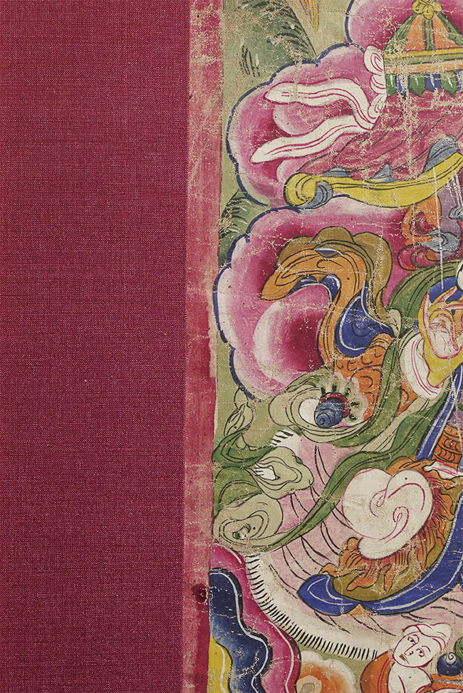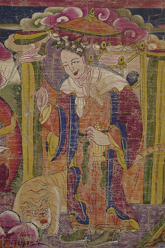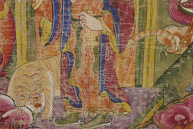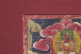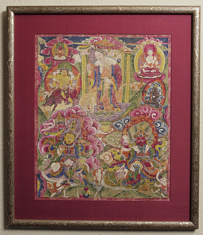Powerful and very uncommon style 18/19thC Tibetan Thangka. Dimensions: 18.5" x 15". Custom silk matting and frame complete this to a 25.75" x 22.5". A few dings to frame and expectable wear, but overall, still vibrant and visusally arresting.