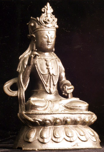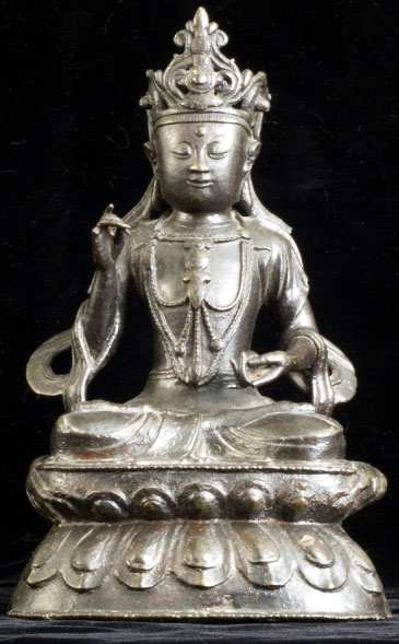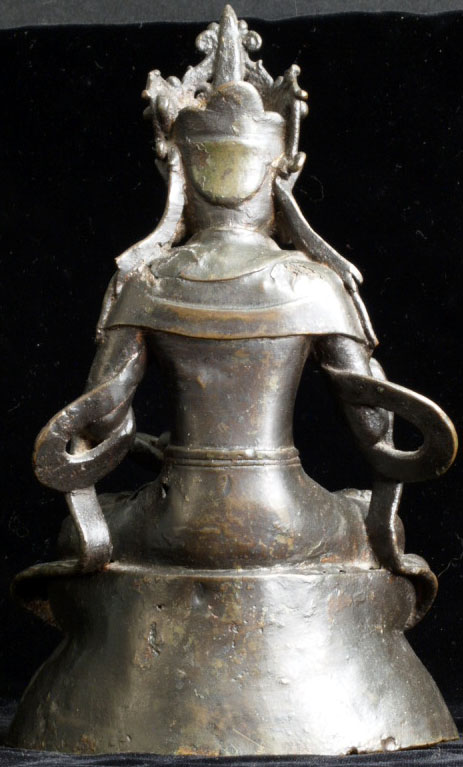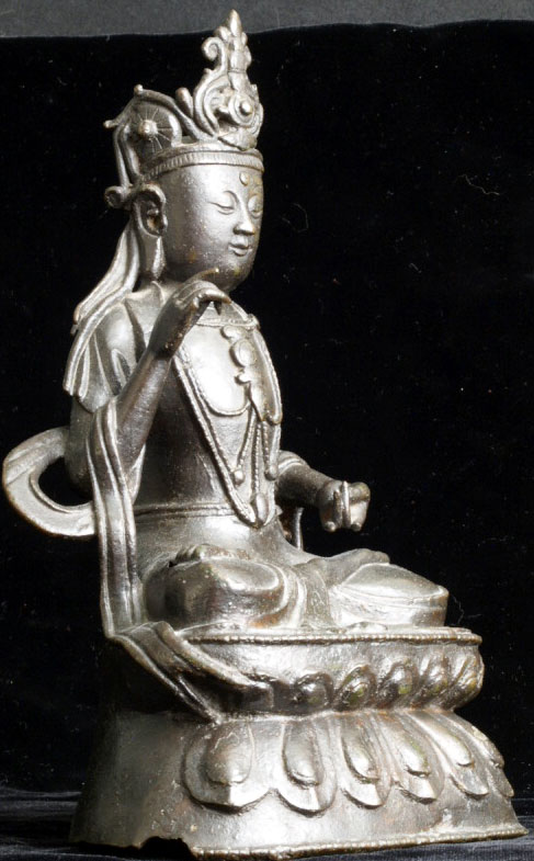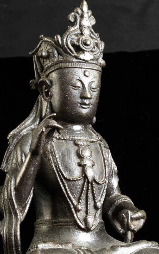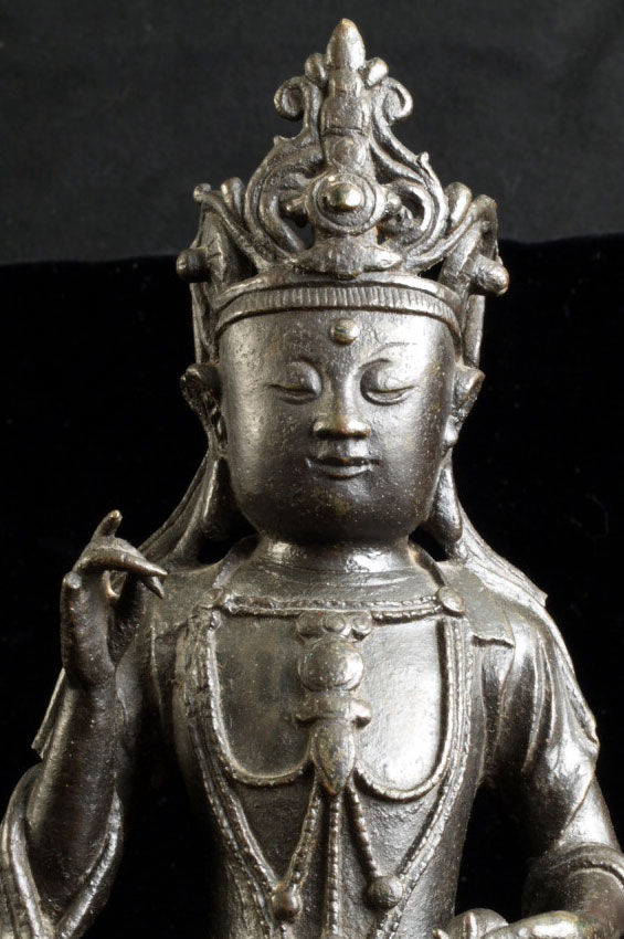 This is a beautiful 18th century Chinese bronze Buddha / Bodhisattva / Quan Yin. It has an exceptionally beautiful face. There are a few original casting flaws and two finger tips long missing but otherwise is in excellent condition. One of the nicest of its type I have ever had. The countenance is superb. Sits 8.5 inches tall.