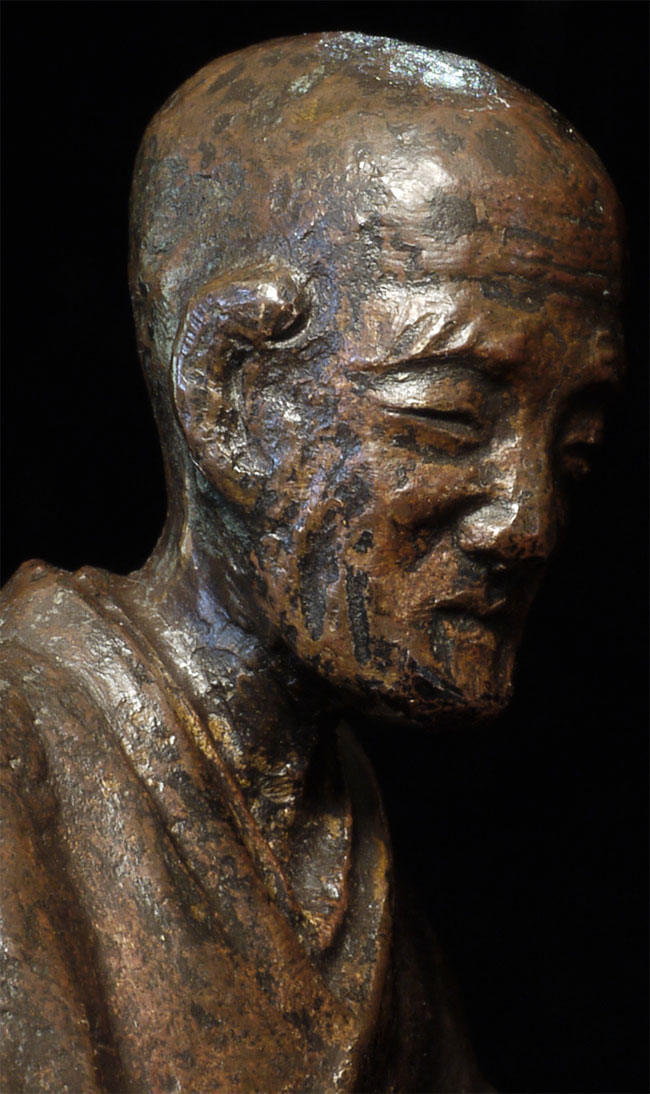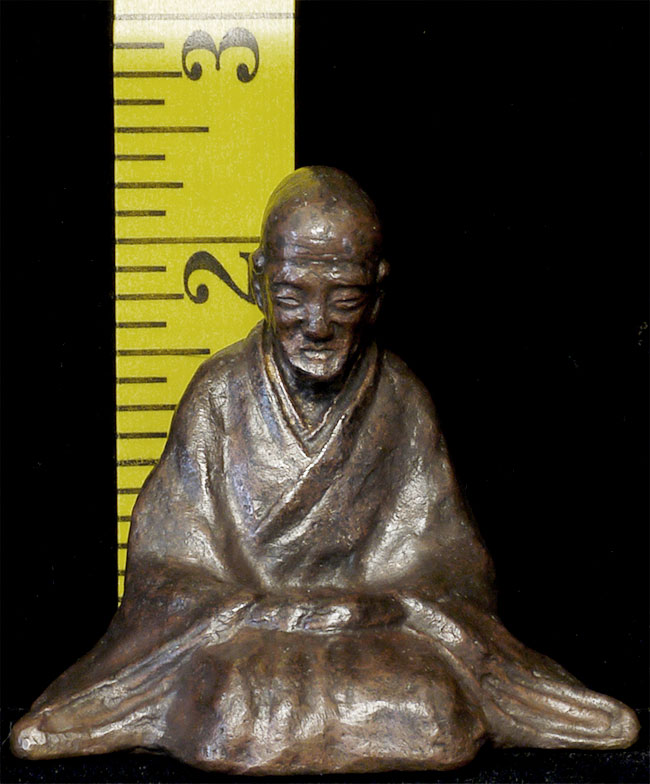 Sensitively modeled early Japanese(?) Monk or Buddhist teacher. Looks to be hundreds of years old. Remains of gilding on the borders of the robe near the neck. 2.25" tall. Optional stand. Very special. Marked on the bottom, as seen in the last photo. Rare- much different in quality and feel than most Japanese pieces