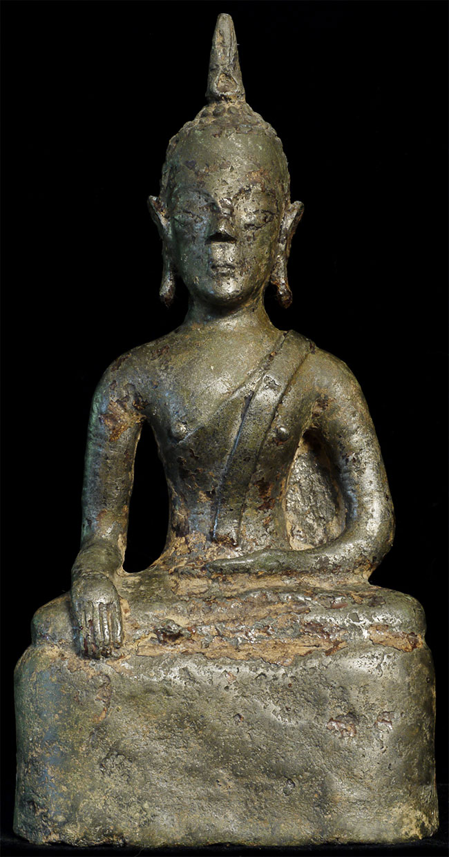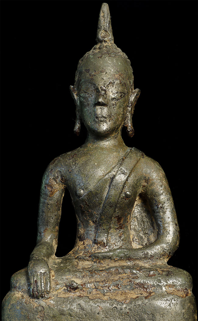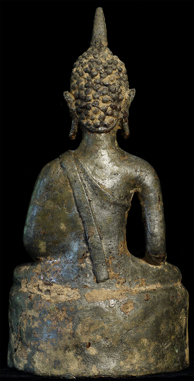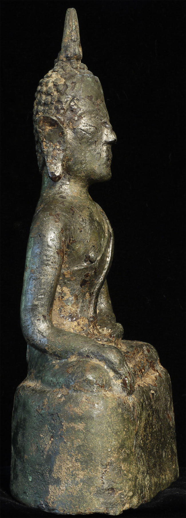 Powerful and ancient Buddha that looks like no other I have seen. I believe it is from the far north of Thaiand from the ancient kingdom of Fang and is 14th century. It is very heavily cast with traces of lacquer. There is one crack in the base on the rear. A nice size at 10.5 inches high.