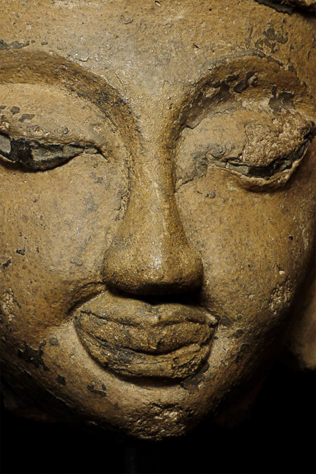 This is an extremely charming Post Pagan provincial terracotta Buddha head. The features are so unusual that it almost looks monkey like, with a flat forehead and crown, floppy ears, and protruding lips.It has losses and wear , as can be seen in the photos. The original piece would have been extremely imposing. I've never seen another like it. Head is 5" tall, total height is 7"