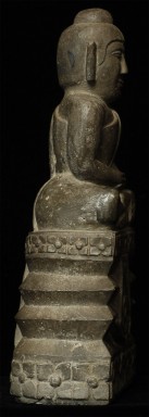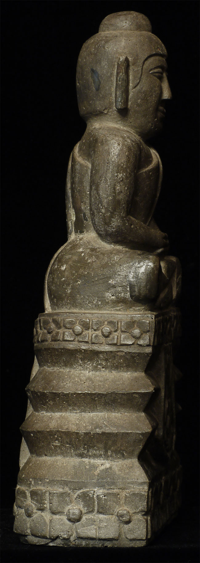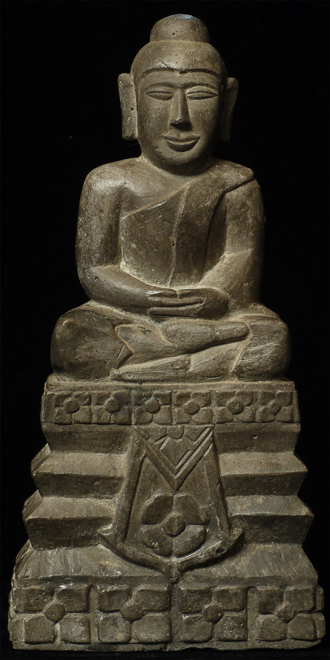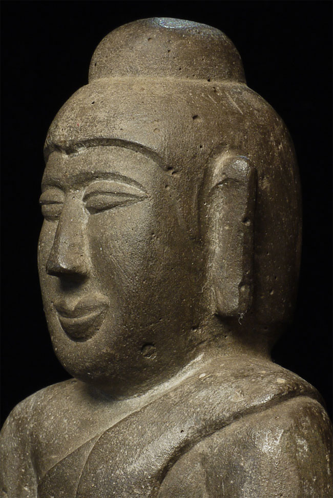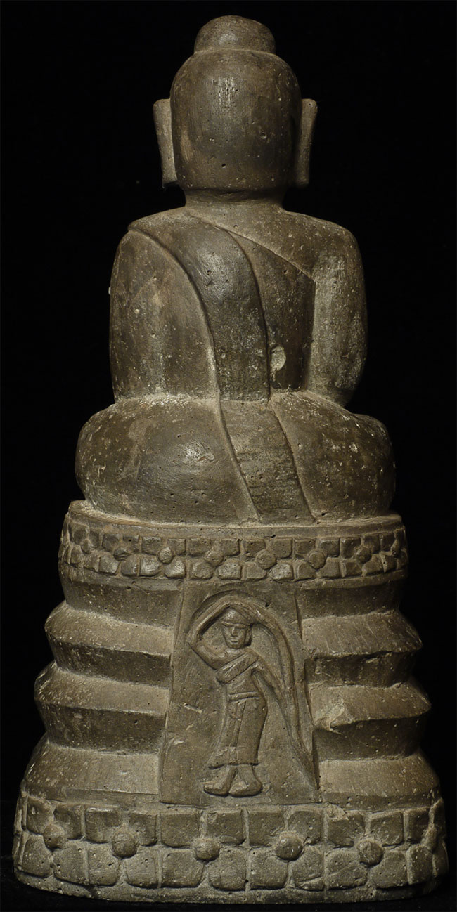 Northern Thai stone Buddha. Unusual base - note the back with the earth mother washing her hair. Very well carved, with a beautiful face and very clean lines. Measures 7-5/8" tall.
