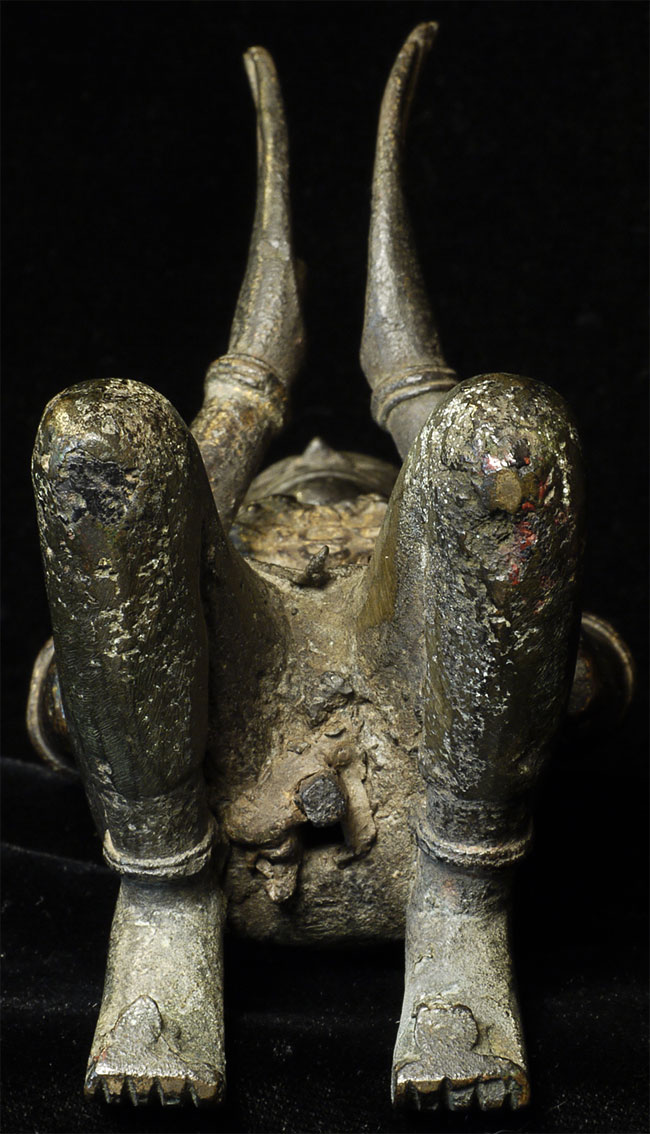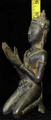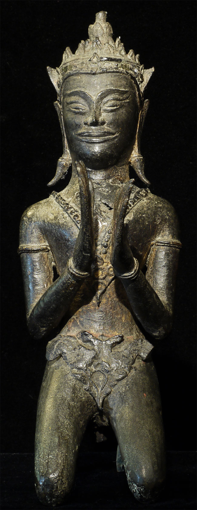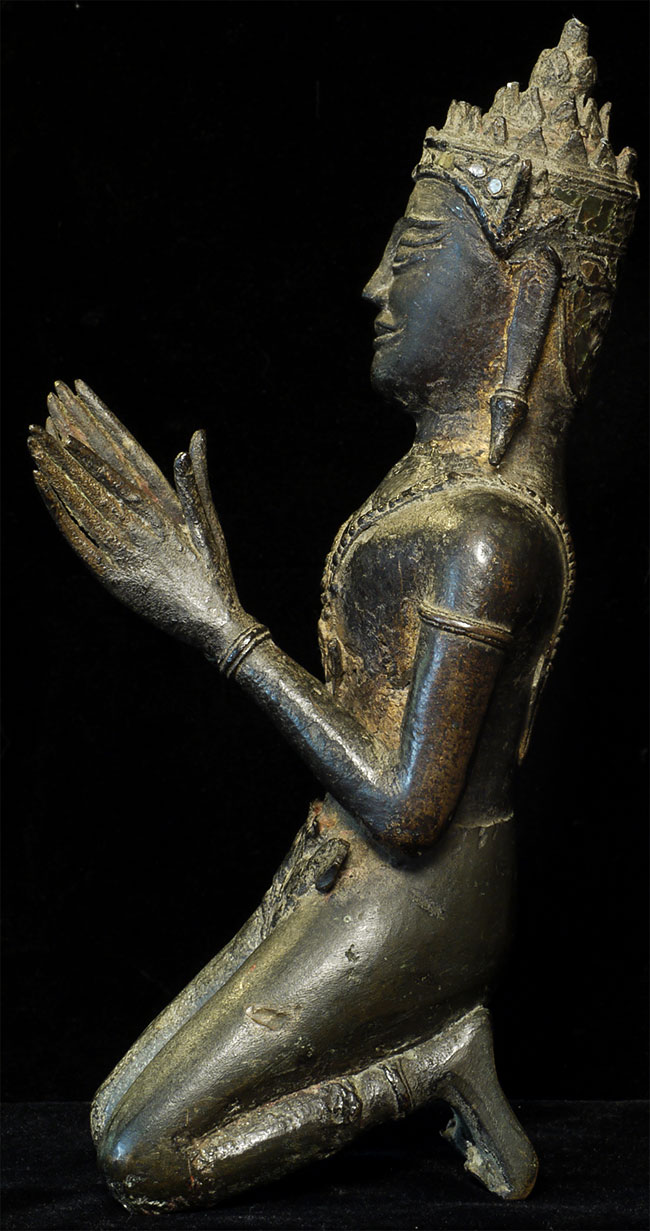 A personal favorite- a large Cambodian 16-18thC solid cast kneeling Buddhist figure. He has original bits of glass ornamentation in his crown. He is from the same period as the Ayuthaya Period in Thailand. Extremely heavy, and larger than his dimensions convey. Wonderful smile which shines brightly. 8.5" tall.
