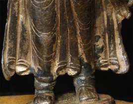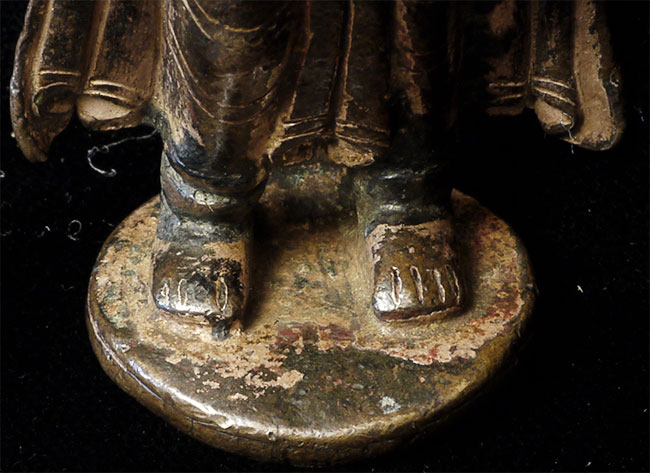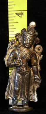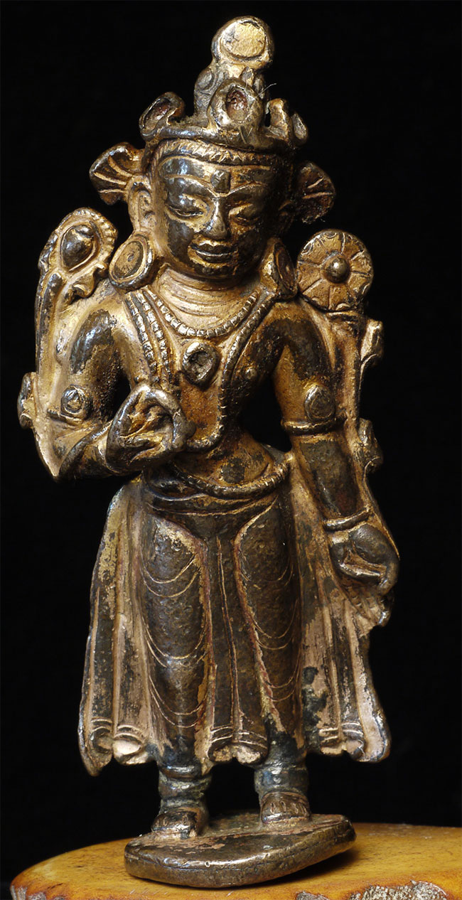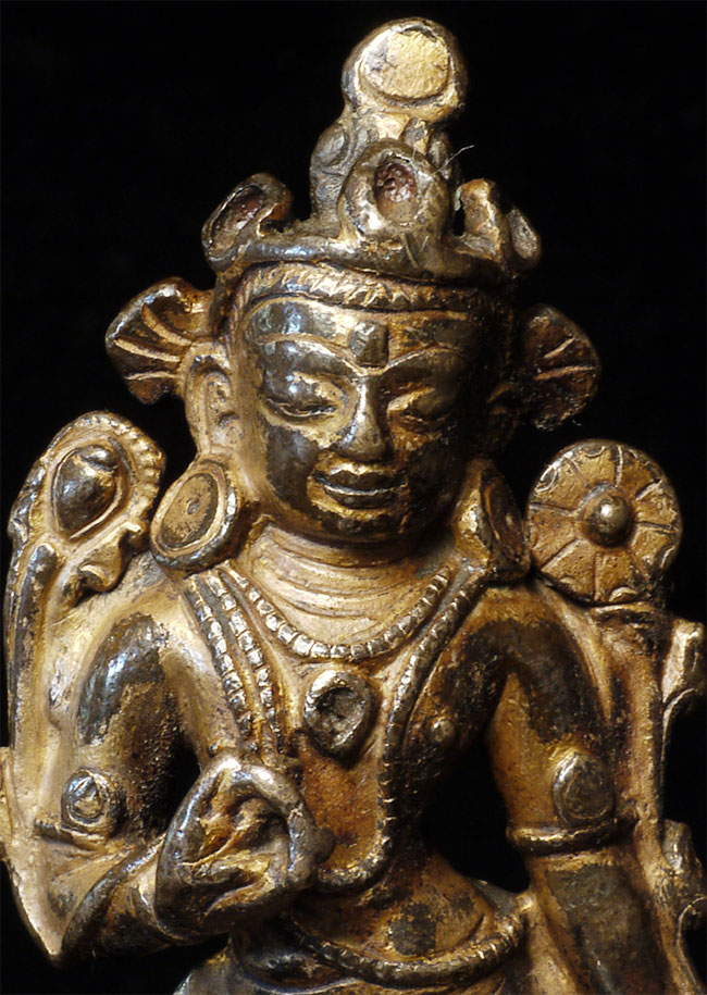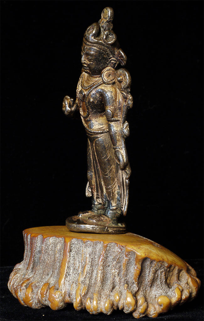 Very special 17thC or earlier Tibetan Padmapani cast out of a very high quality alloy which appears to have precious metal in it. 3 7/8" tall. Stand elevates it another 1 1/8". May be reattached at the ankles.