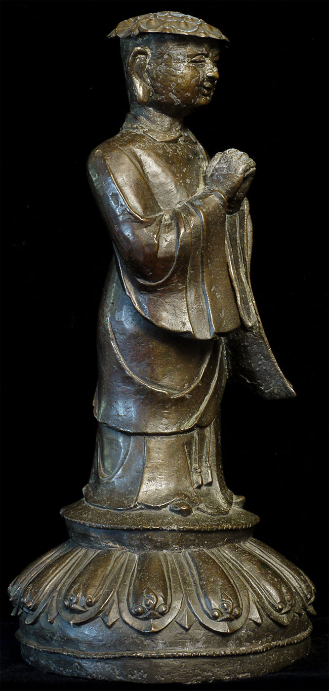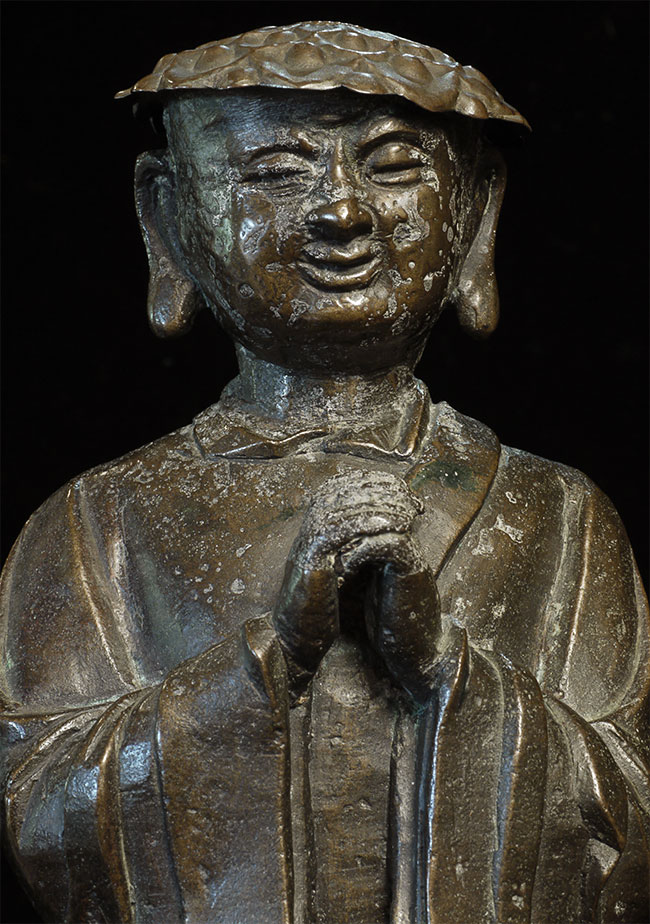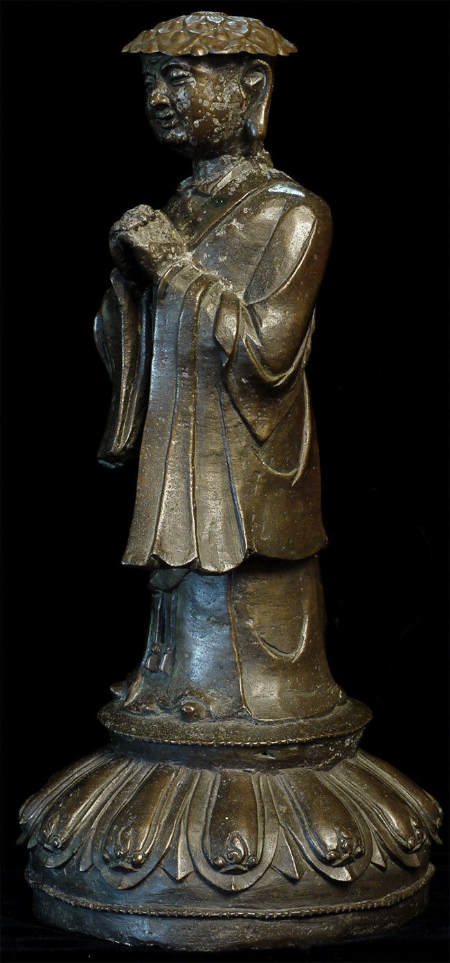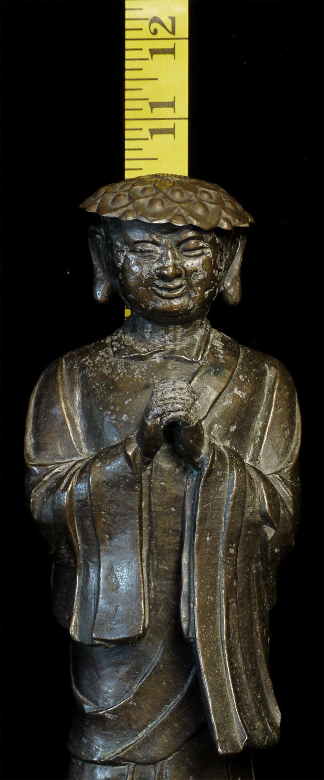 C Ming Buddhist Monk with a lovely face. Has extensive original casting flaws, as can be seen in the photos. Someone, probably after original casting, created his distinctive "hat" to cover the loss to the top part of his head. Somehow his look works. Large at 10.5" tall.
