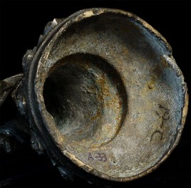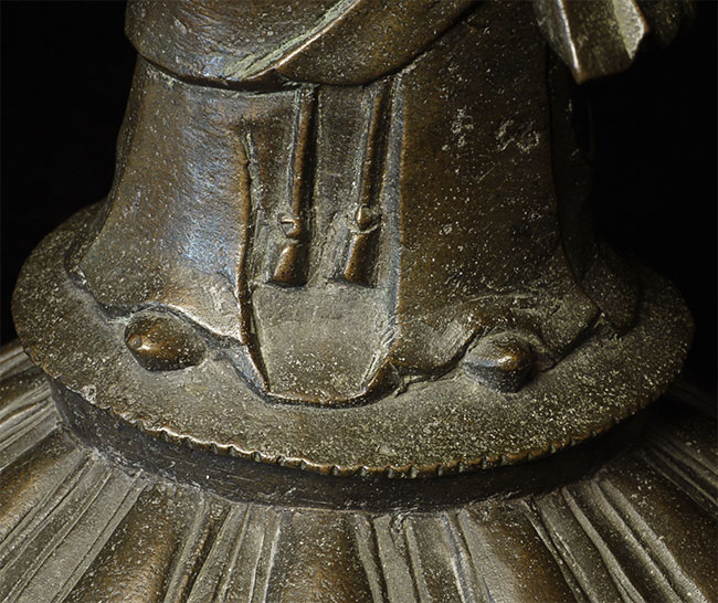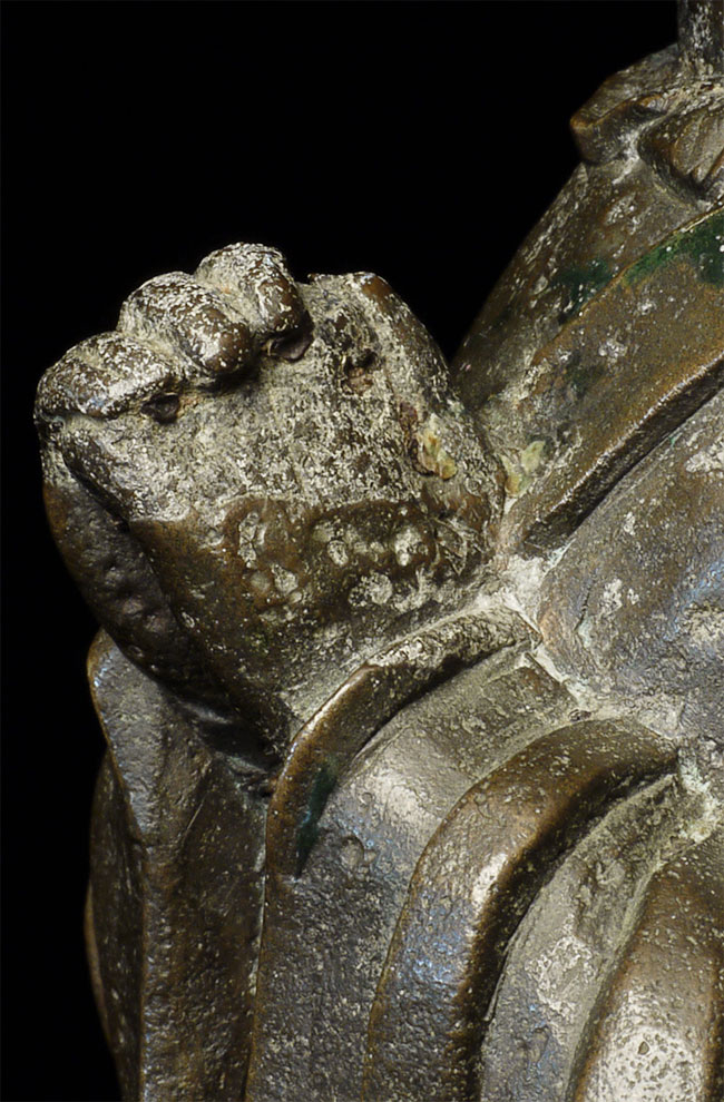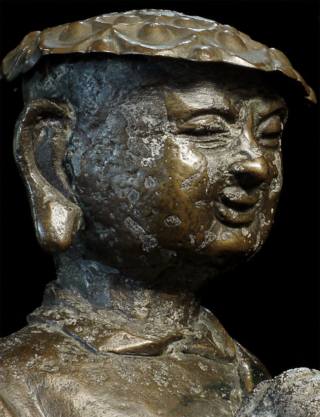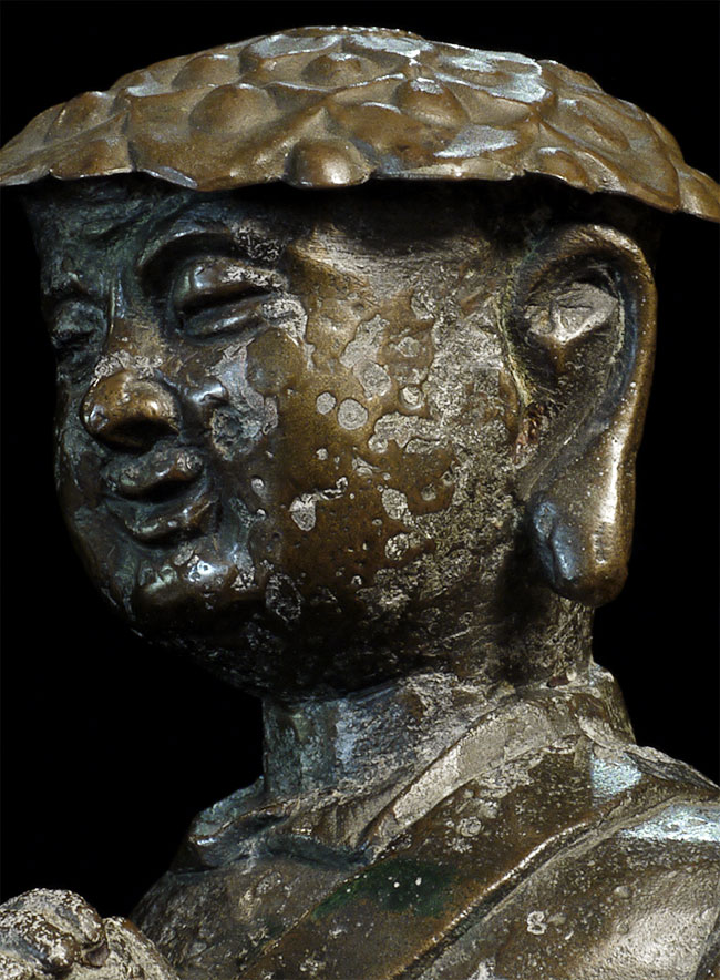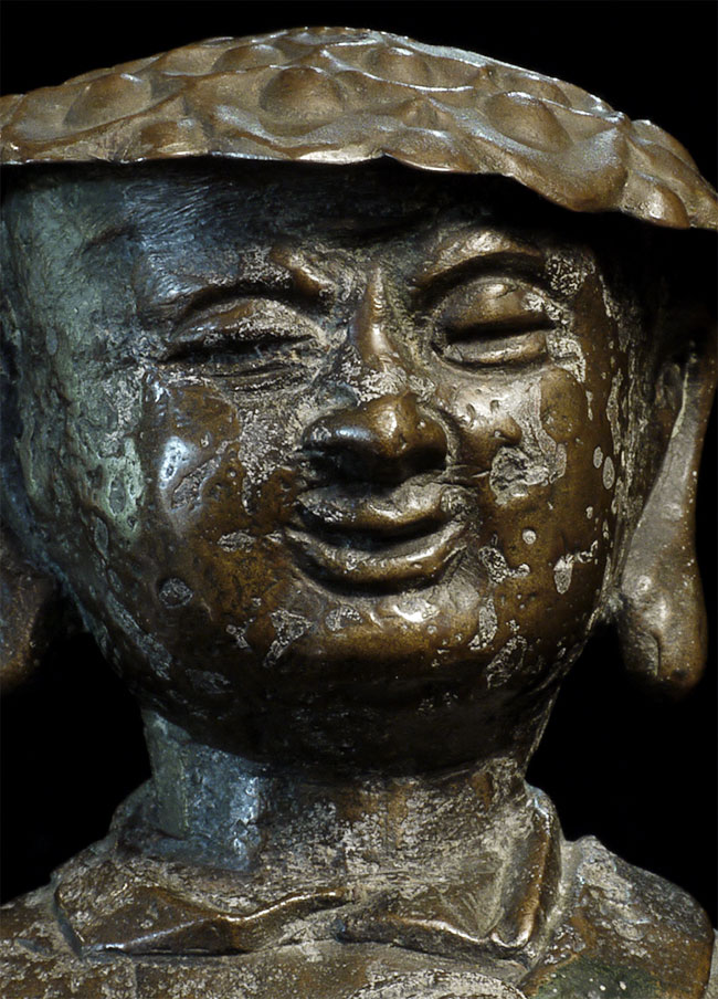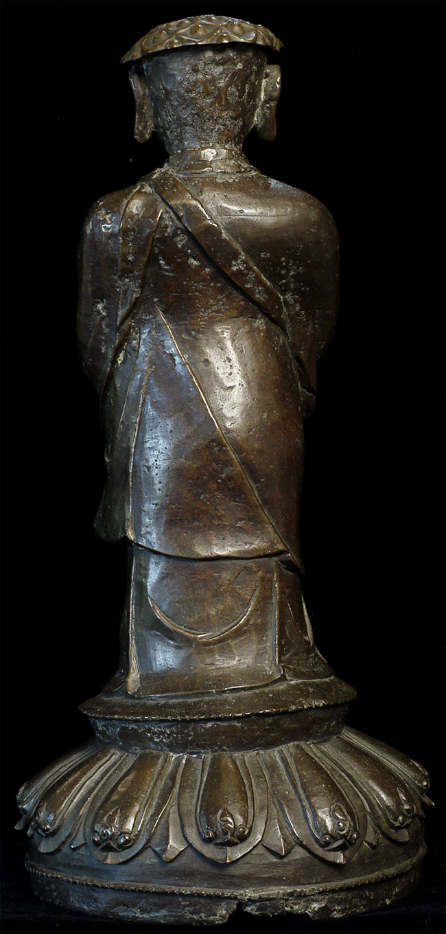 C Ming Buddhist Monk with a lovely face. Has extensive original casting flaws, as can be seen in the photos. Someone, probably after original casting, created his distinctive "hat" to cover the loss to the top part of his head. Somehow his look works. Large at 10.5" tall.