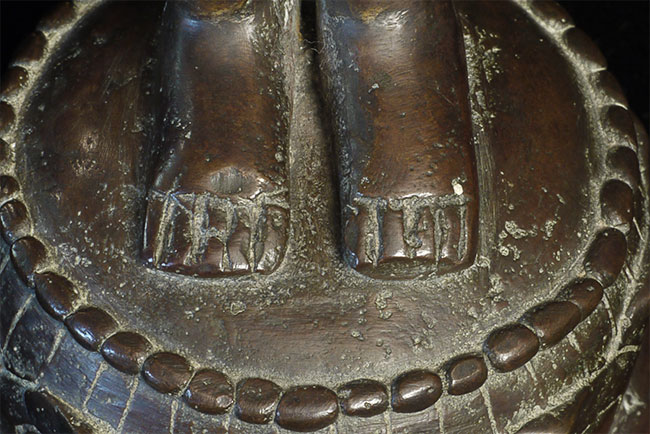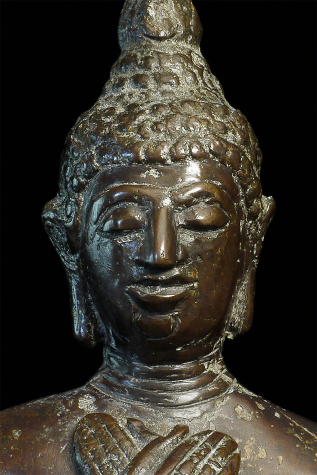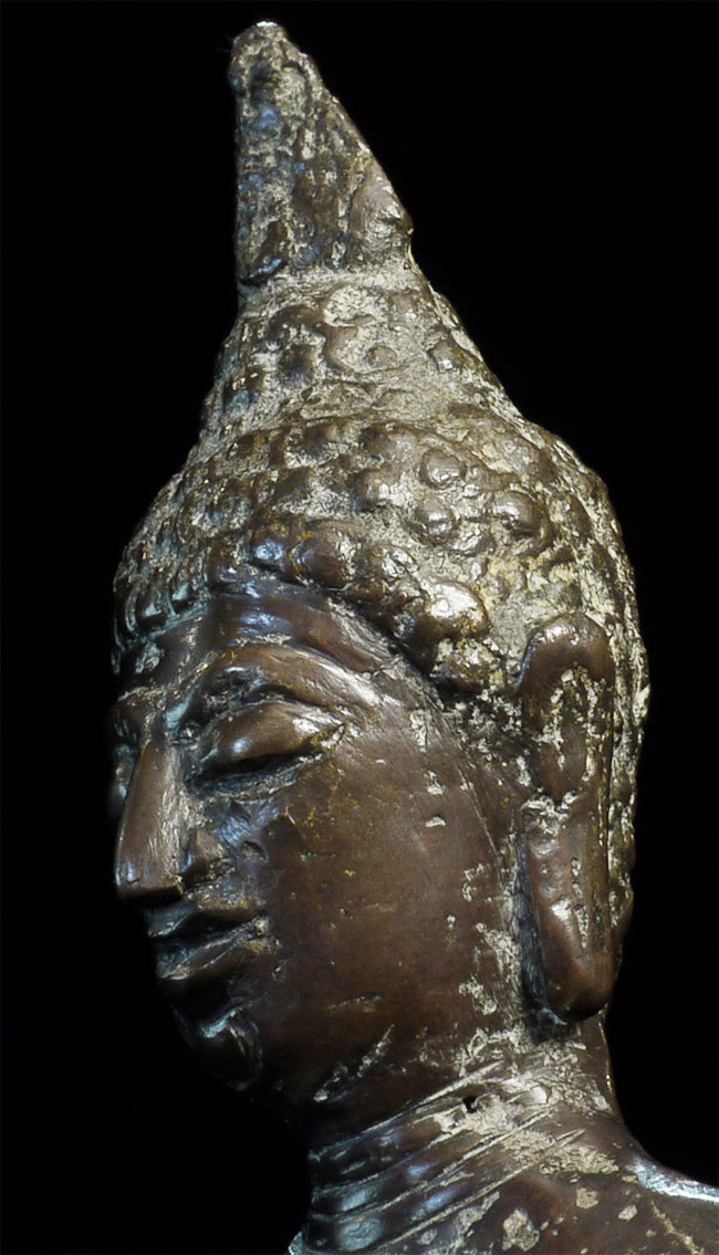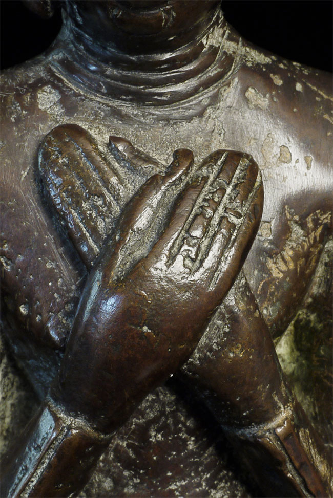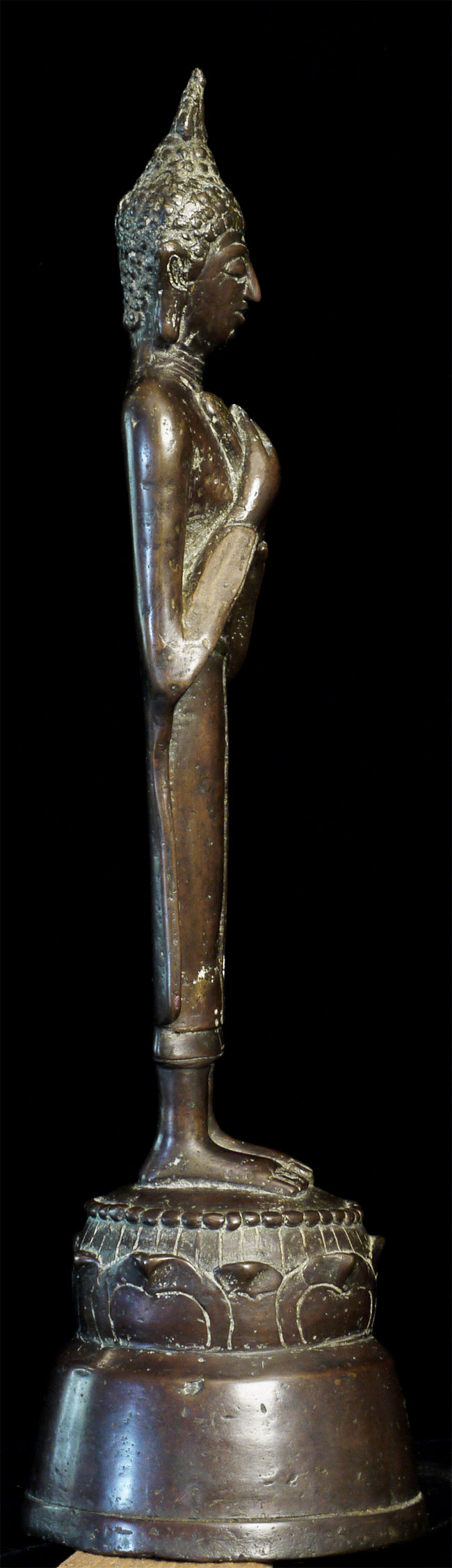 This is a nice 19thC standing Northern Thai Buddha with a wonderful mudra with his hands over his heart. He stands 10 and 1/4 inches tall including his integral base. The figure is sold cast, and is quite heavy for his size. Wonderful deep patina.