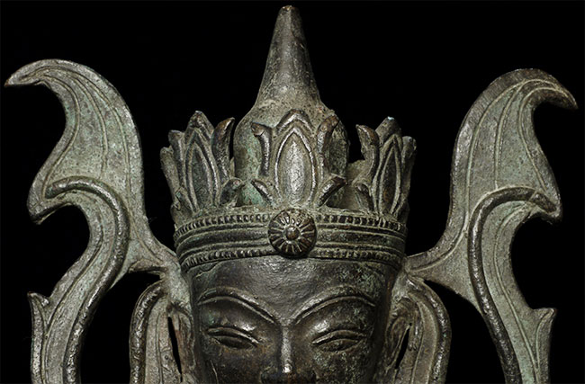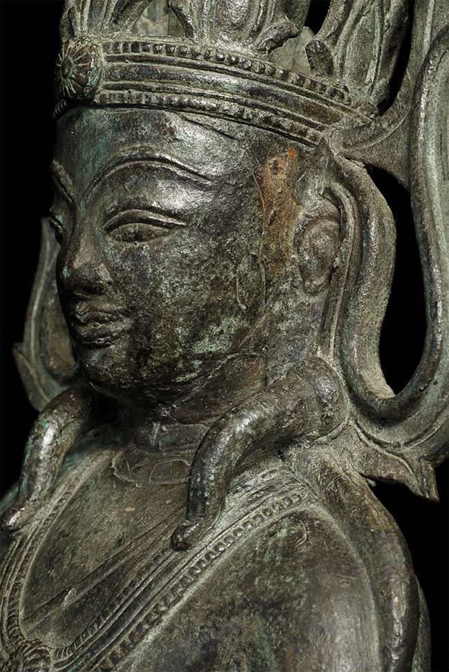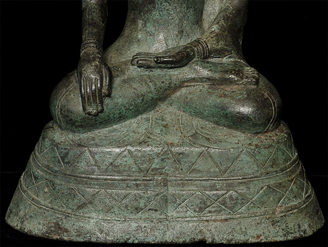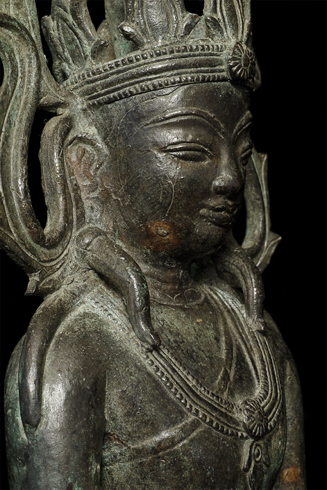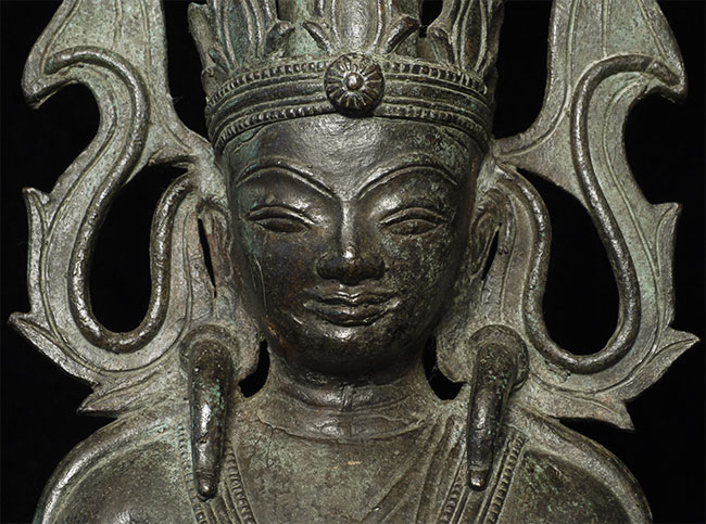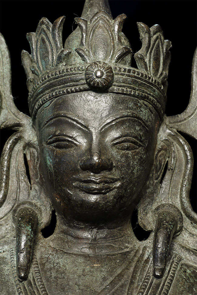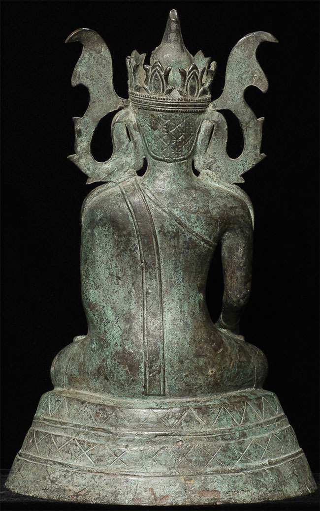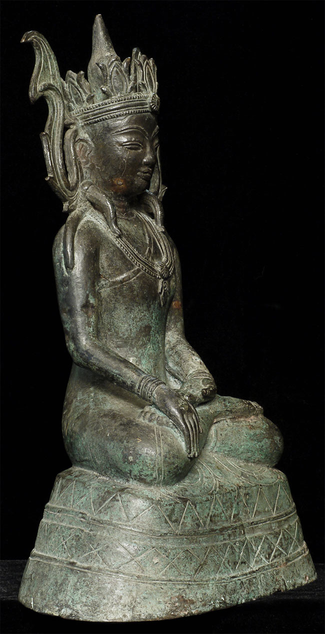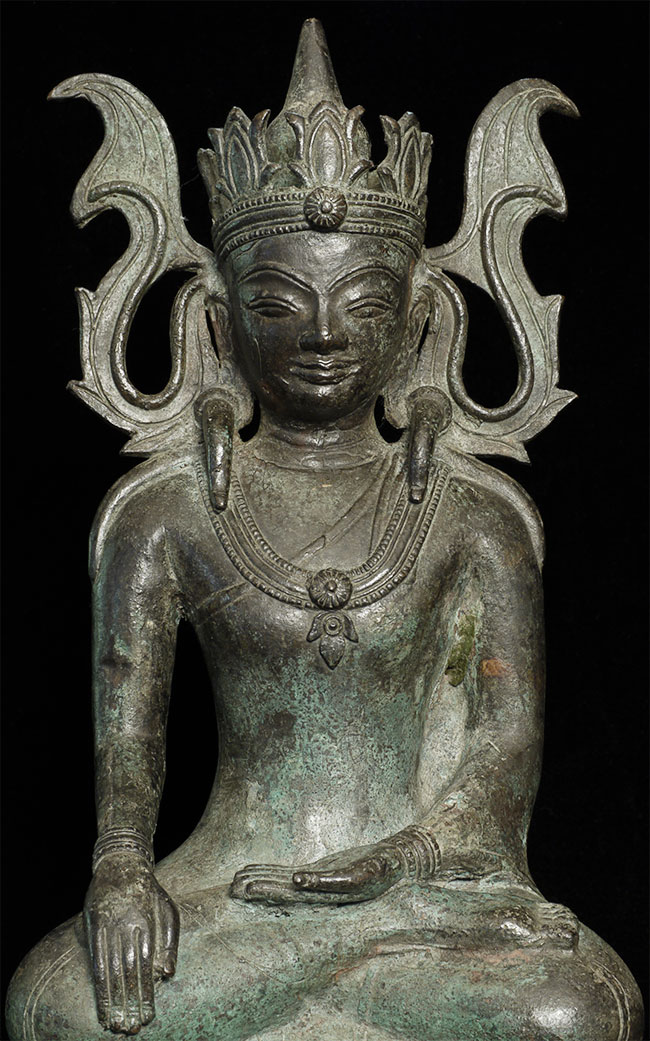 Very unusual and beautiful Arakan (or Arakan/Mon) Burmese bronze Buddha. Probably 17/18thC. The very thin casting is quite unusual- tt is possible it was cast during time and in a place where bronze was scarce. 11.5" tall