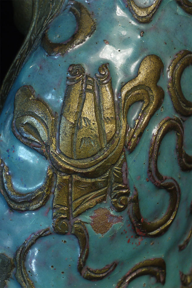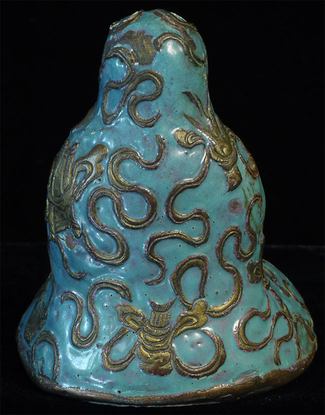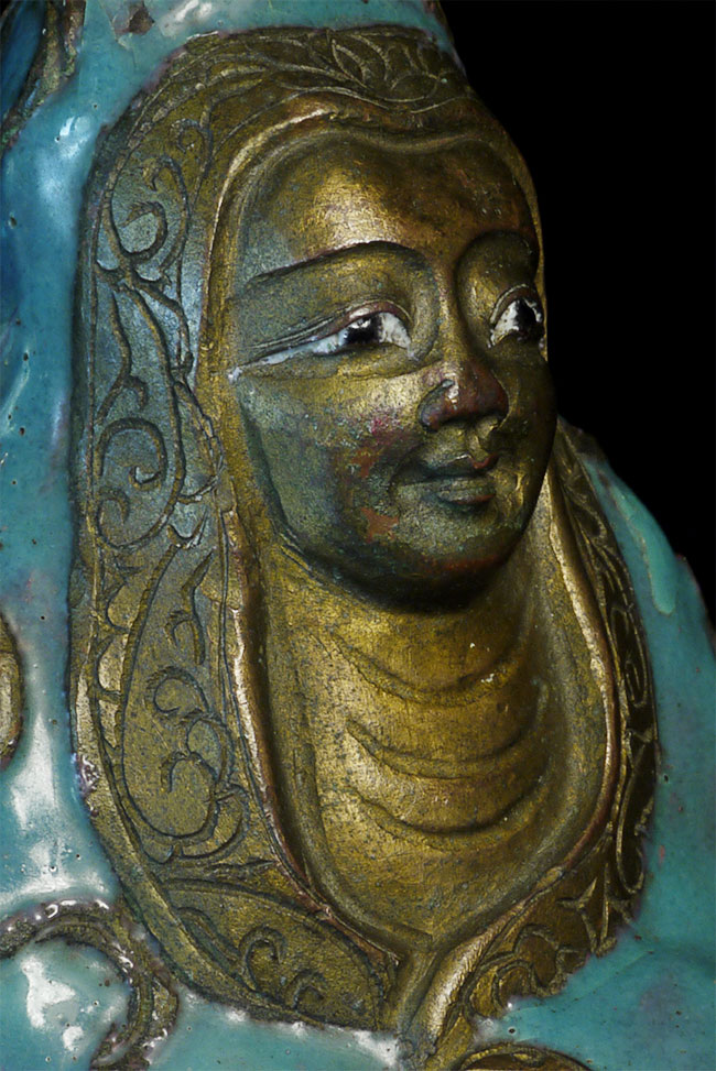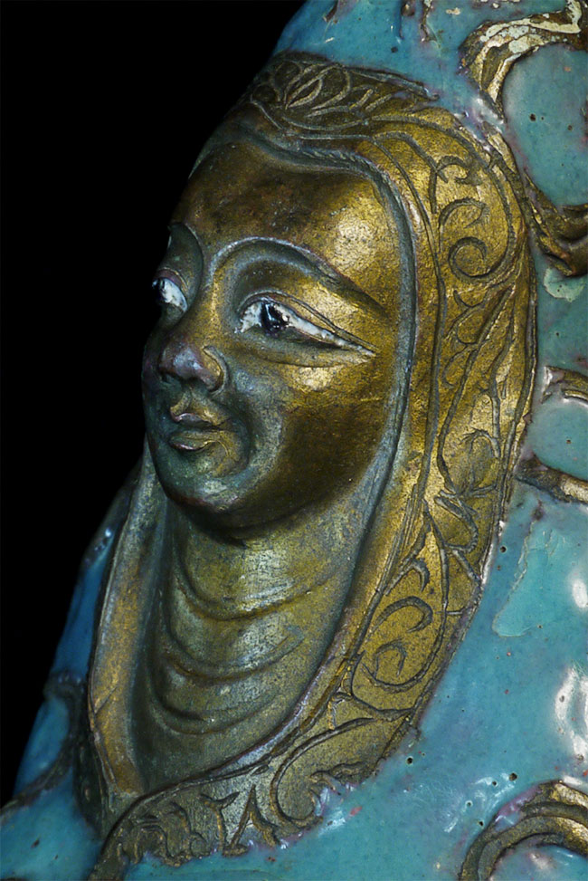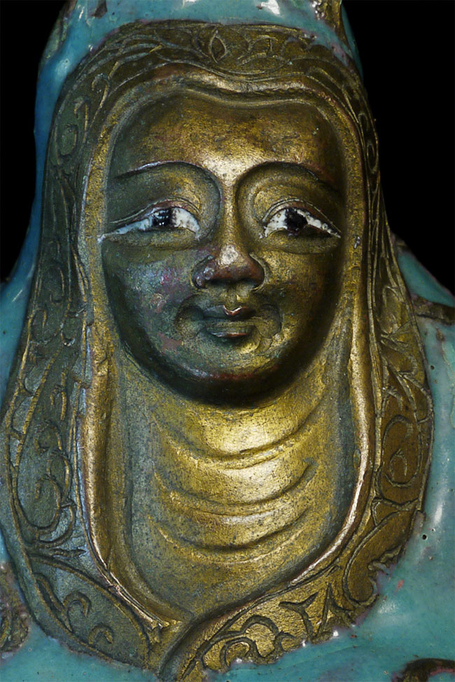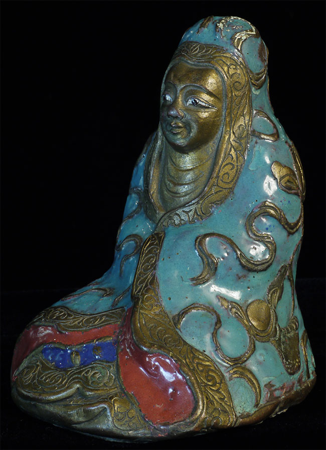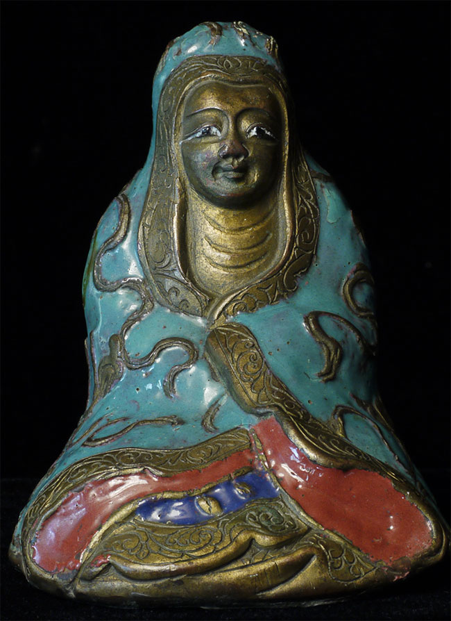 Late 18th/early 19thC Chinese copper repousse with enamel. Gentle, kind, and loving countenance. Sits 3.25" tall