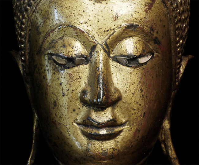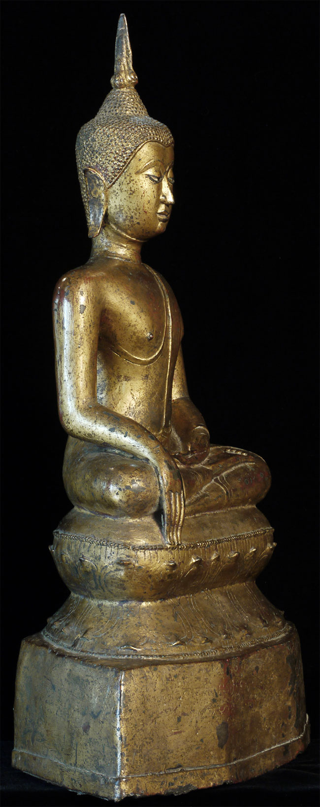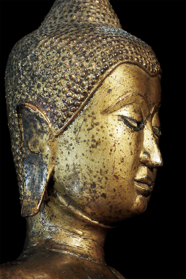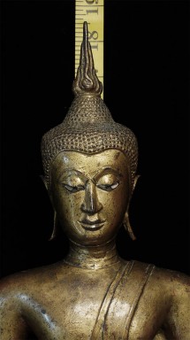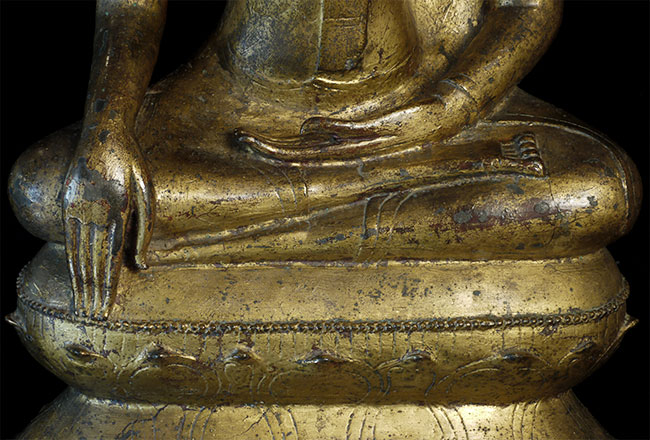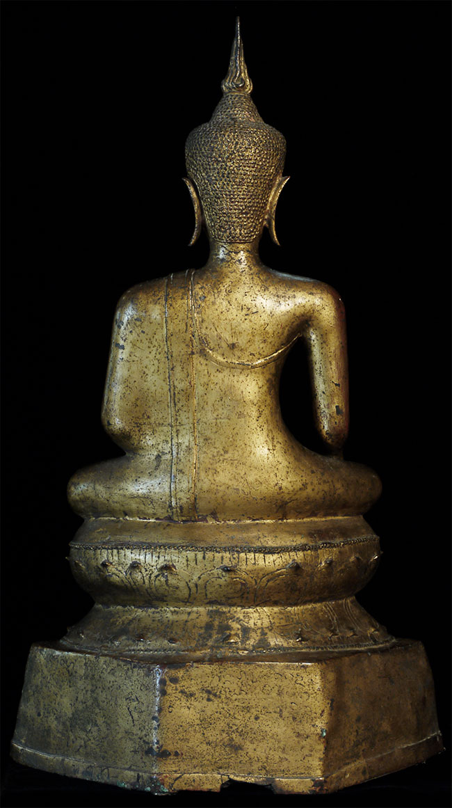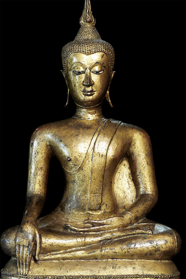 Large and refined 17thC Thai bronze Buddha. In outstanding shape. There is surface cracking at the neck as seen in the photos- it does not appear that the head was ever removed or neck repaired. It is possible the head was cast separately/. Very well cast and modelled. Hard to find this nice in this condition in this size. Sits proudly at 18.75" tall, 11.5" at bottom of base