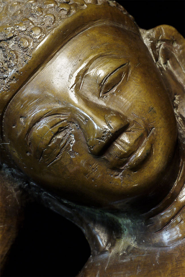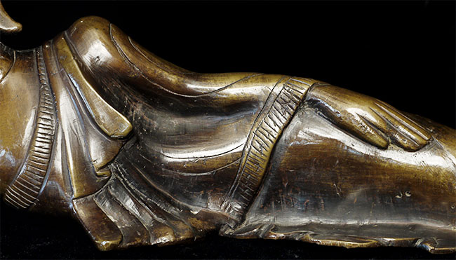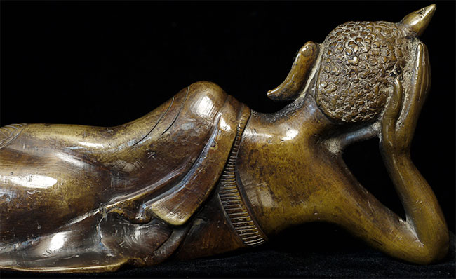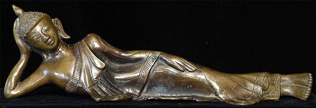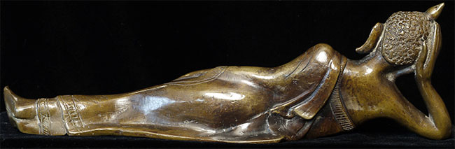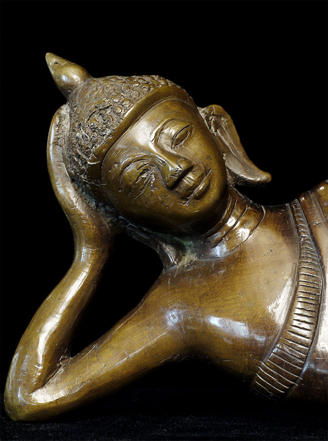 Reclining antique Burmese Buddha. Probably close to 100 years old. Lays 12.5" long, 4" tall
