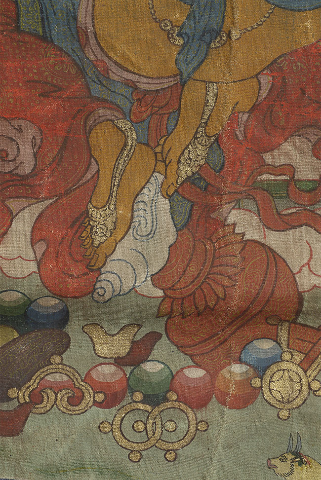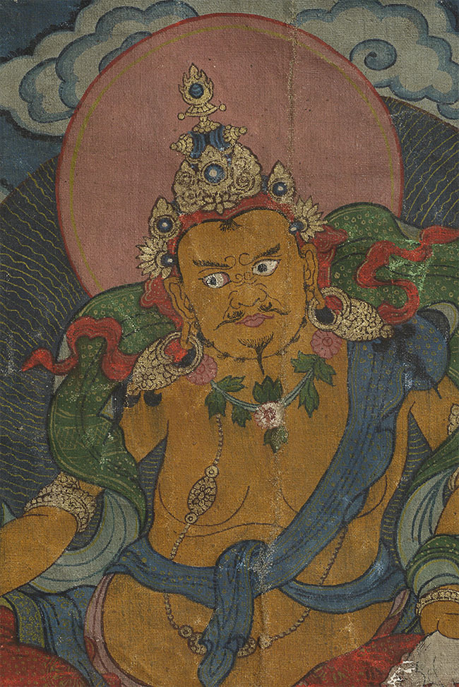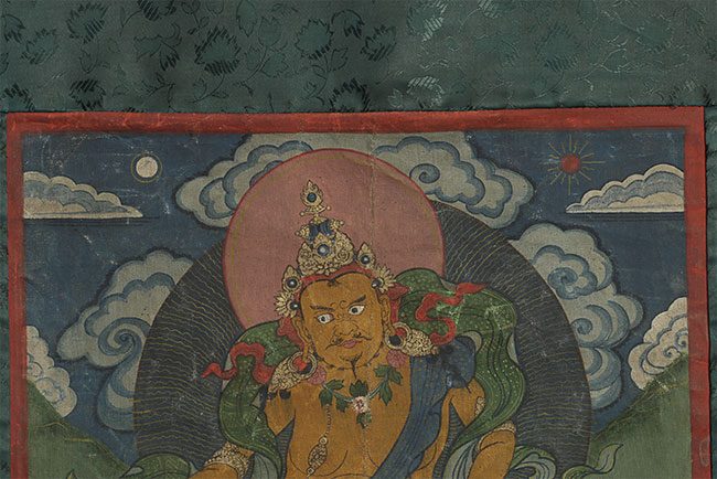 Antique Mongolian Thangka depicting Jambala or Kubera. Painting measures 13" x 16". Including cloth frame measures 19" x 32". Very fine example of its type.