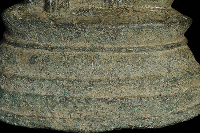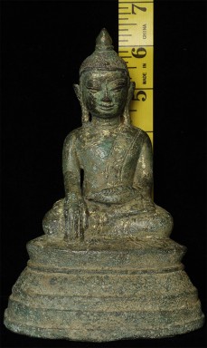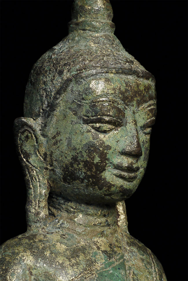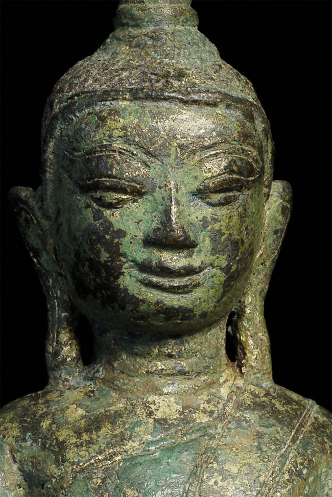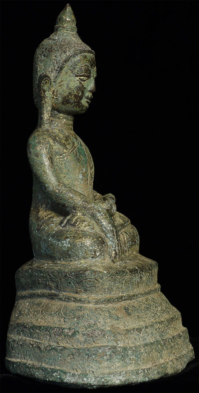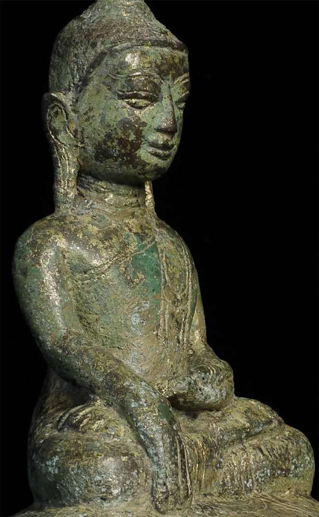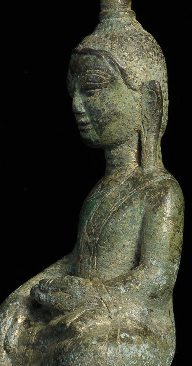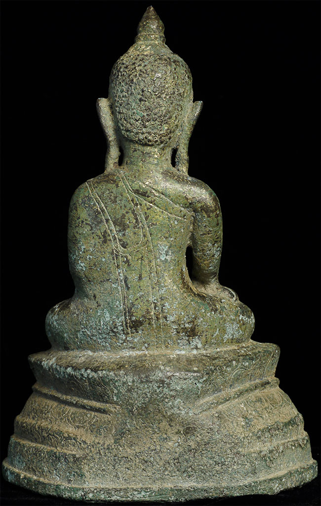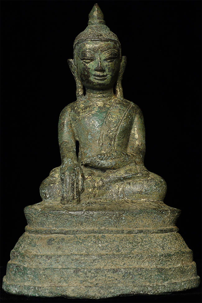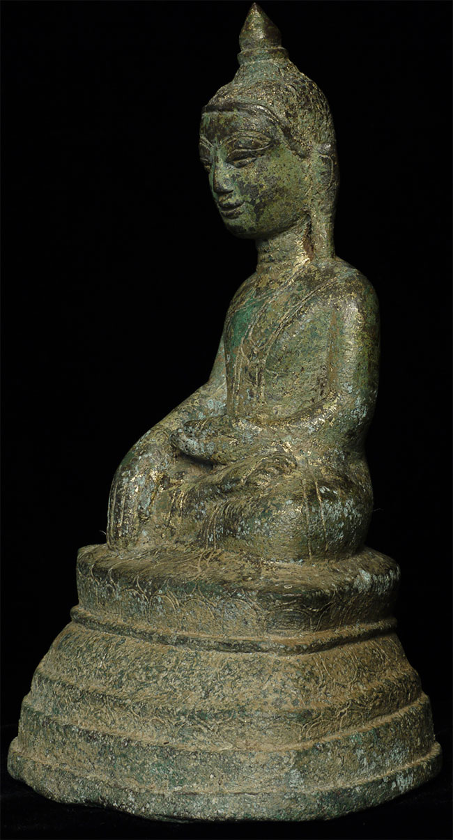 Deeply serene 17/18thC Burmese bronze Buddha in a Mon style. Sits 6.5" tall. Beautiful complex patina with some original gilding.