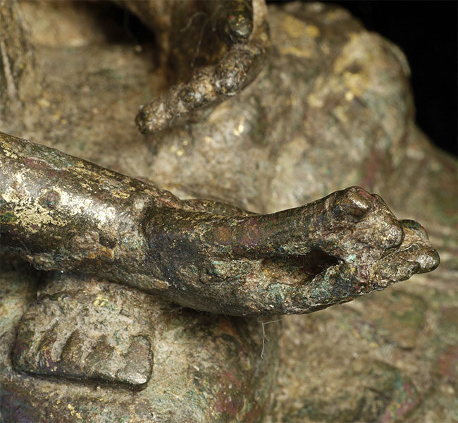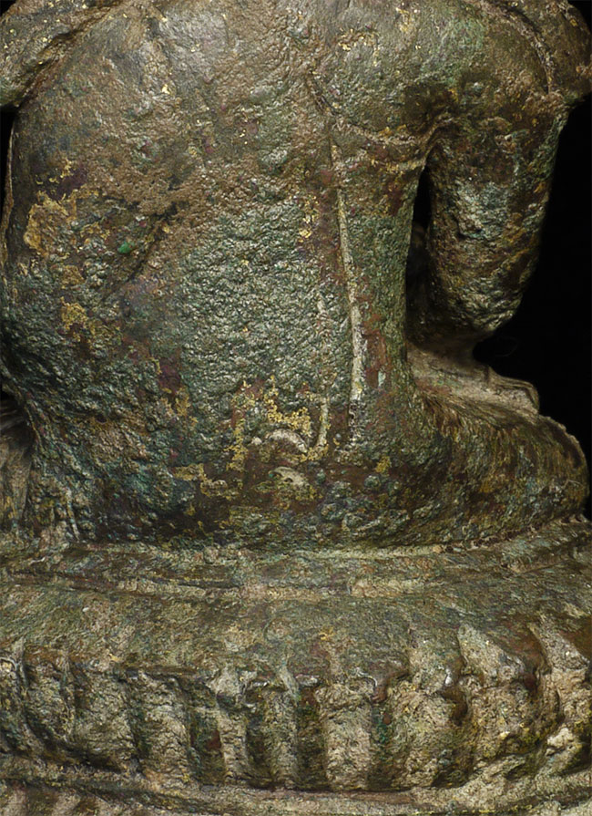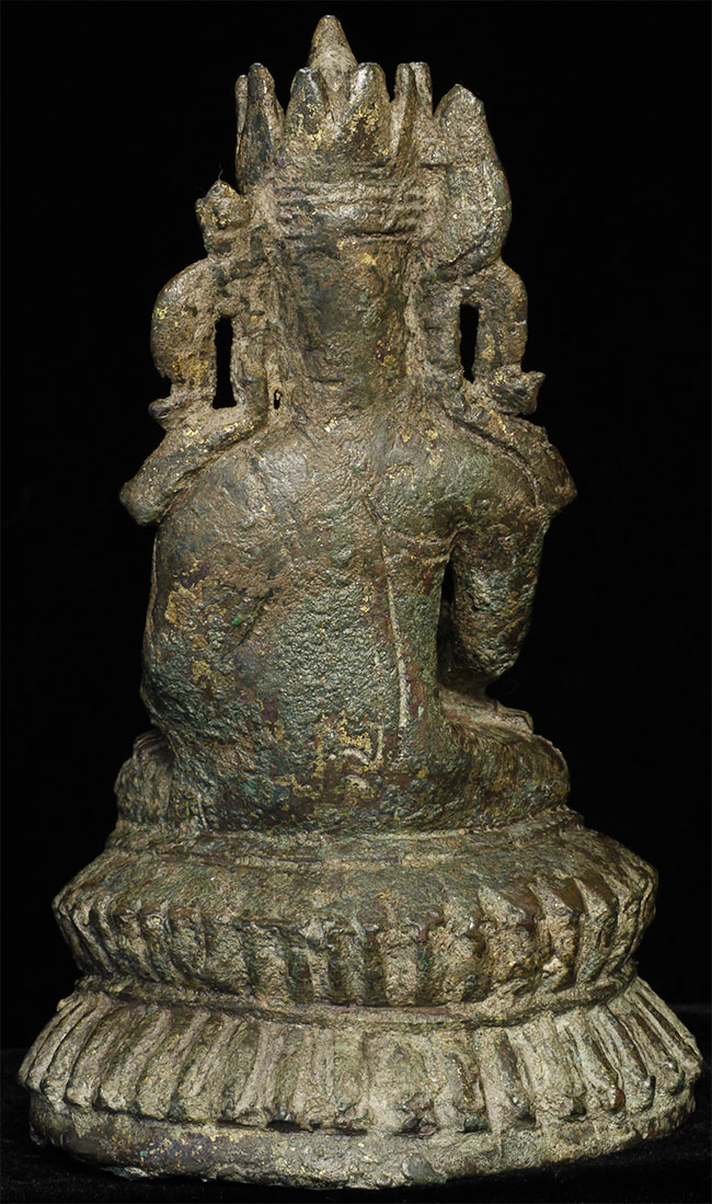 The Buddha sits in meditation, the hands arranged in a traditional gesture, while the tall, tiered crown and flame-like finial rise prominently above the head, adding rarity and presence to the piece. The surface retains traces of its ancient patina, intermingled with subtle remnants of earlier gilding, giving the figure a compelling, time-worn beauty.
