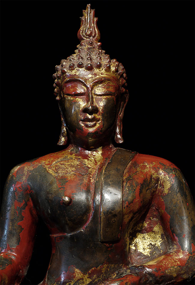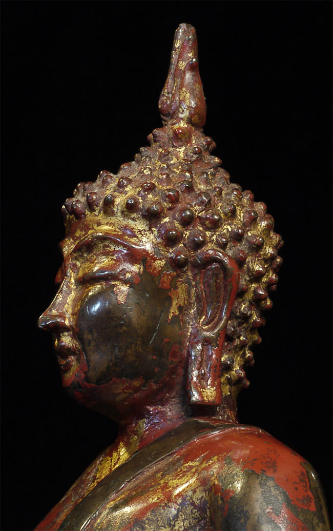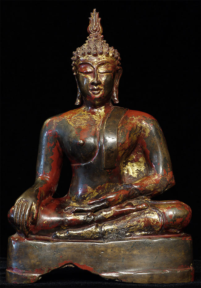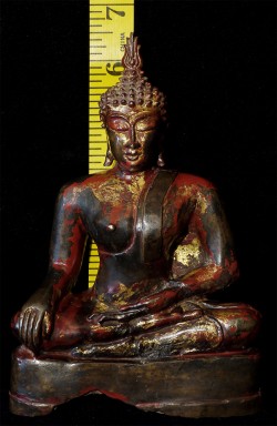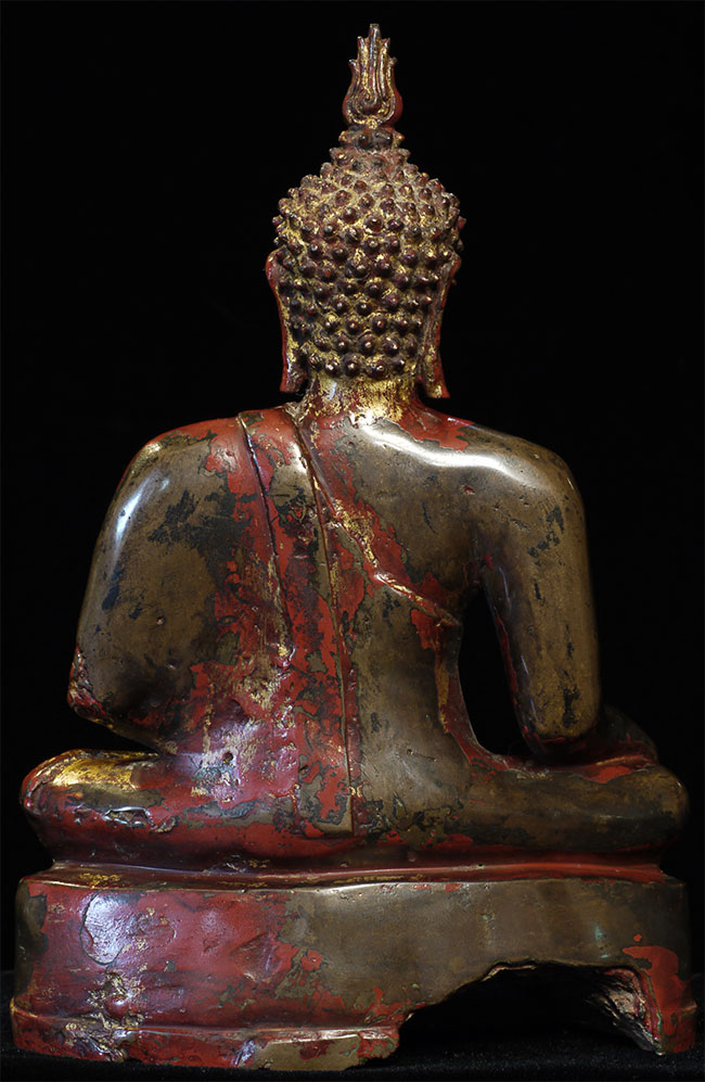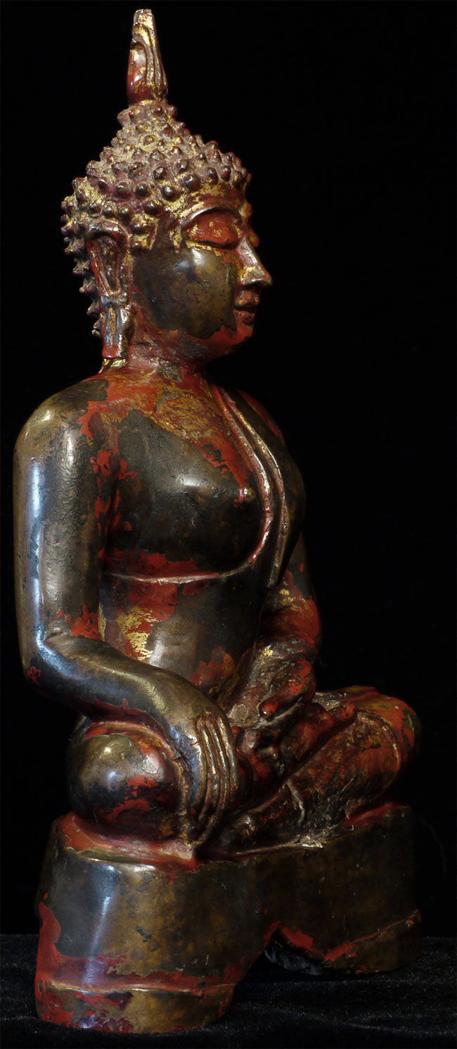 Extremely unusual and wonderful 15thC late Sukothai or Kamphenphet style Buddha from Thailand. This type is far more masculine than the earlier Sukothai type. Sits 6.75" tall, and extremely heavy for its size. Special type of alloy with precious metal in it. Personal favorite!