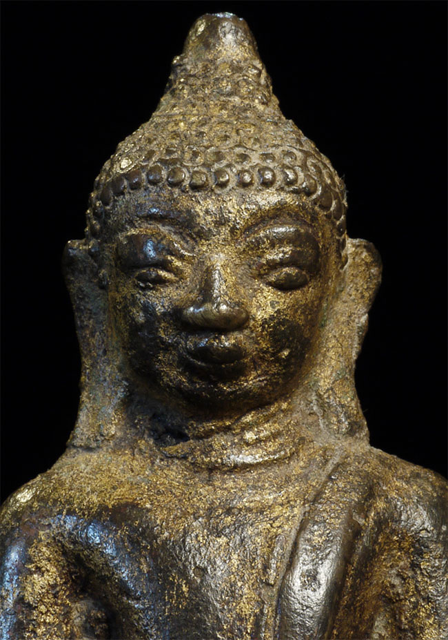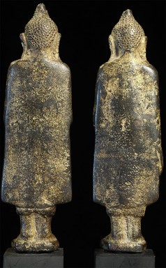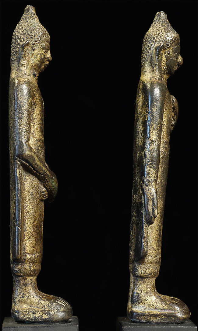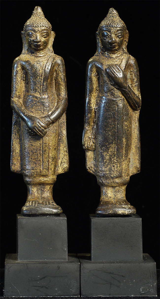Wonderful pair of standing solid-cast Burmese Mon style Buddhas, each with a different Mudra. At least 17thC and possibly earlier. I've never seen another pair like them., Including the attached bases, stand 5 7/8" tall