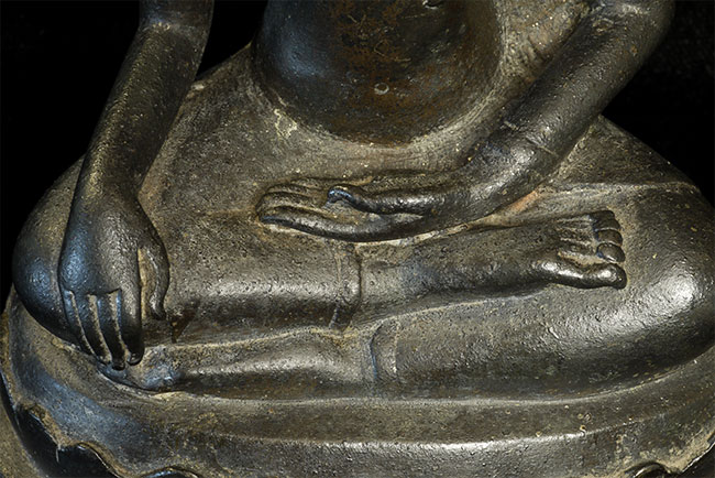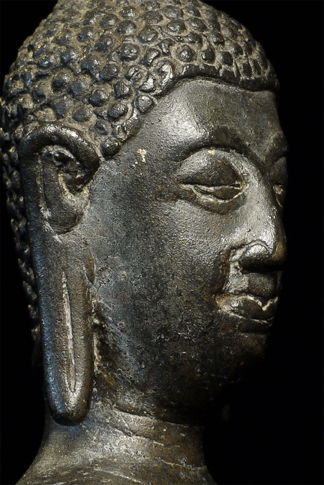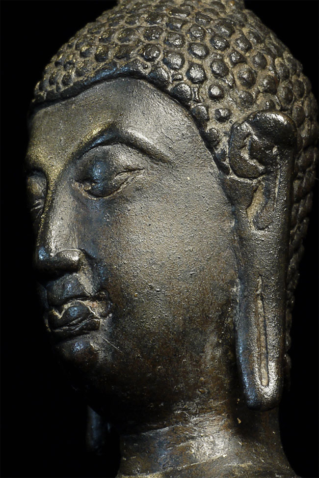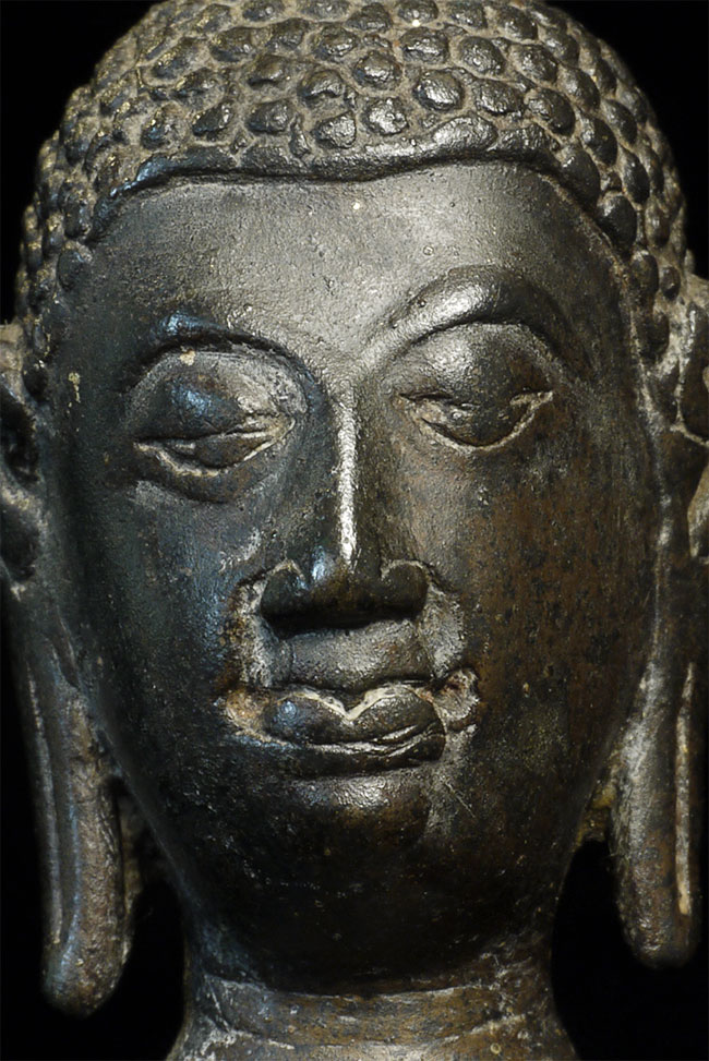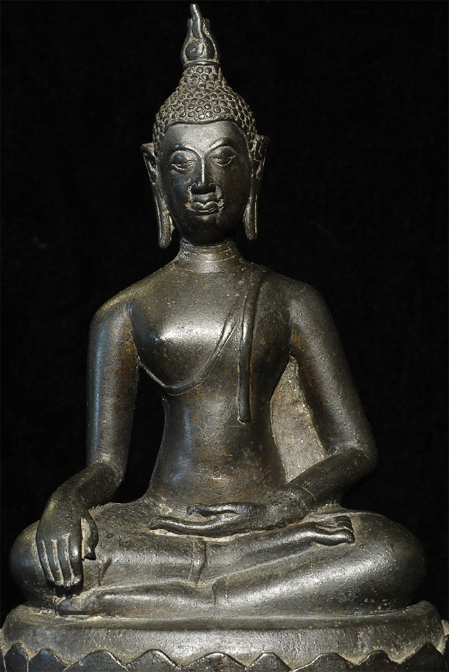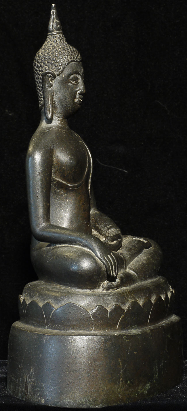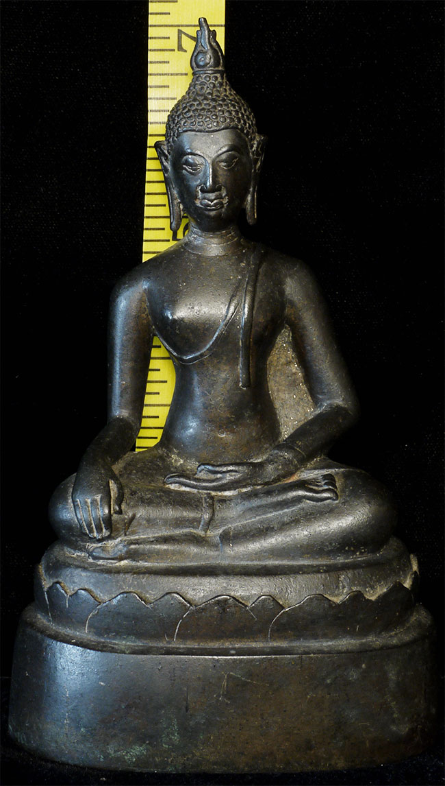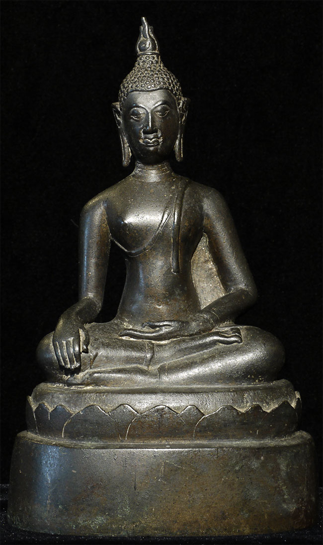 Uncommon and very interesting 15thC Sukothai bronze Buddha. This fellow has a wonderful overall composition- his shape flows organically from the tip of his finial down through his shoulders, elbows, and knees, all the way down through the base. The base is extremely uncommon, perhaps unique. Excellent face, fine casting, and extremely good almost black patina. Appear to be remains of gilding and traces of red lacquer. 7" tall.