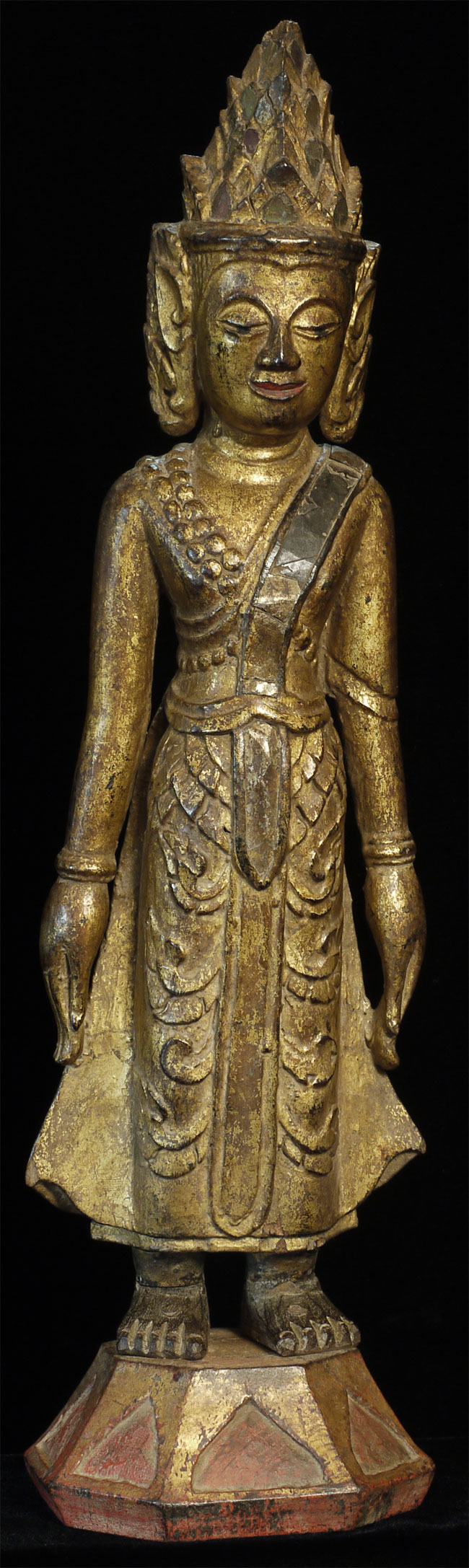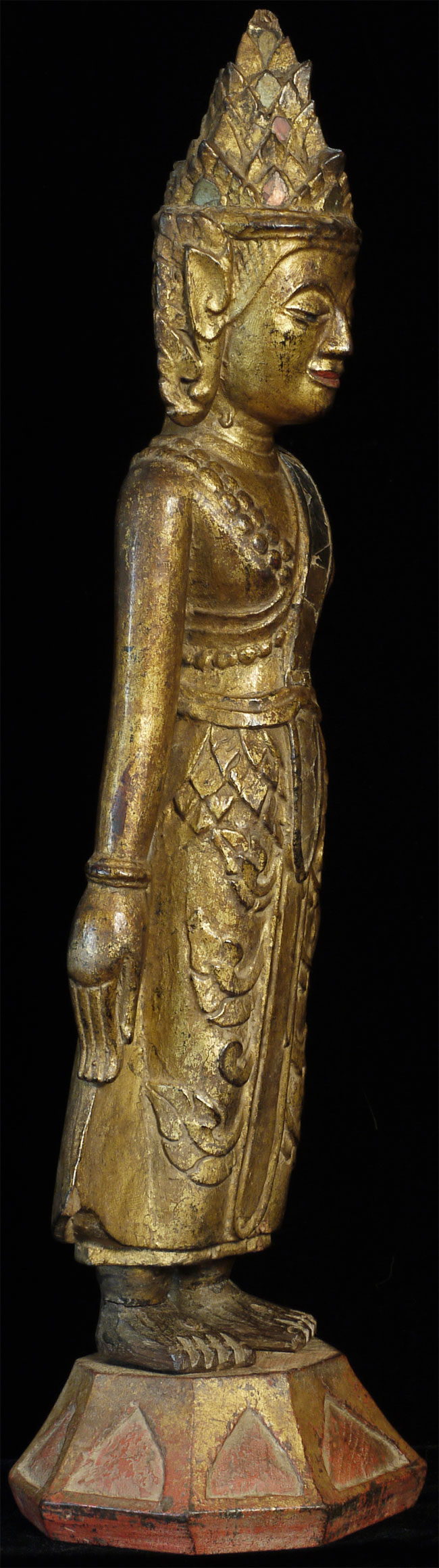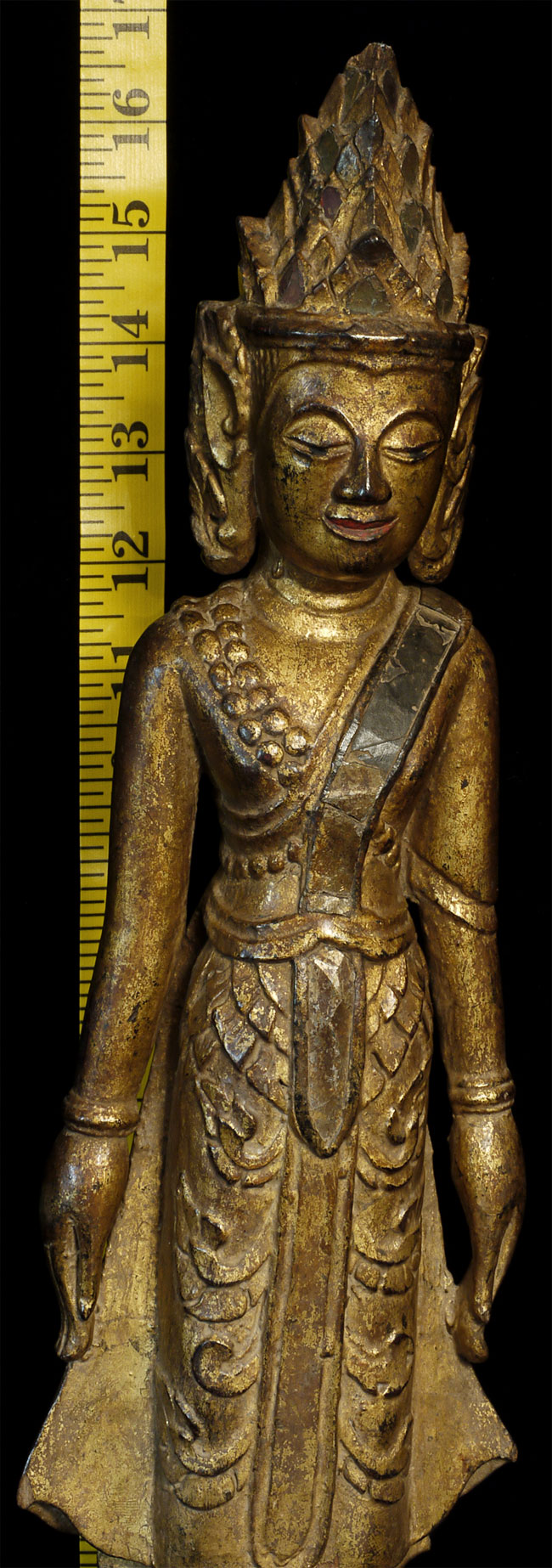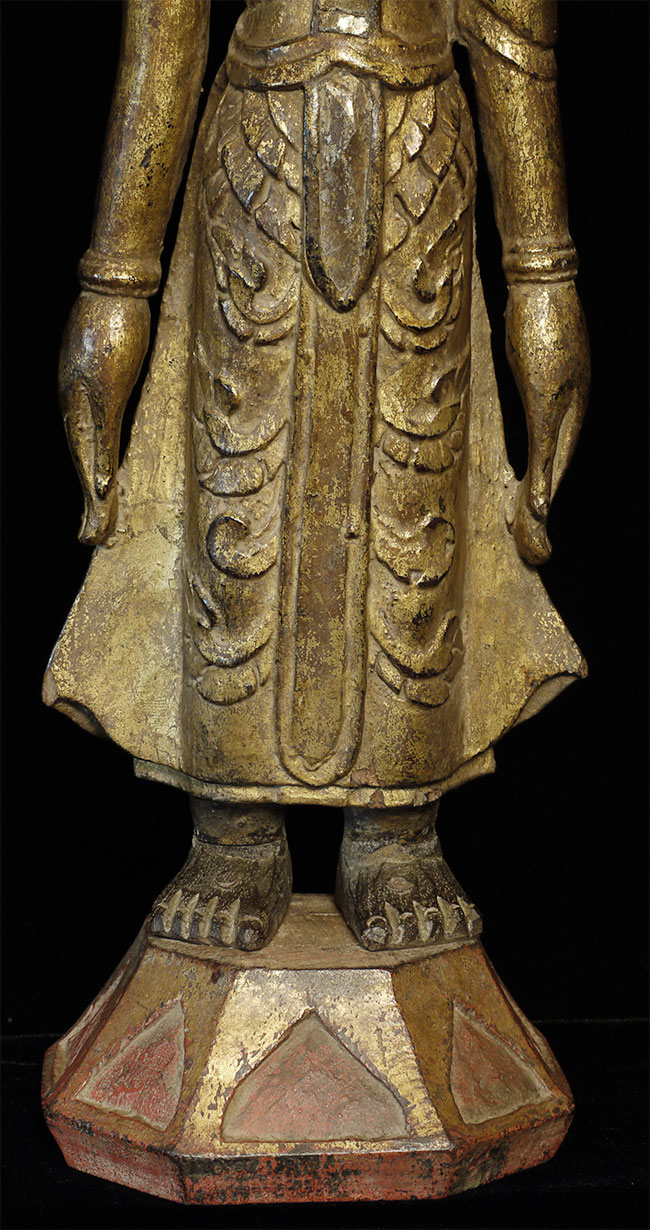 Delightful antique standing Arakan Buddha. Minor loss and possibly reattached to the base, but overall outstanding in every way. Stands 16.75" tall