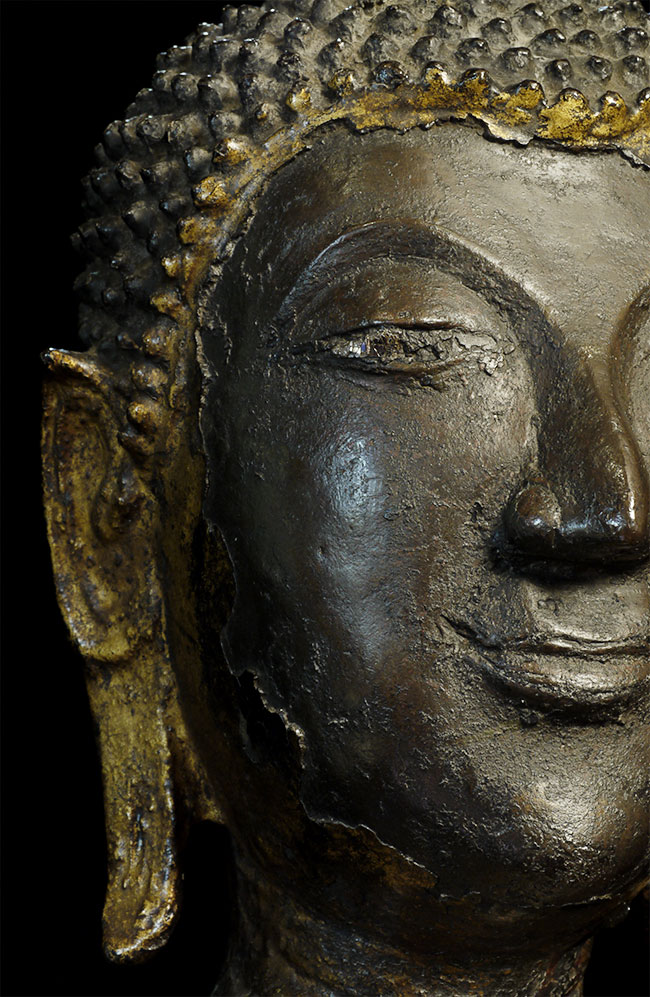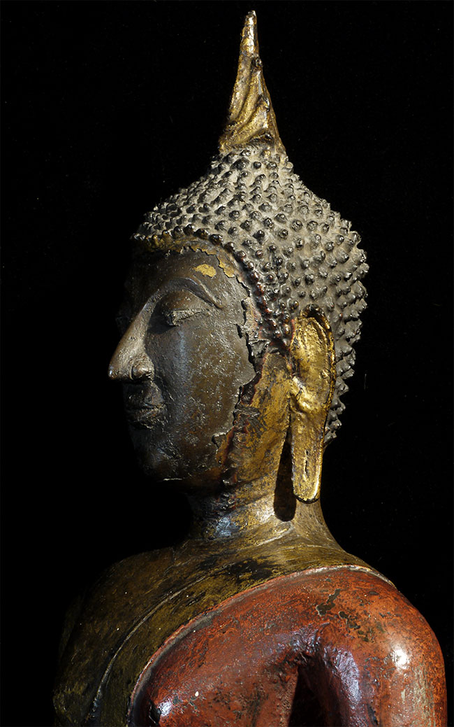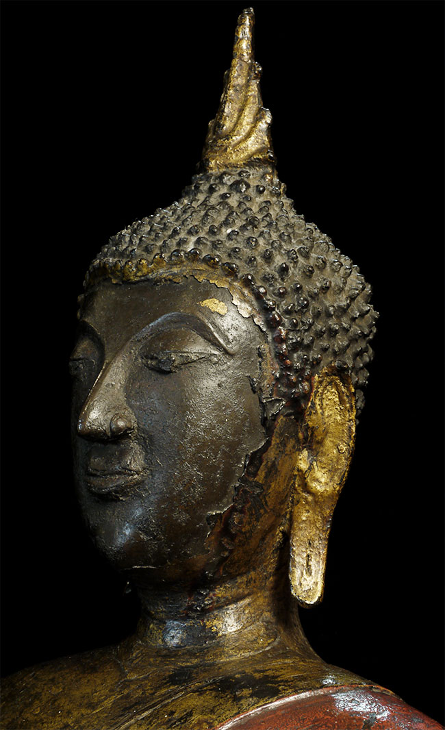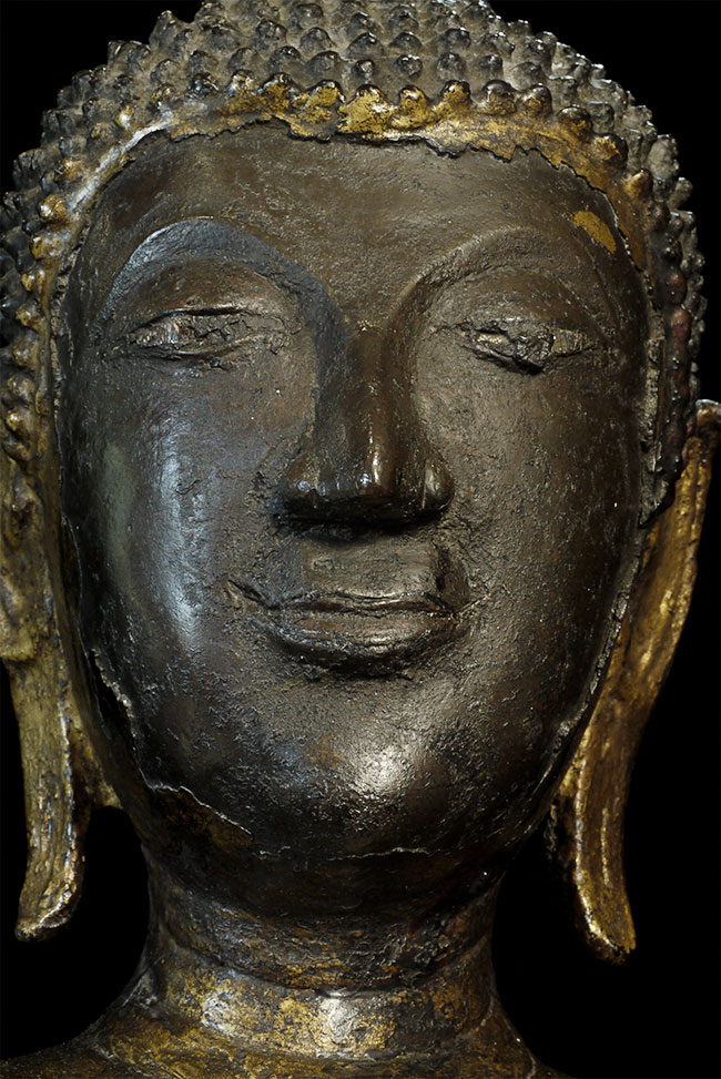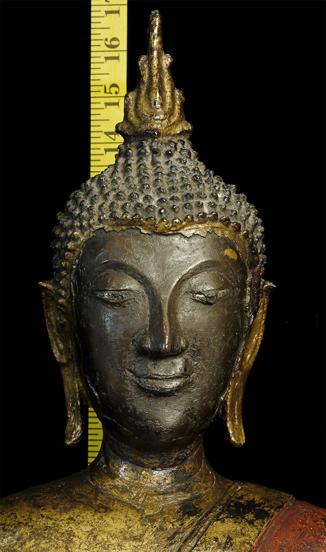 Magnificent 19th century Northern Sukothai Thai Buddha. Large and heavy at 16.75" tall. Rare type-sensitivly modeled face, well cast, and in outstanding condition. 15" at widest point of base. Oxford TL test verifying dating will be included. Far higher quality in both sculpting and casting than the vast majority of 19th Thai bronze Buddha images on the market. A personal favorite.