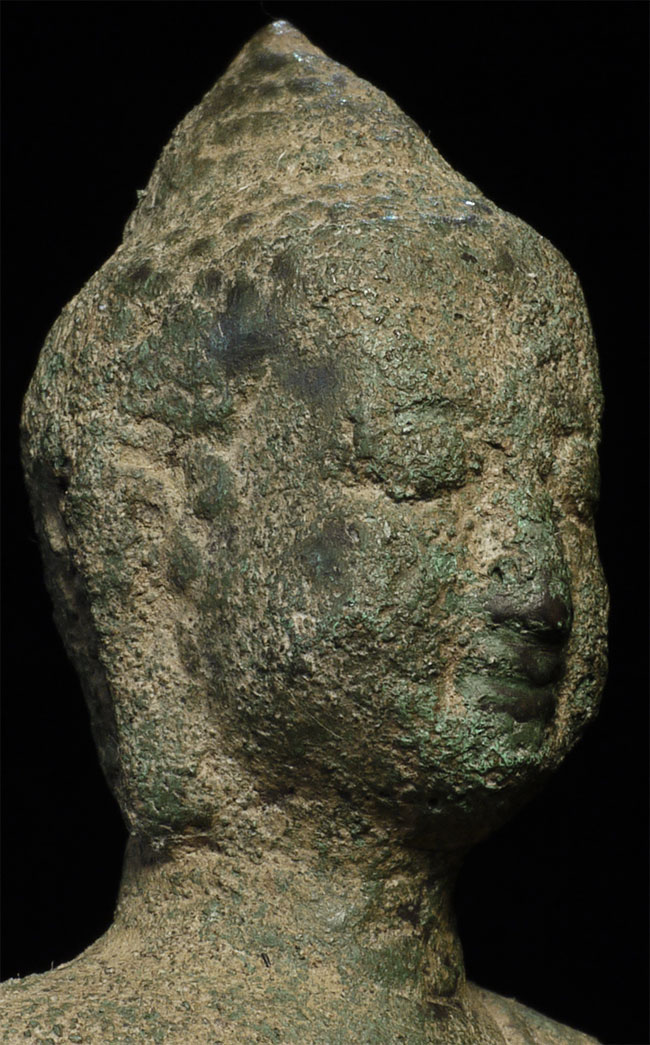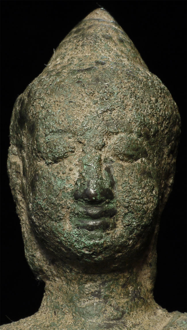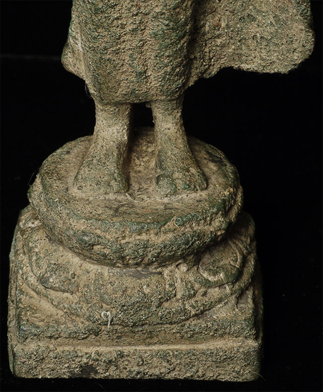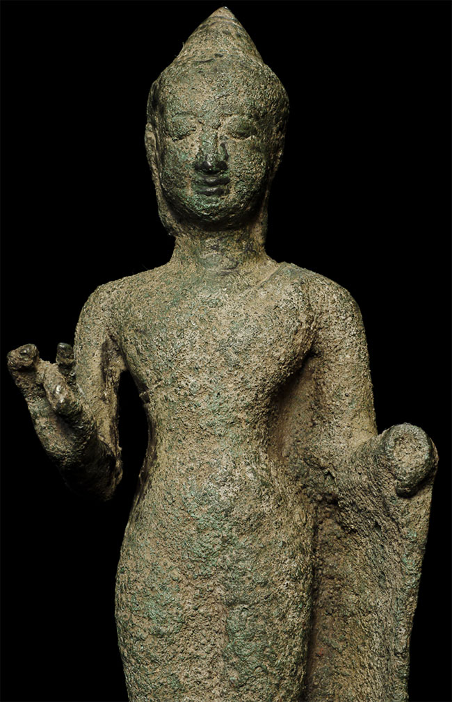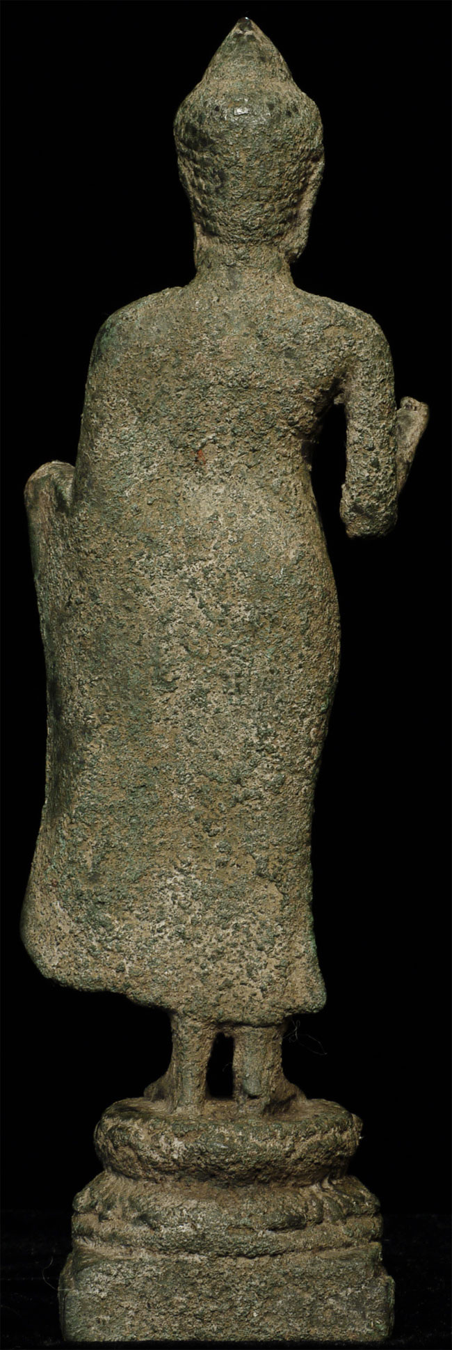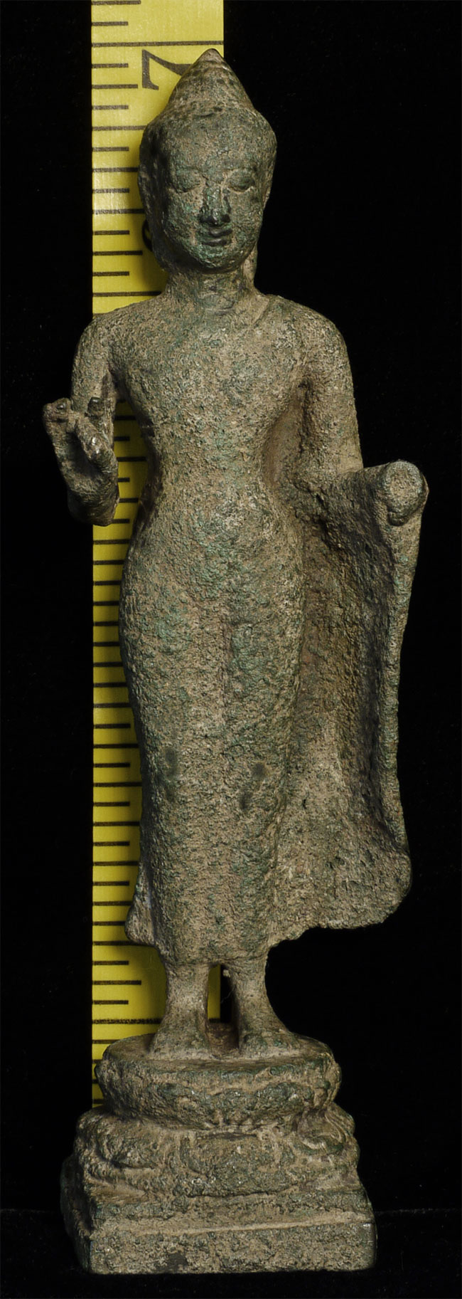 Well cast Indonesian standing bronze Buddha. Probably 14th Century or earlier- may be a later emulation. Wonderful face and sensuous flowing body. Loss of one hand which appears to have been separately cast. Otherwise in very good condition. 7" tall.
