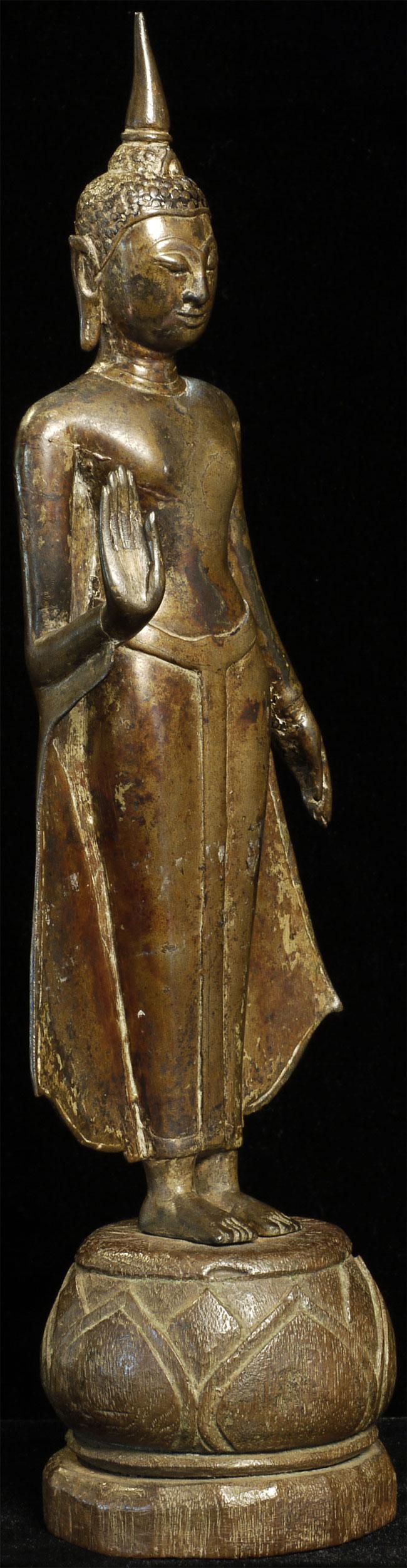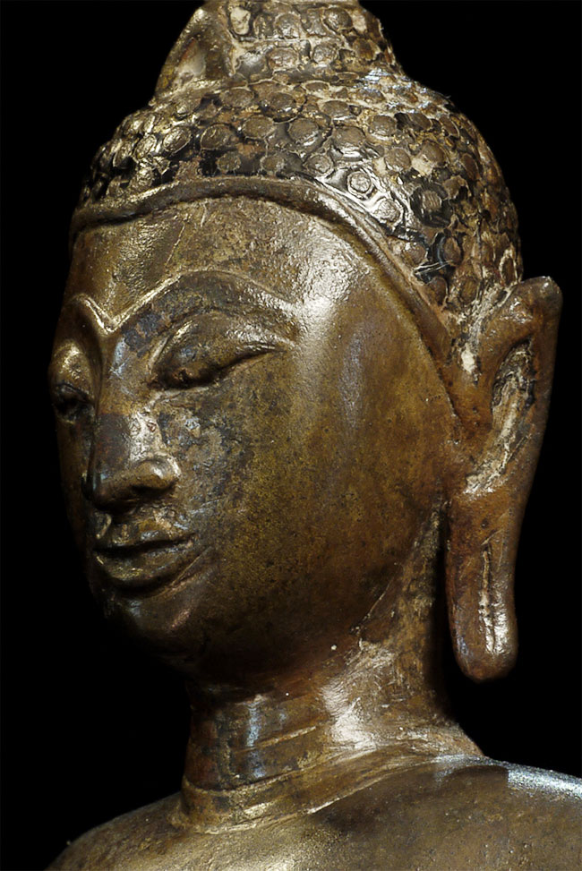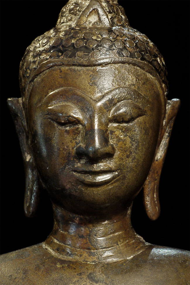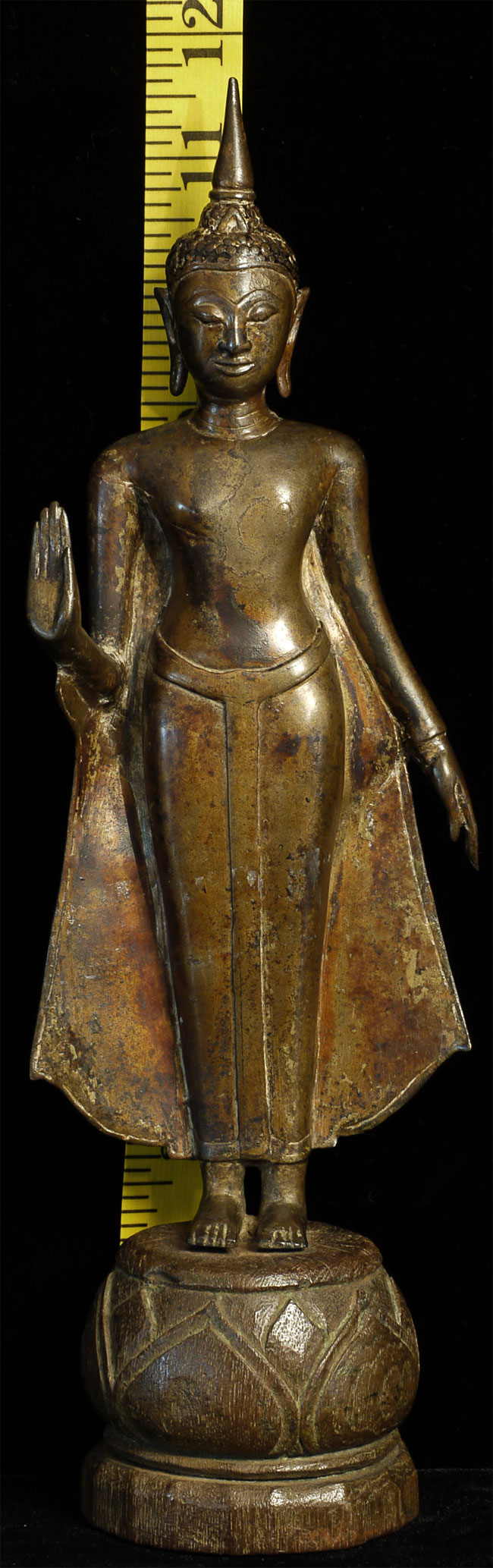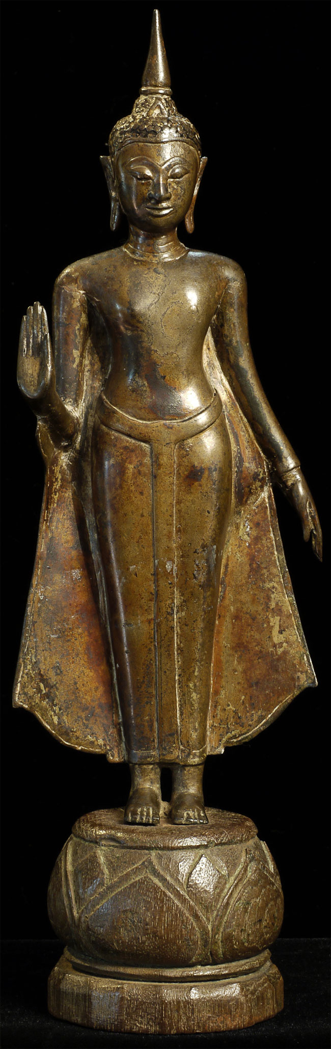 Superb 16thC Thai bronze Buddha. Fine example of its type. Stands 11.75" tall on attached wooden base, 9 inches tall on its own. No damage or repair. Someis original casting flaws.