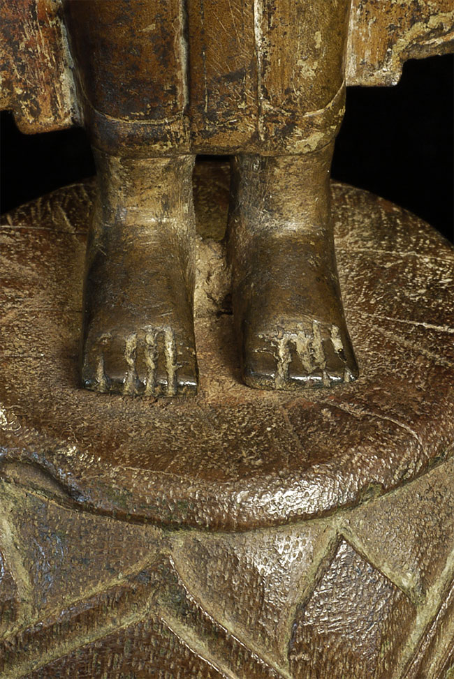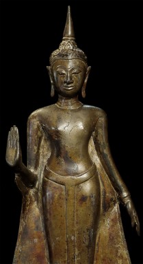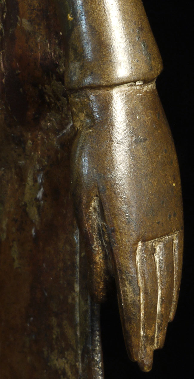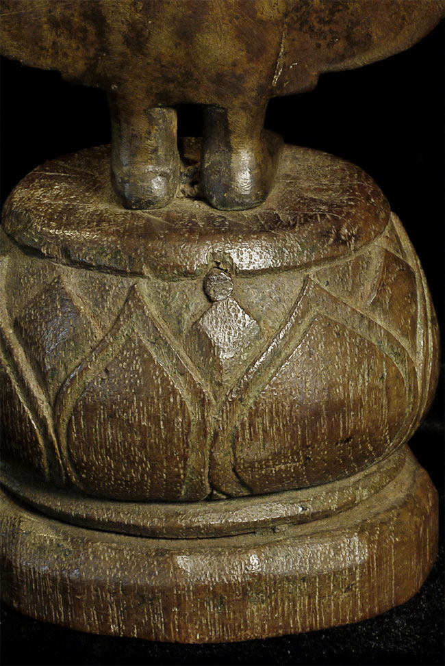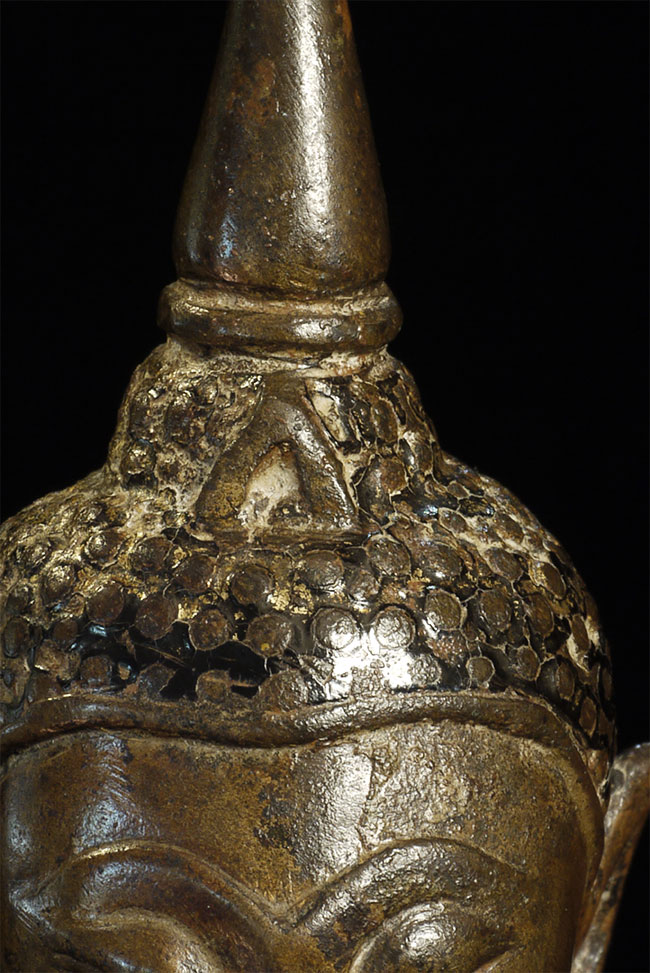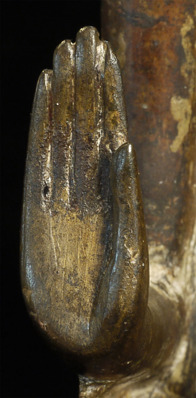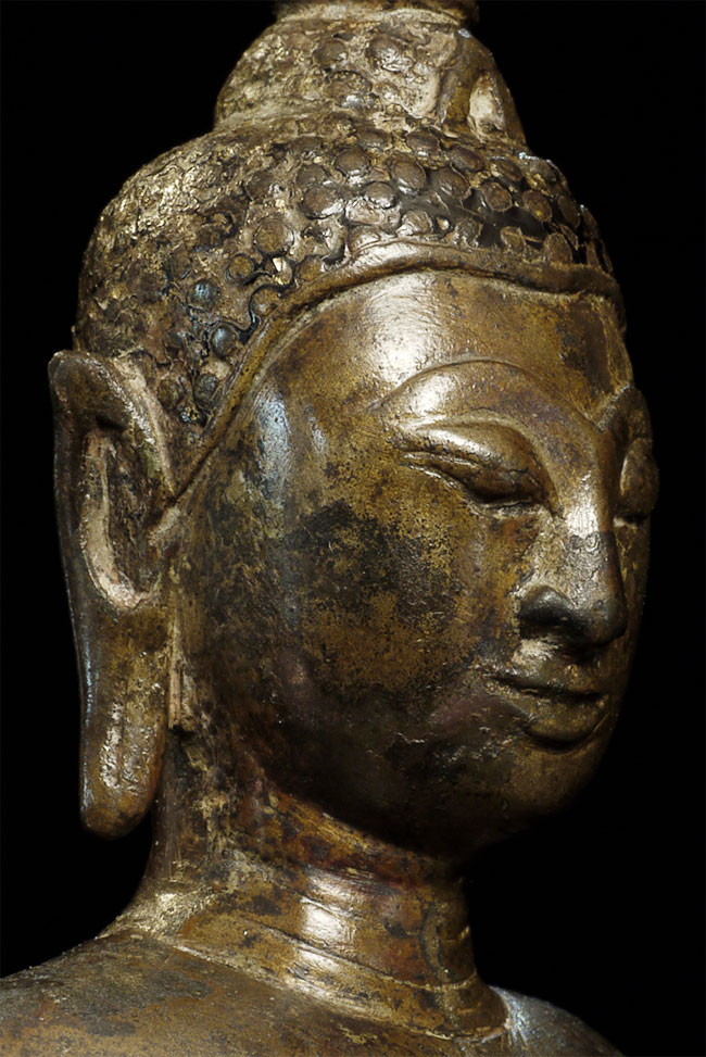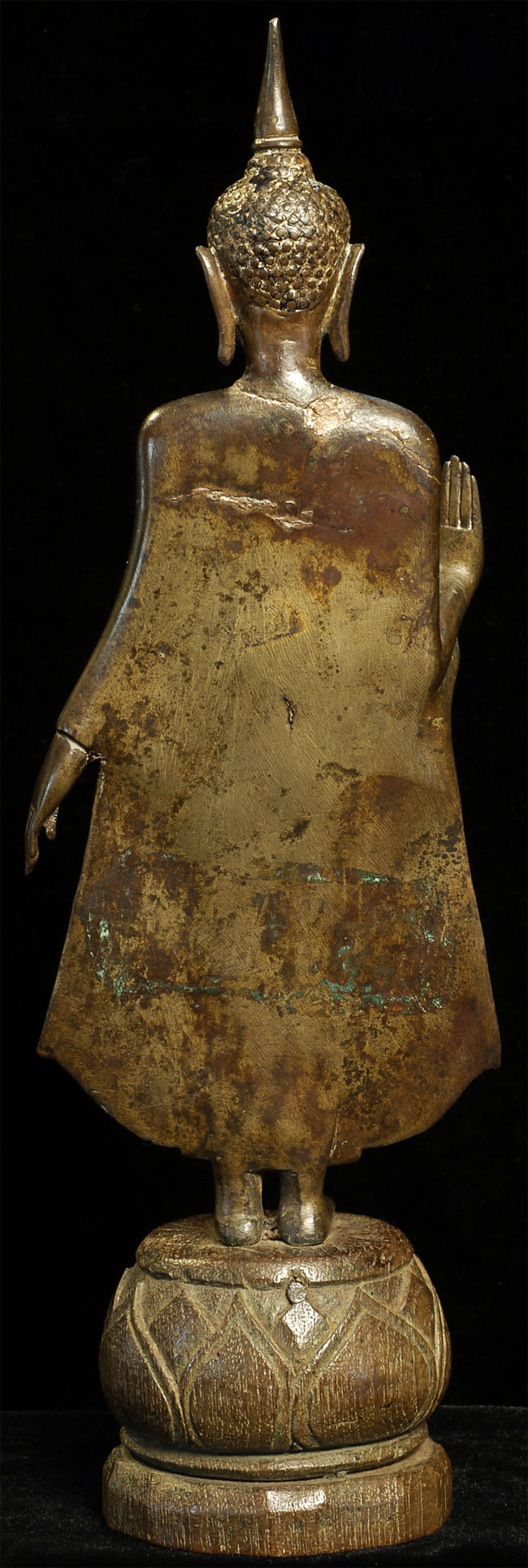 Superb 16thC Thai bronze Buddha. Fine example of its type. Stands 11.75" tall on attached wooden base, 9 inches tall on its own. No damage or repair. Someis original casting flaws.