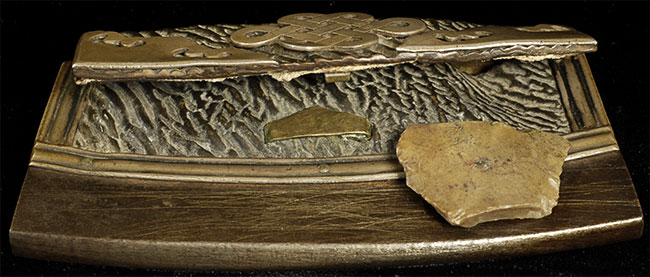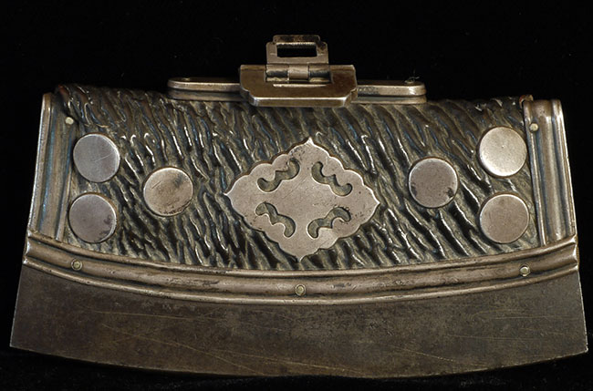Fine antique tibetan leather flint pouch and flint. Silver ornamentation and hardware. Clasp is loose- otherwise superb.2 inches tall, 4 inches wide