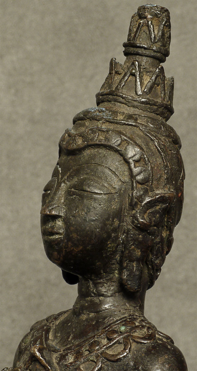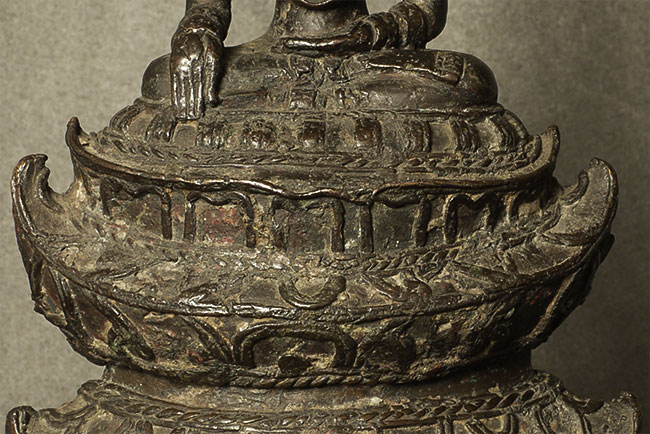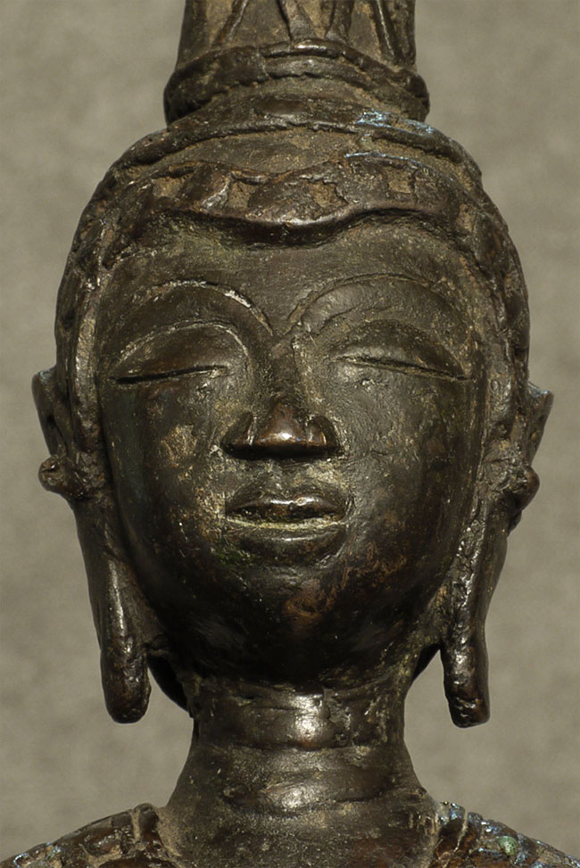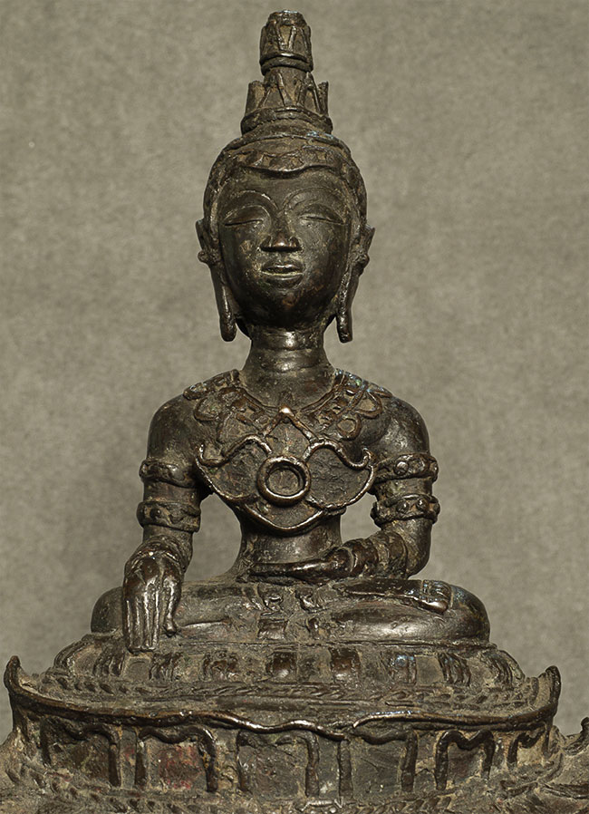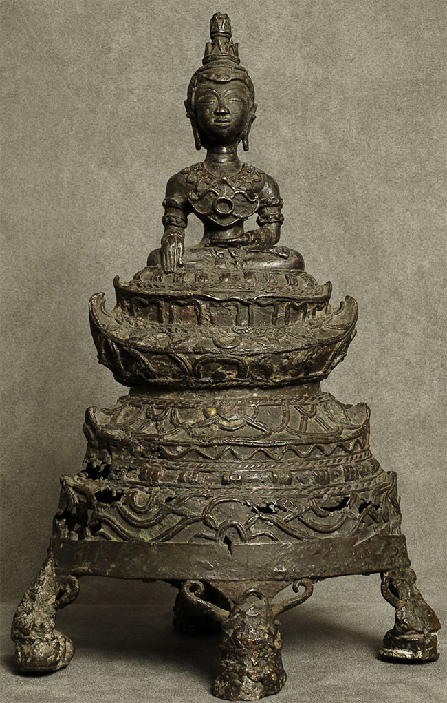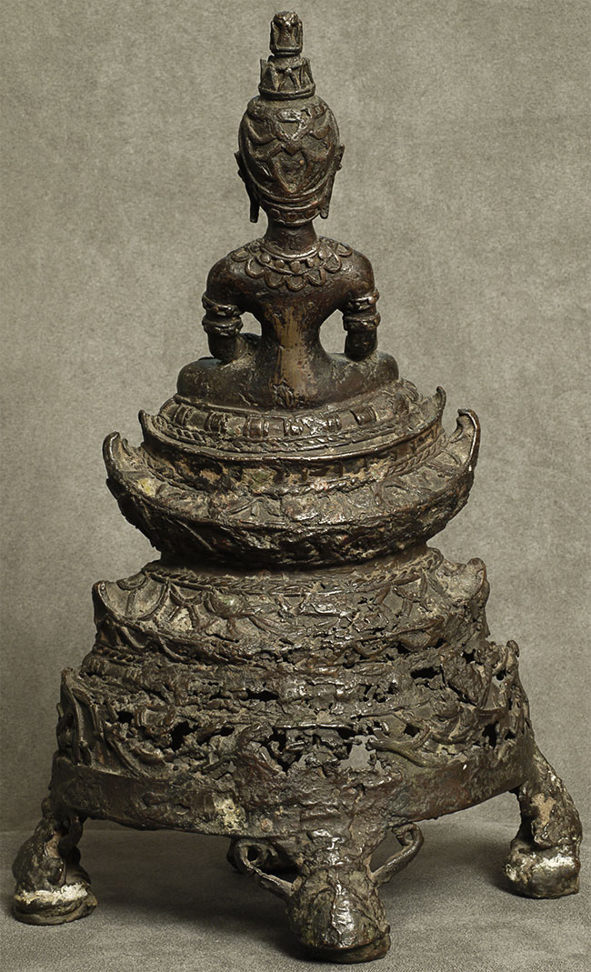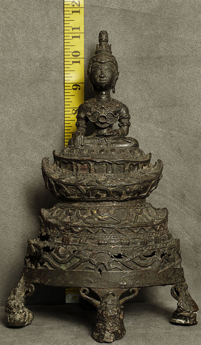 Very special 16/17thC Laos Buddha. Distinctive deignwork covers nearly the entire piece. Tip of the finial missing and some original casting flaws- otherwise excellent. Remains of enamel or other color remain in parts of the ornamentation. Rare type. Sits proudly at 11 1/8" tall, 8" across the base.