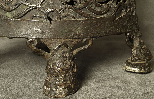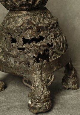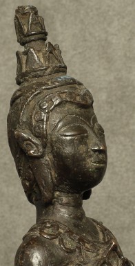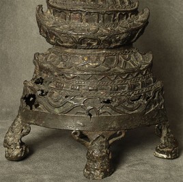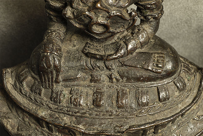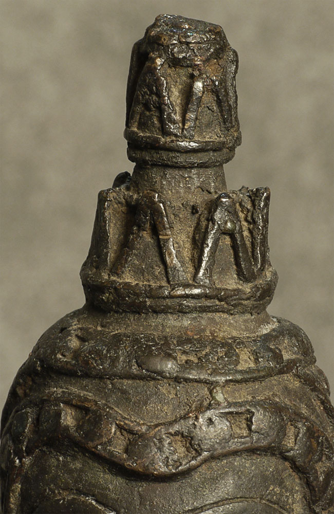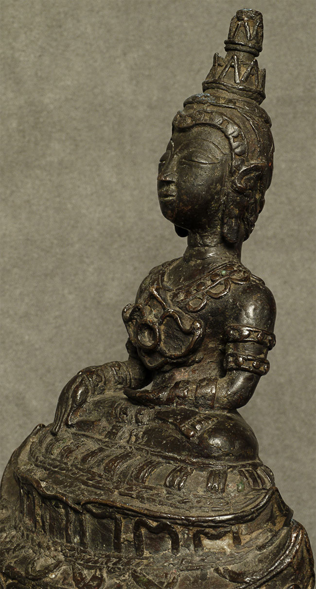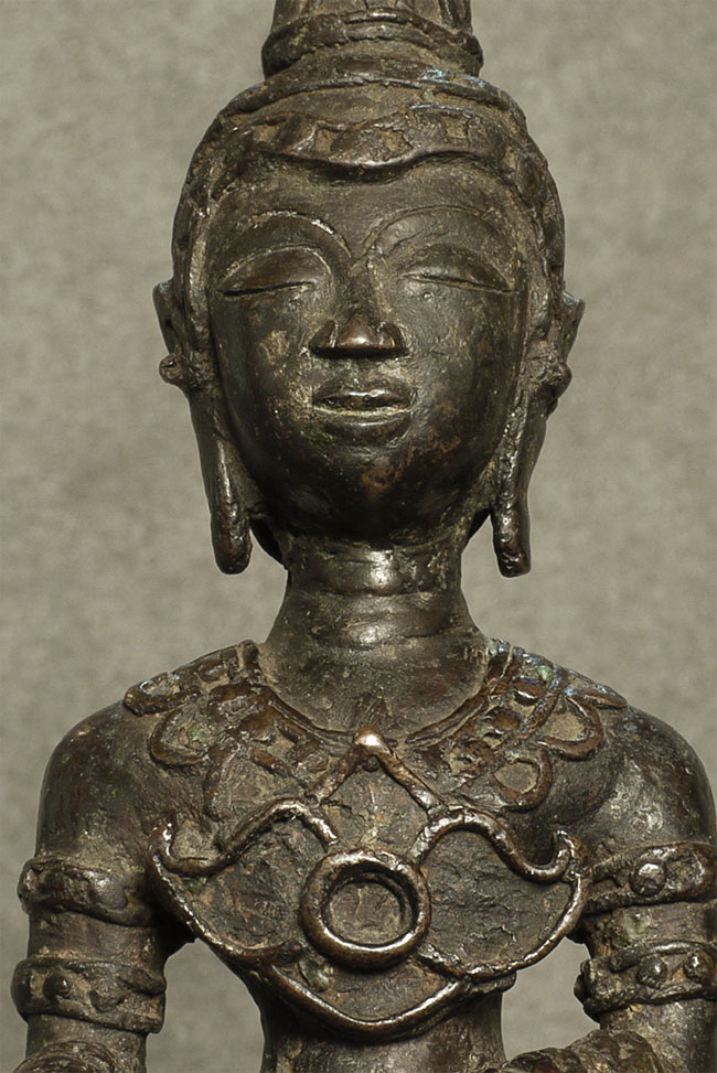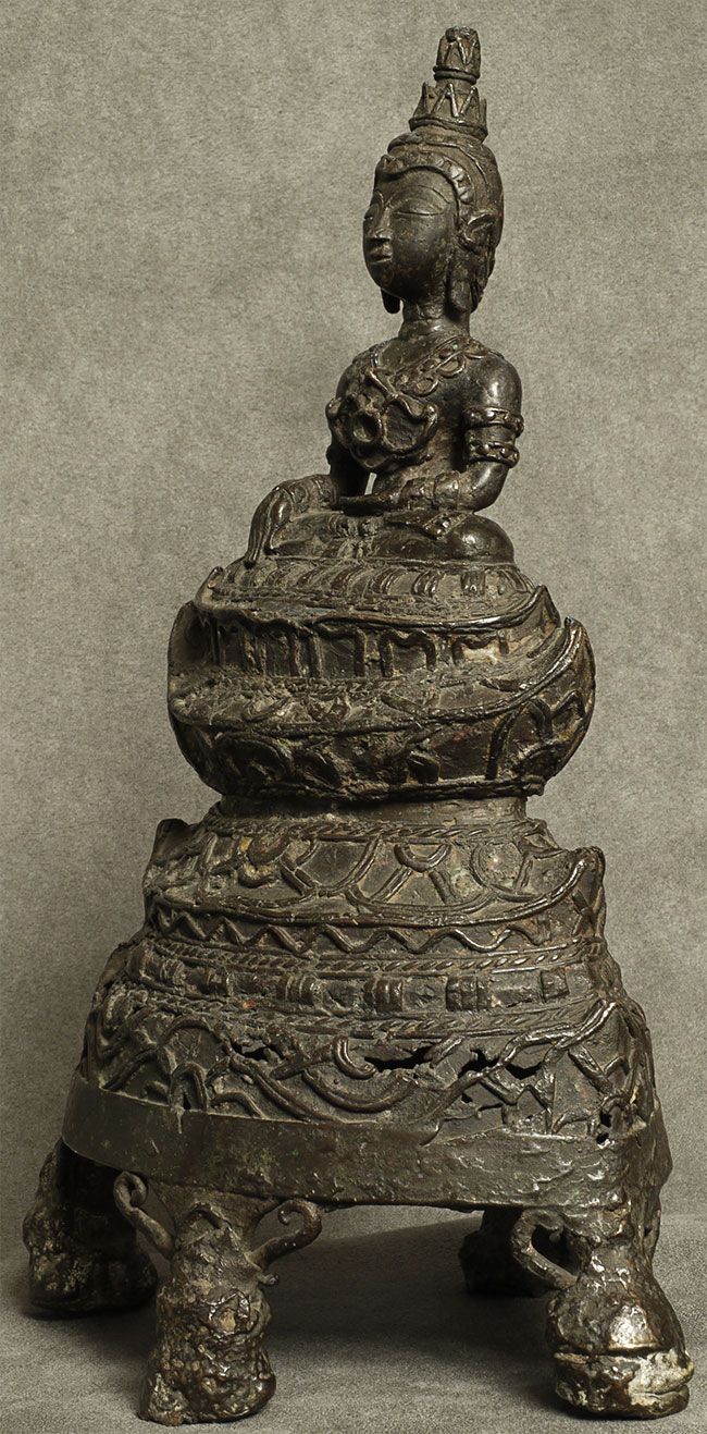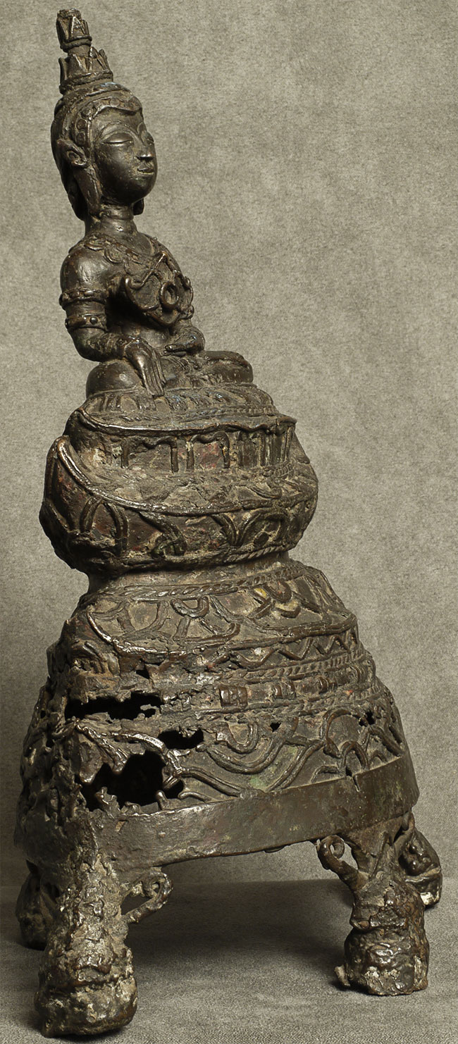 Very special 16/17thC Laos Buddha. Distinctive deignwork covers nearly the entire piece. Tip of the finial missing and some original casting flaws- otherwise excellent. Remains of enamel or other color remain in parts of the ornamentation. Rare type. Sits proudly at 11 1/8" tall, 8" across the base.