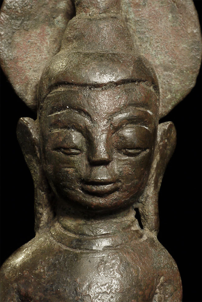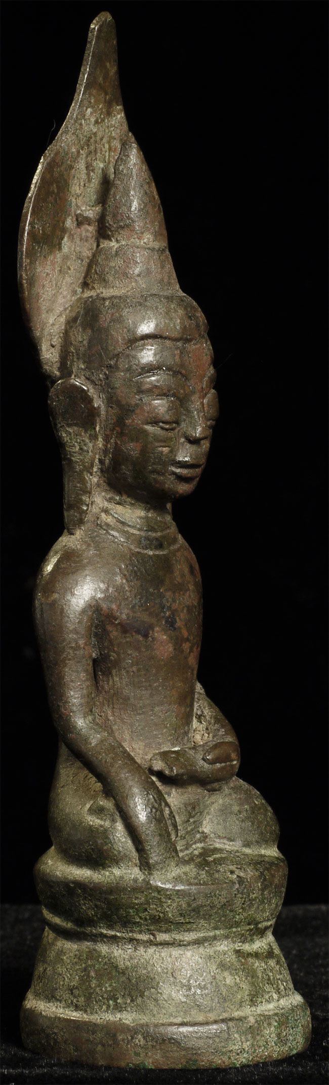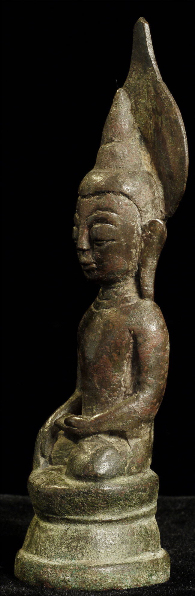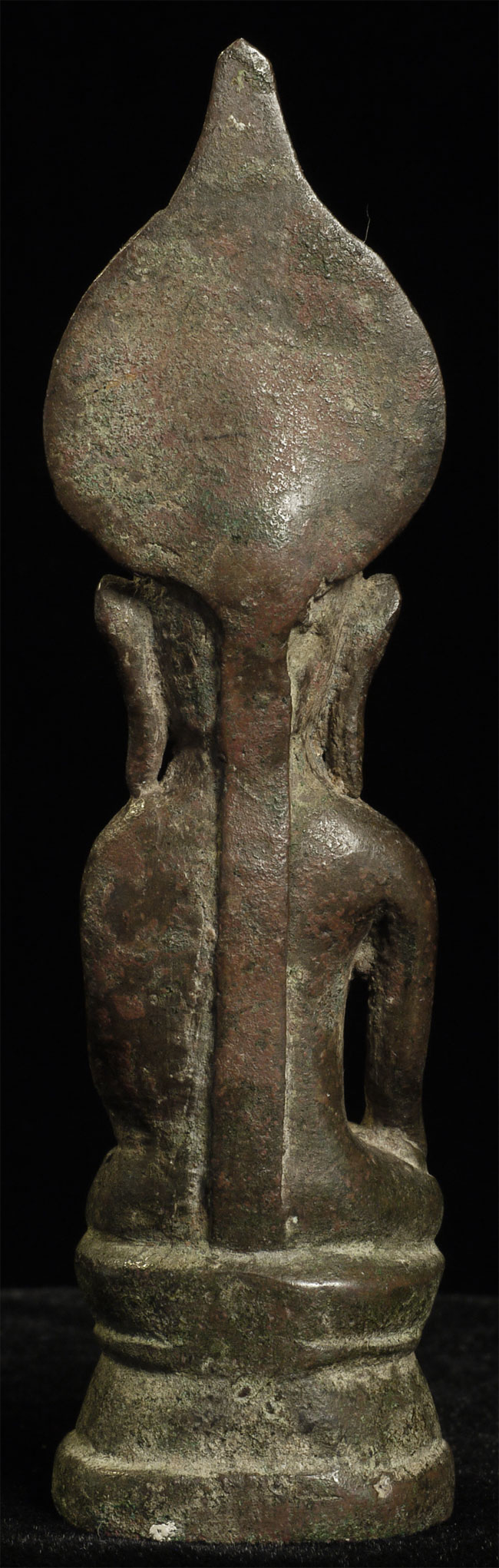 18thC Burmese bronze Buddha under a stylized Bodhi tree. Sits happily at 4.5 inches tall.