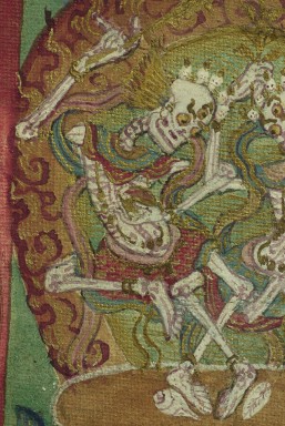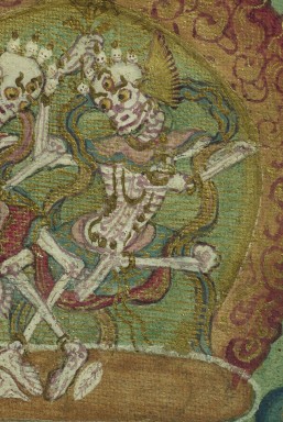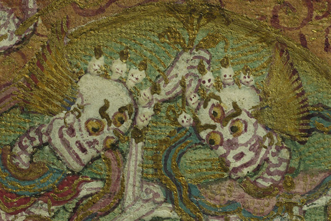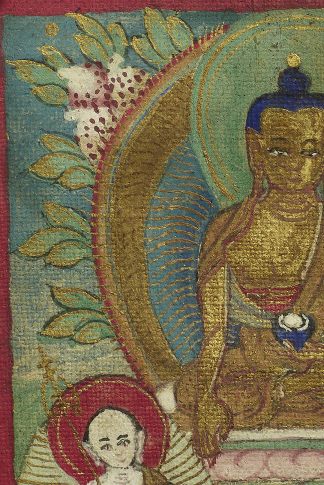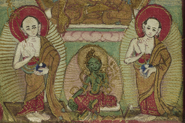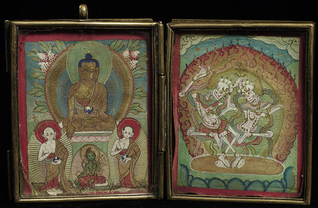 2 miniature painted Thangkas in a folding double frame. Overall dimensions of 3 inches tall, 5 inches wide