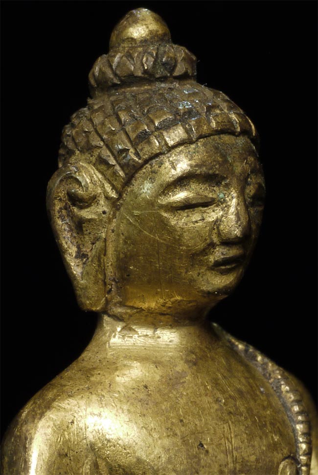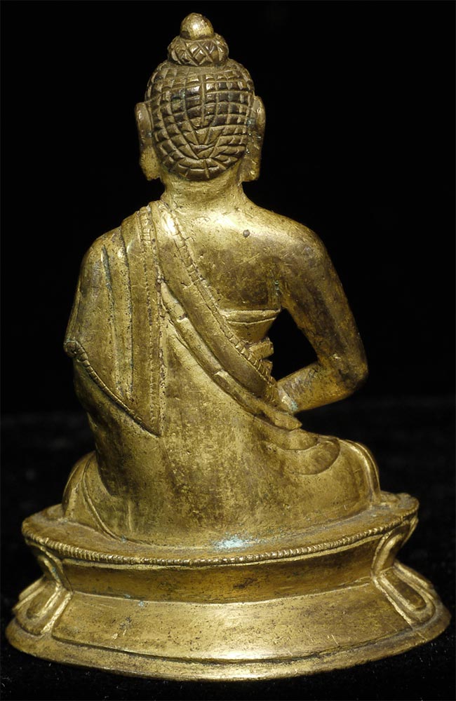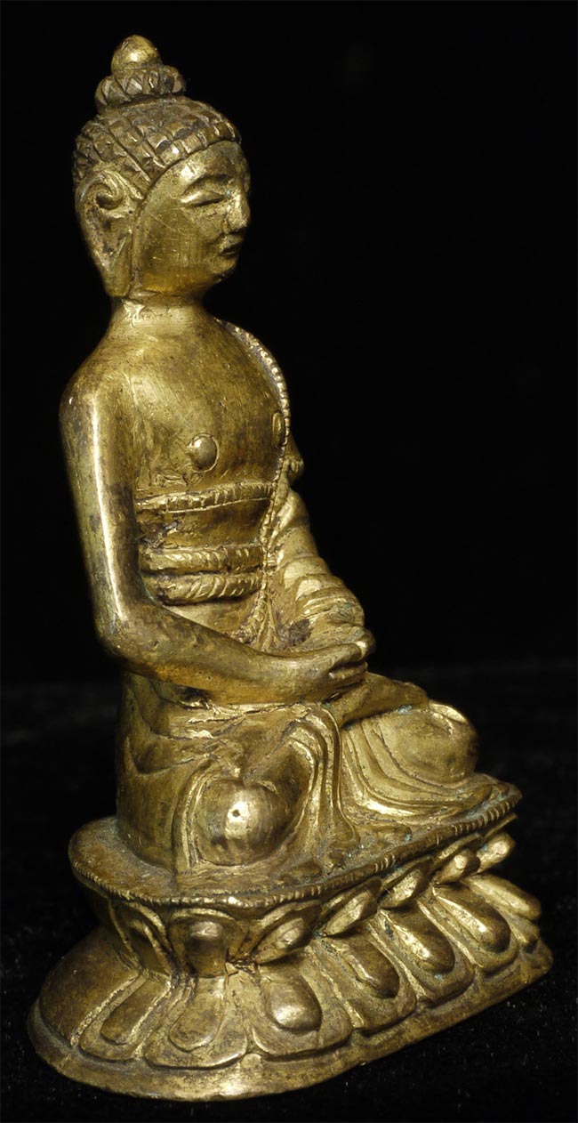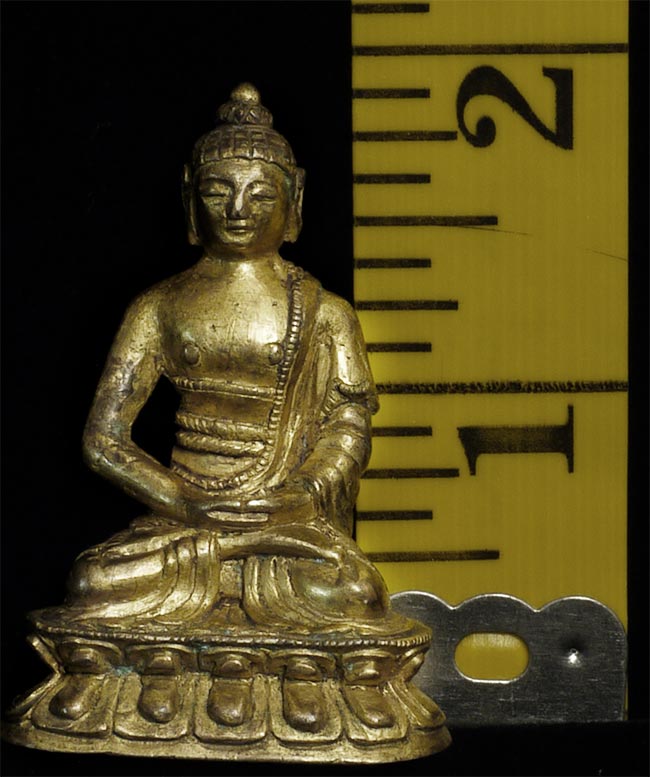 Very unusual 19thC gilded and consecrated Tibetan Buddha. Near miniature at 1 7/8 inches tall.