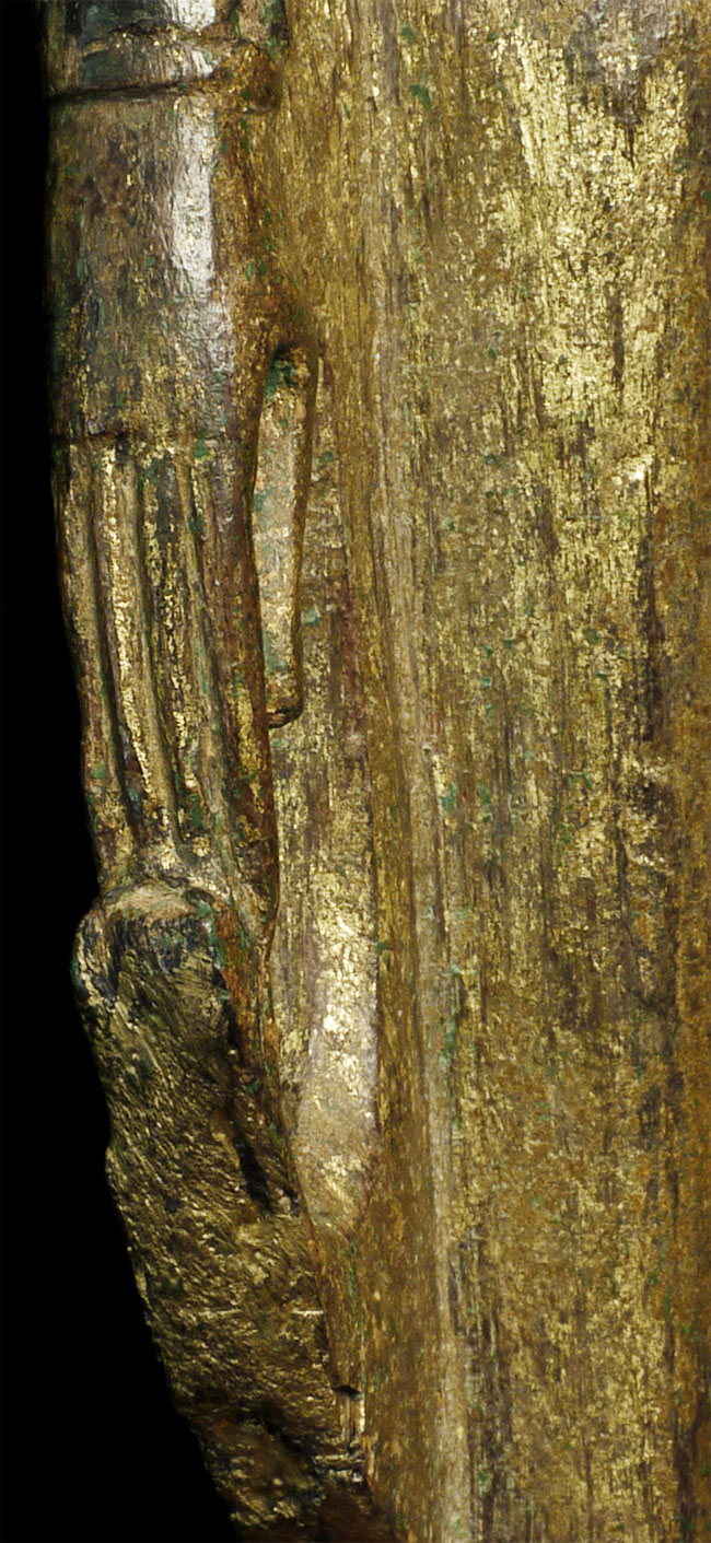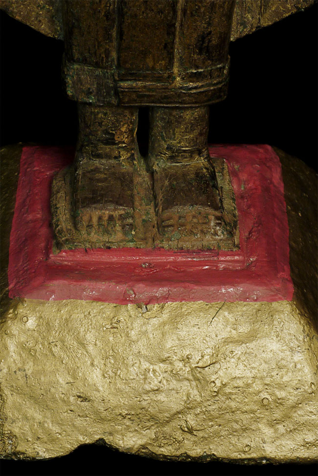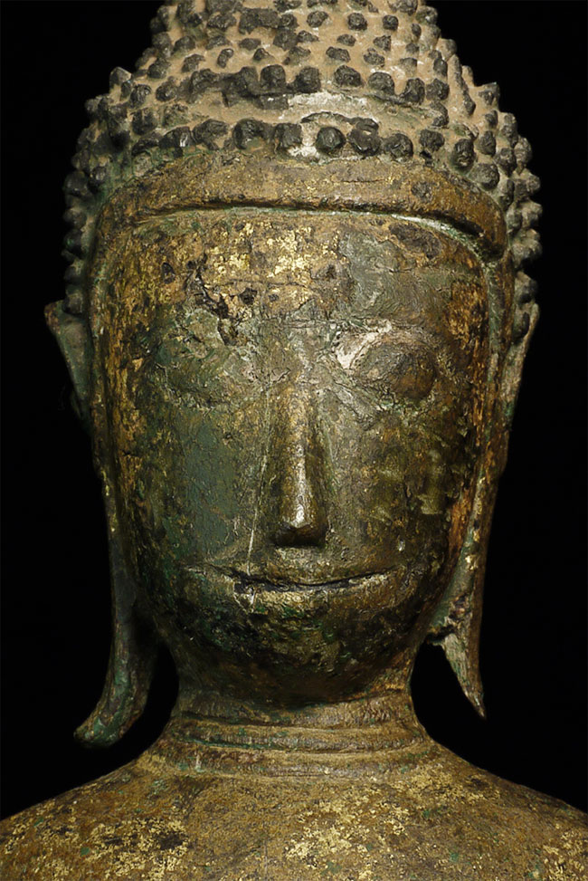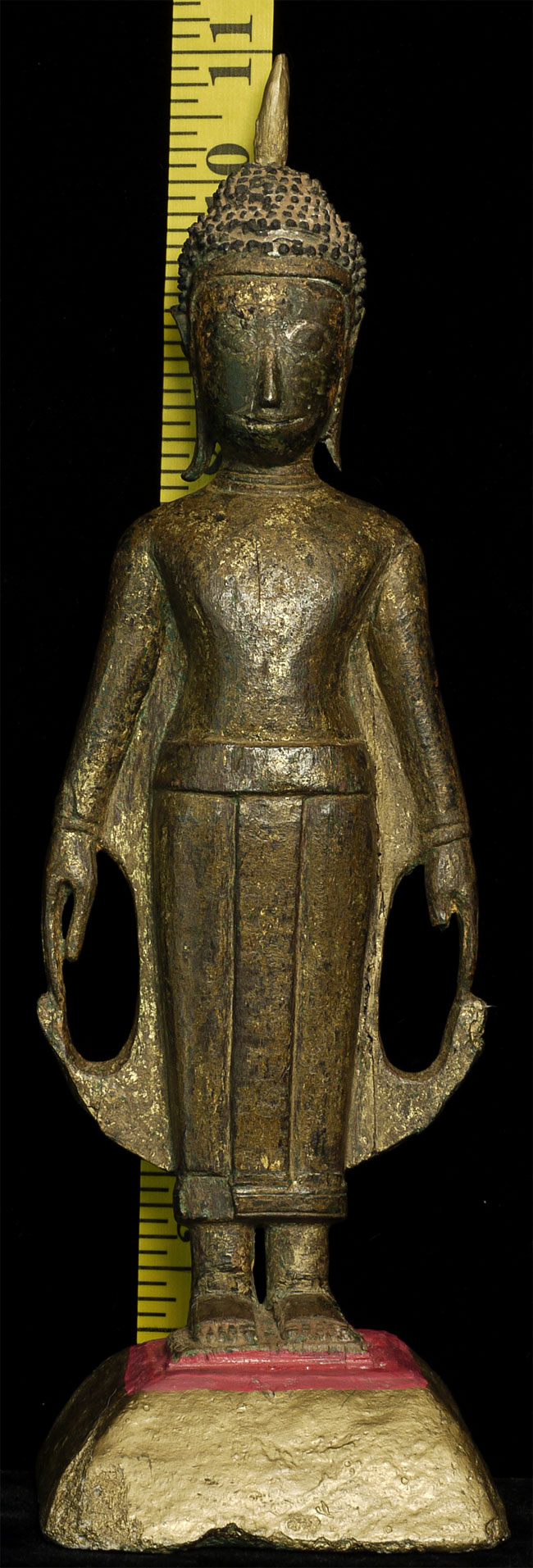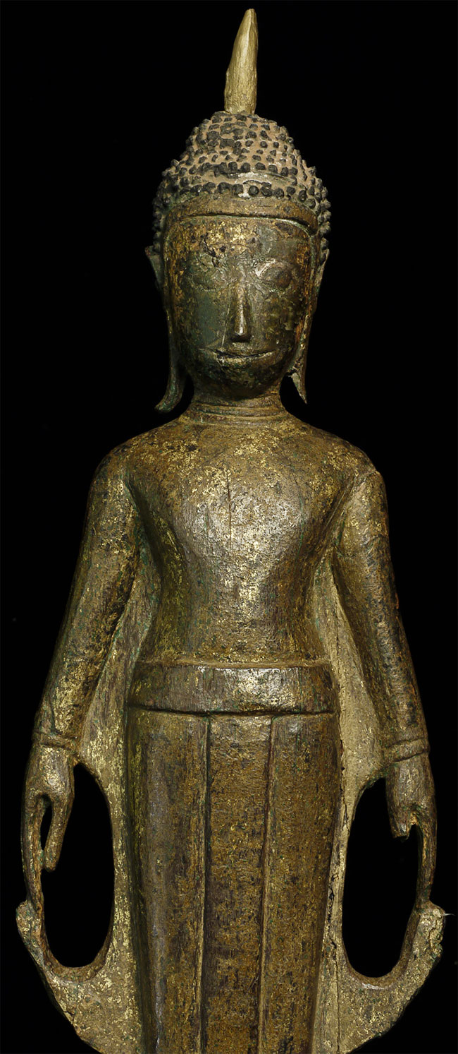 This is an extra special standing Buddha from Laos or Thailand near the Laos border. It is made of wood, and is in very good condition, with the only loss being to one ear, plus expectable wear to the lacquer and gilding. I've never seen another like it. The condition suggests that it may have lived most of its life protected deep in a cave. Also, it is made of teak, which is resistant to bugs and rot. The face is marvelous, with a deep serenity and dignity rarely found in folk art of this type. It is a very good size at 11 inches. The hair is made of lacquer, and the base is some kind of terra cotta or stone that I think is original to the piece.
