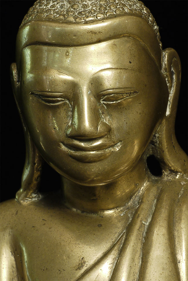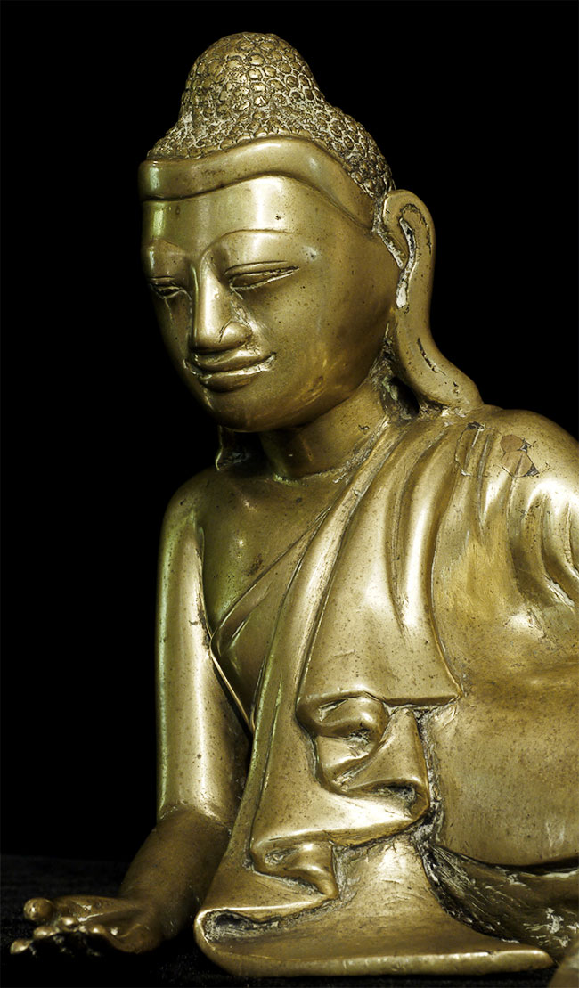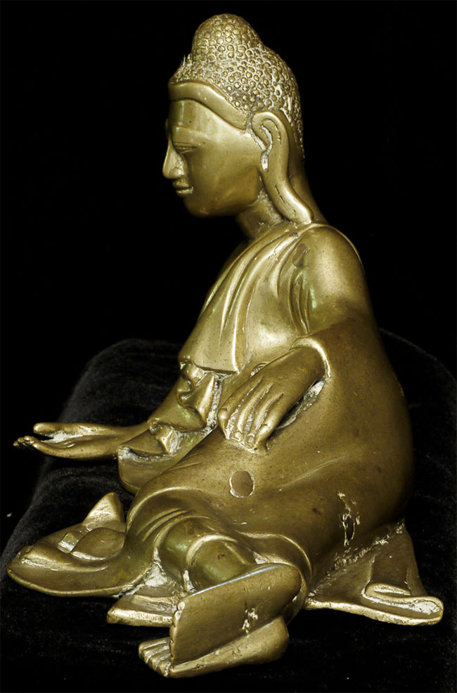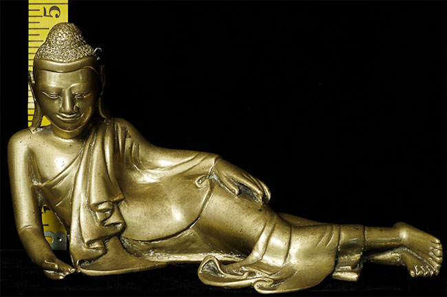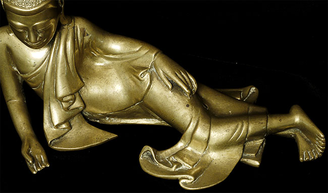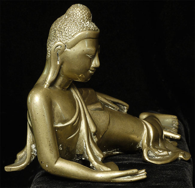 19thC Burmese Mandalay Buddha. Quite unusual up on one elbow. Sits 4 7/8" tall, 8.5" long, 3.75" at widest point.
