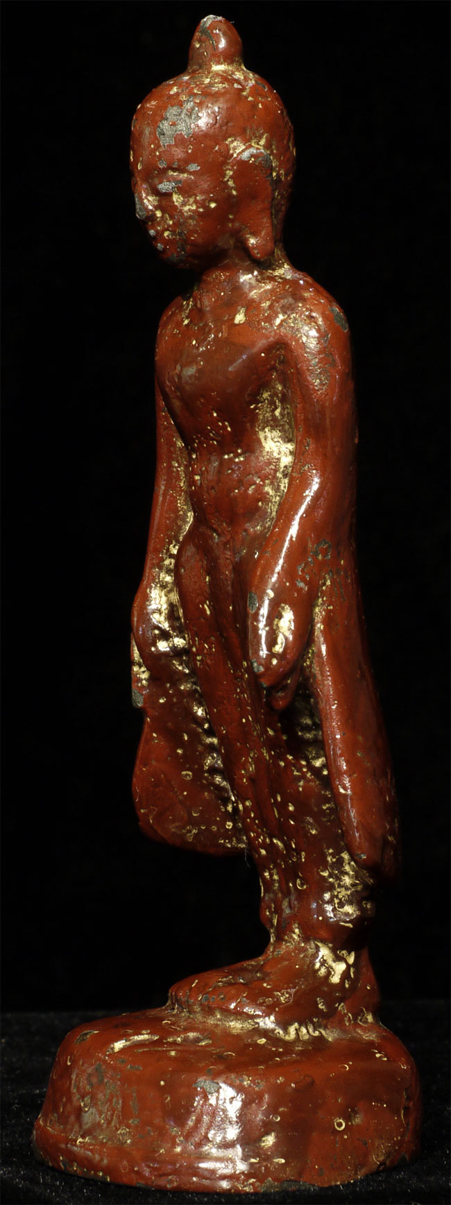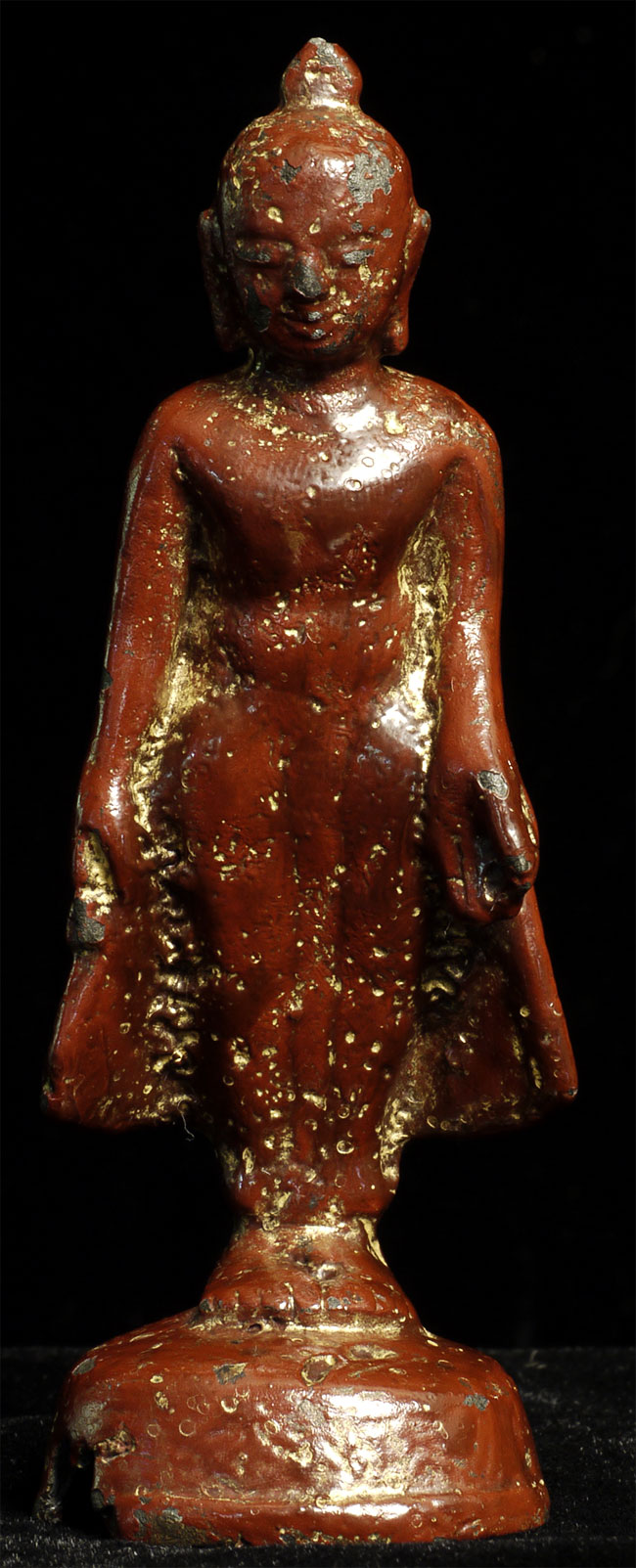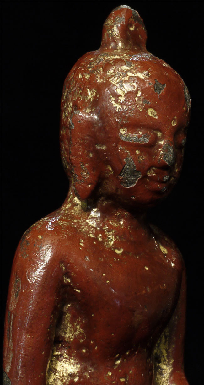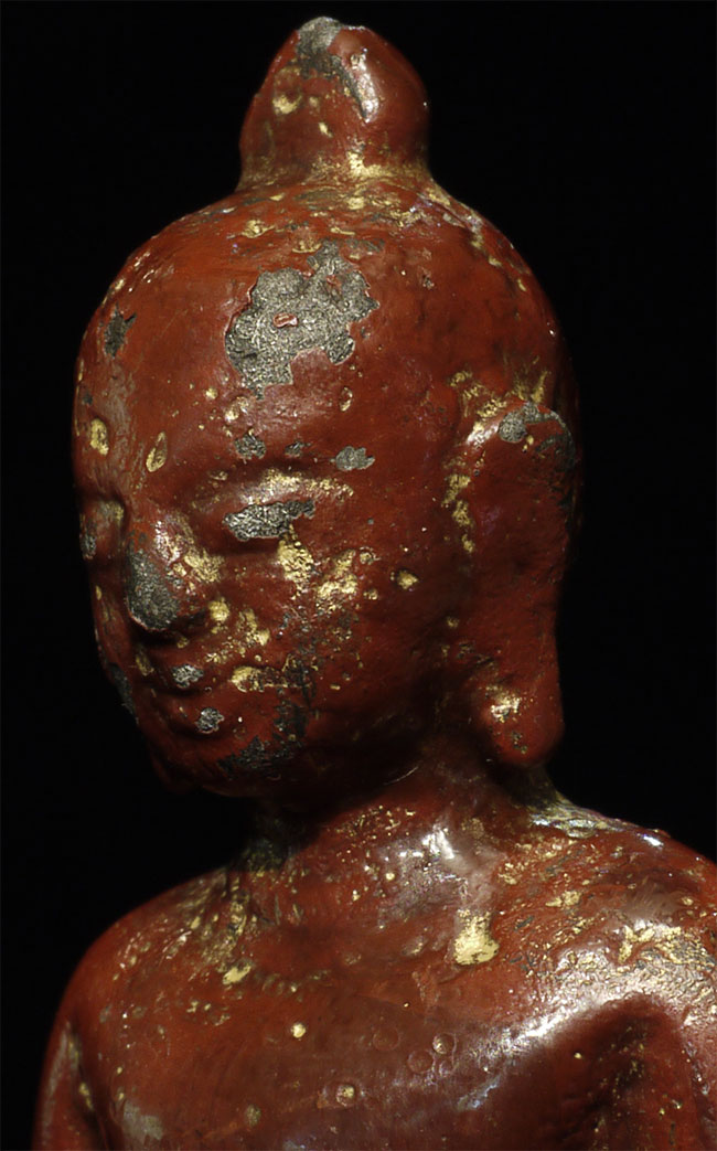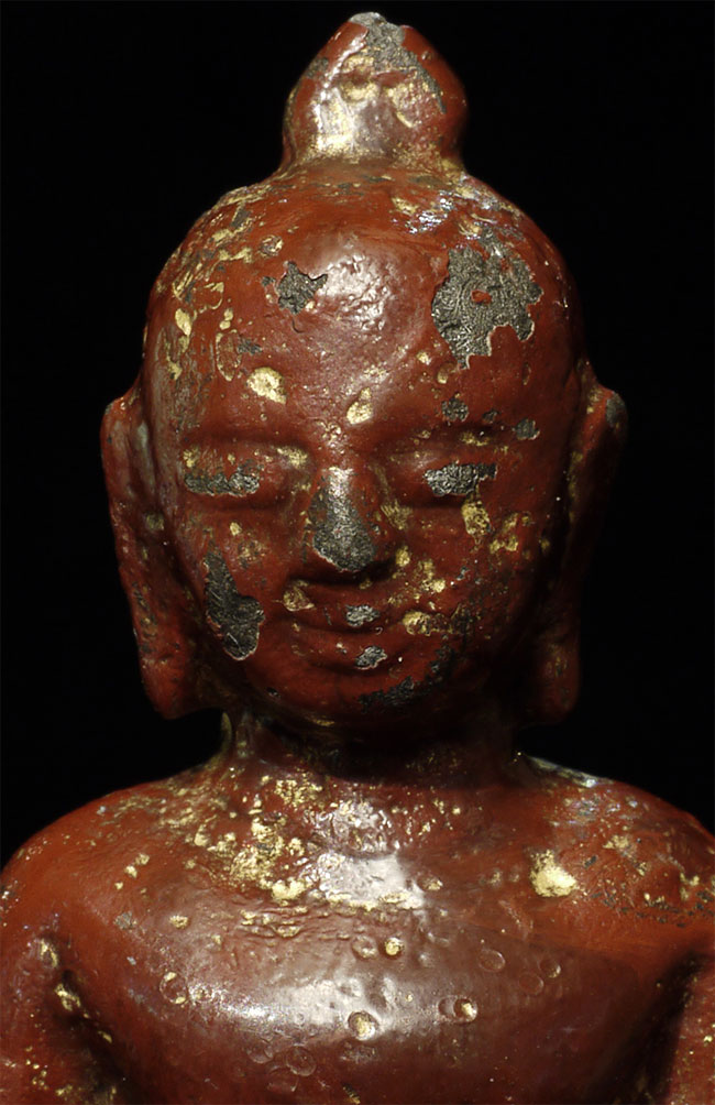Pagan style Burmese Buddha, probably 14/15thC from the Ava period. Stands calmly at 4 inches tall. Thick red lacquer and traces of gilding obscure the details, but the sensitivity of the sculpting stills shines brightly.