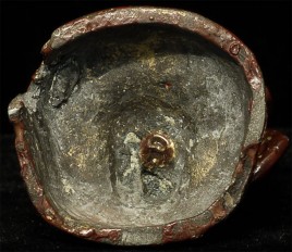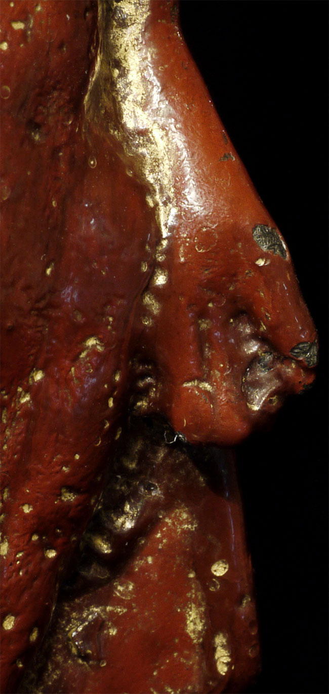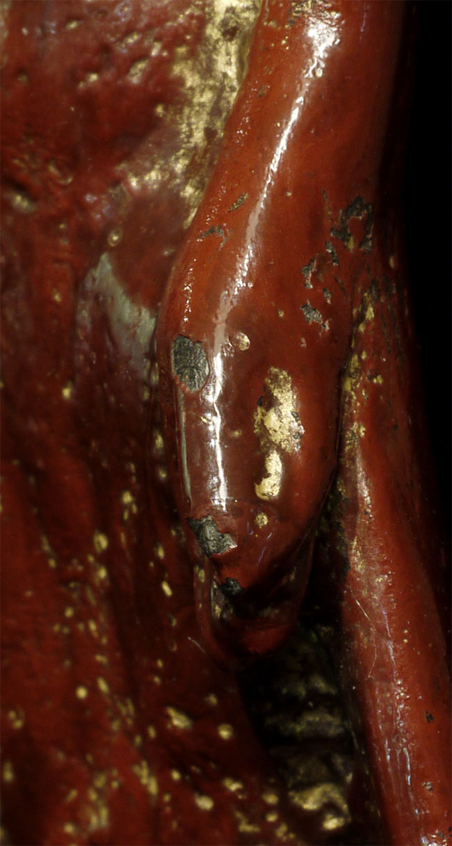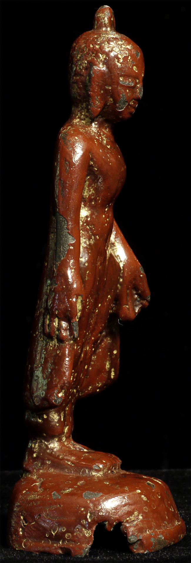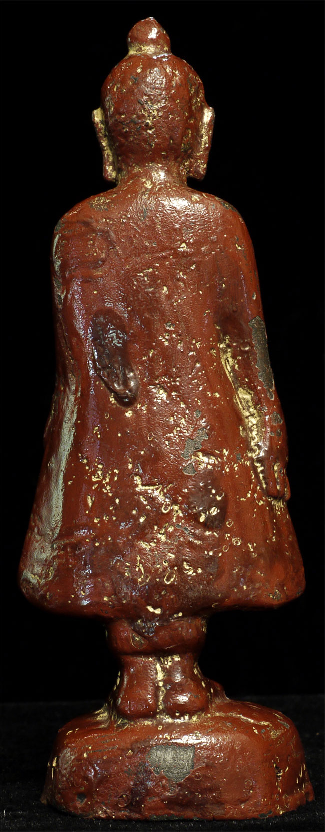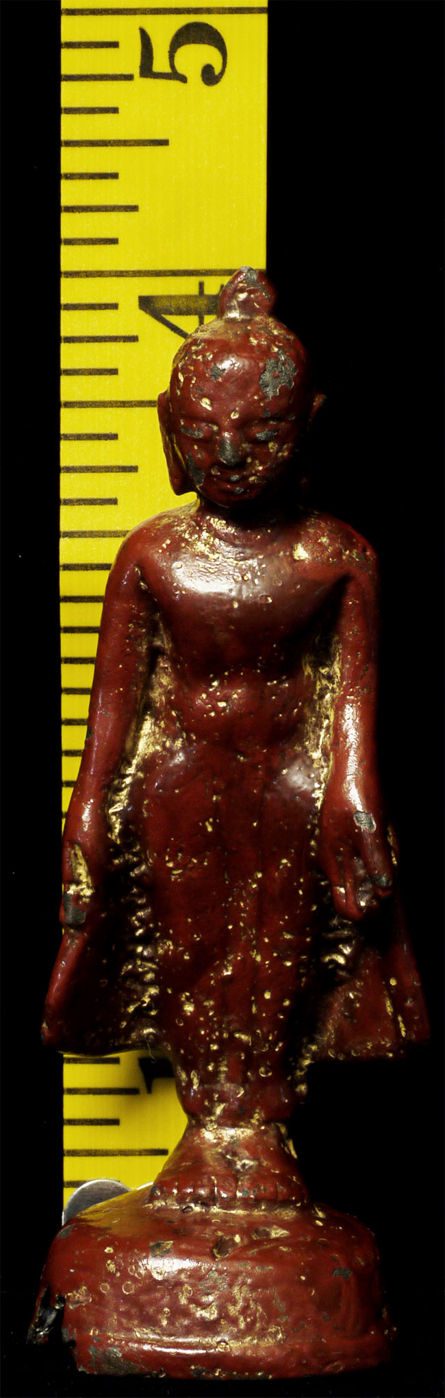 Pagan style Burmese Buddha, probably 14/15thC from the Ava period. Stands calmly at 4 inches tall. Thick red lacquer and traces of gilding obscure the details, but the sensitivity of the sculpting stills shines brightly.