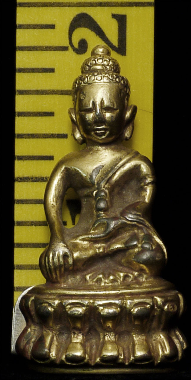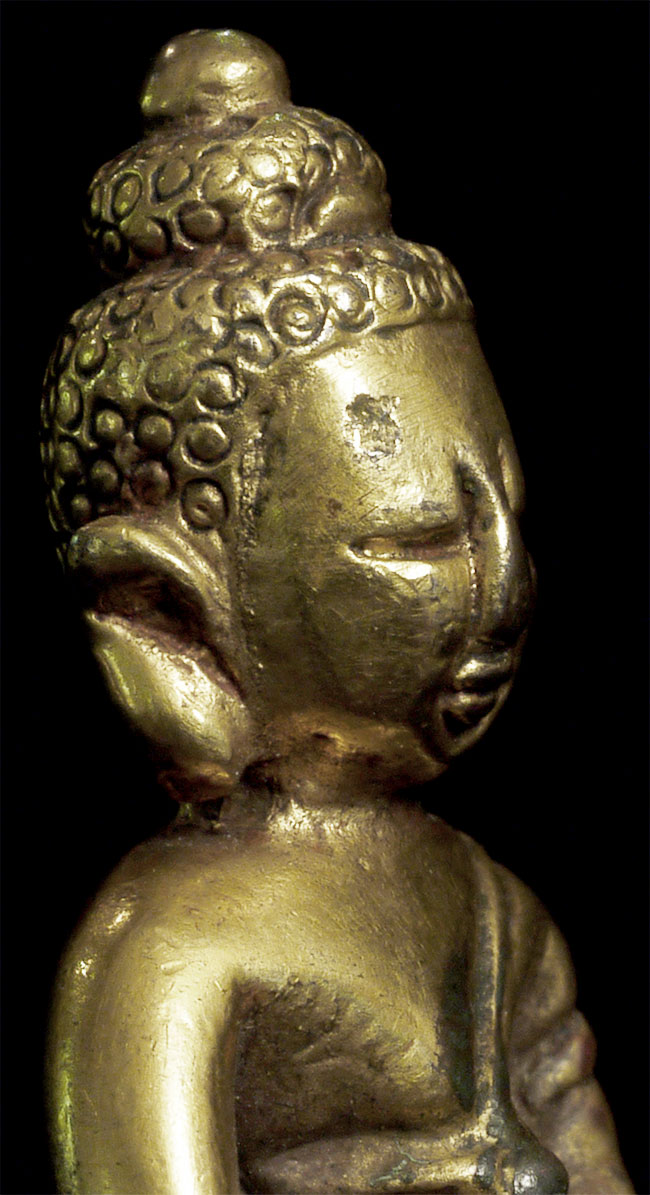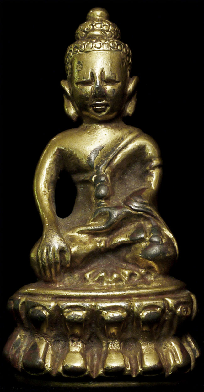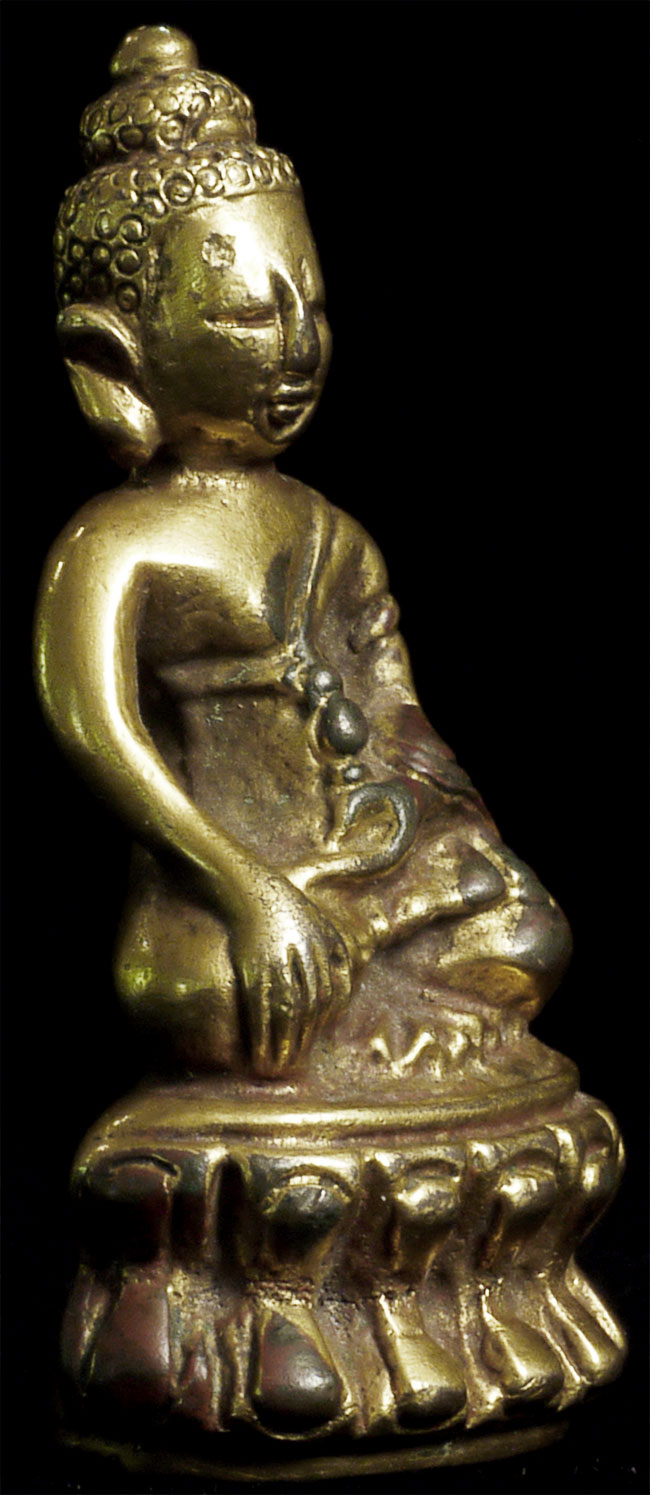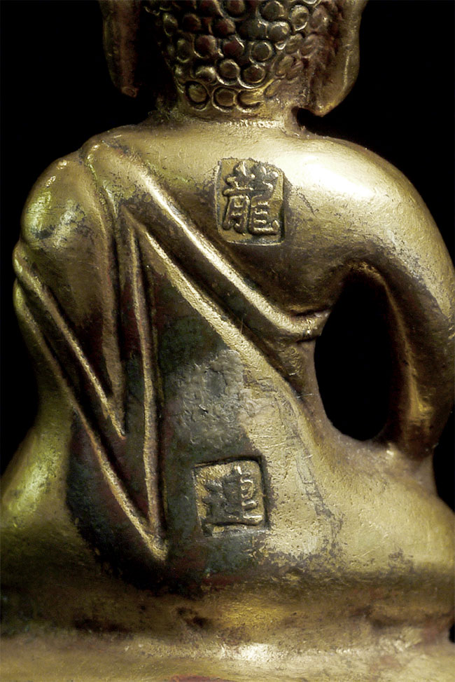 Delightful vintage/old Chinese miniature bronze Buddha with rattling sound inside. Evidence of ritual wear as seen in photos. Chop marks are probably from an associated temple. Sits happily at 1.75 inches tall