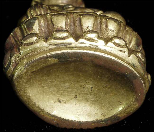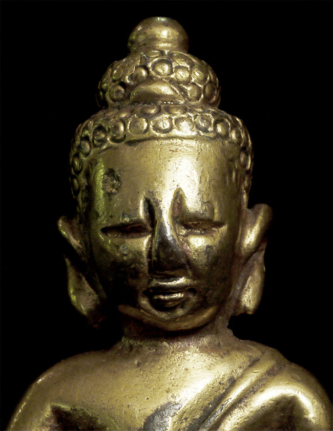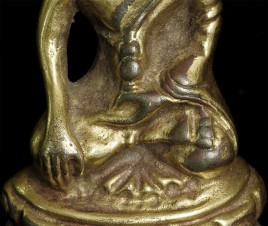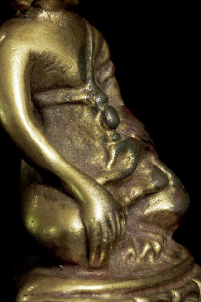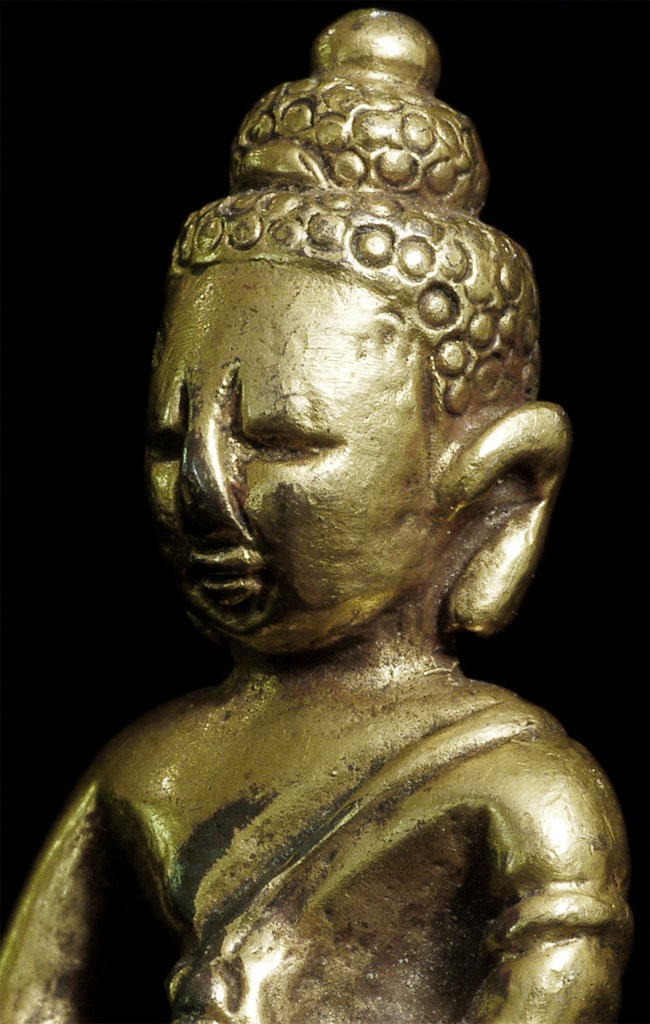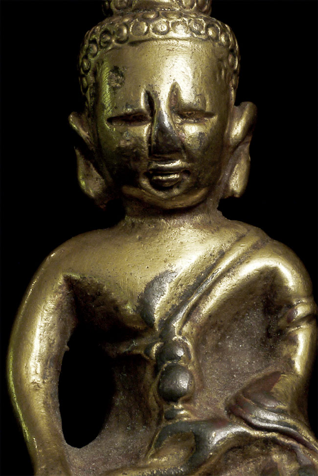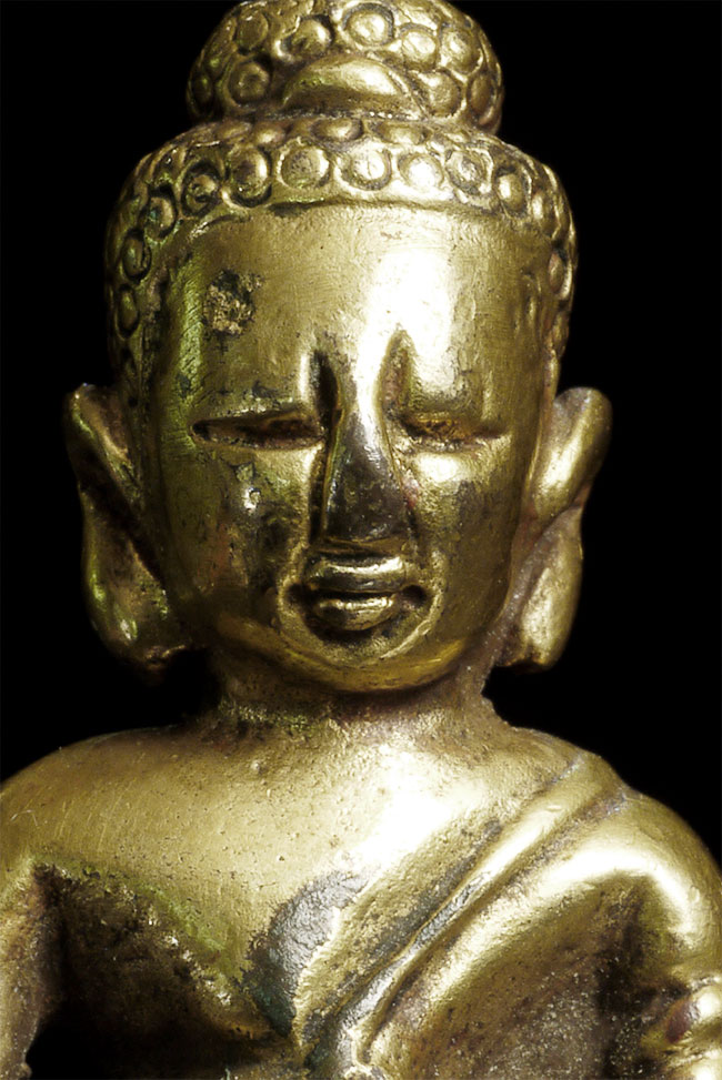 Delightful vintage/old Chinese miniature bronze Buddha with rattling sound inside. Evidence of ritual wear as seen in photos. Chop marks are probably from an associated temple. Sits happily at 1.75 inches tall