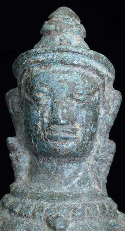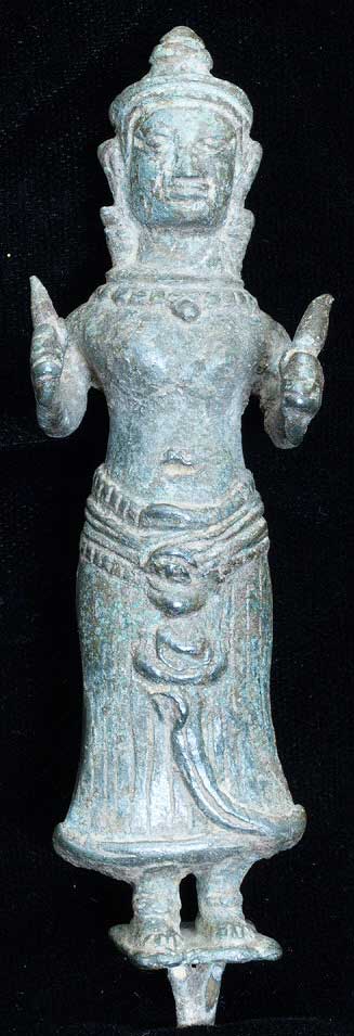 This is an authentic 12th century Angkor Wat era Deity. This piece was de-accessioned by the Asian Art Museum in San Francisco, and has Museum inventory numbers on both the lower back robe and the bottom. Periodically the museum sells off items to raise funds for new purchases. This piece was dated by the museum as 12th century. There is no loss or repairs that I can see: it originally probably stood in a larger base as part of a trinity, so it will need a stand in order to stand properly. It even still has the original mounting post, so this should be simple to do. The actual figure is fully intact. It has a good patina. It stands 4.25 inches tall. Nice item, and with a sterling provenance.