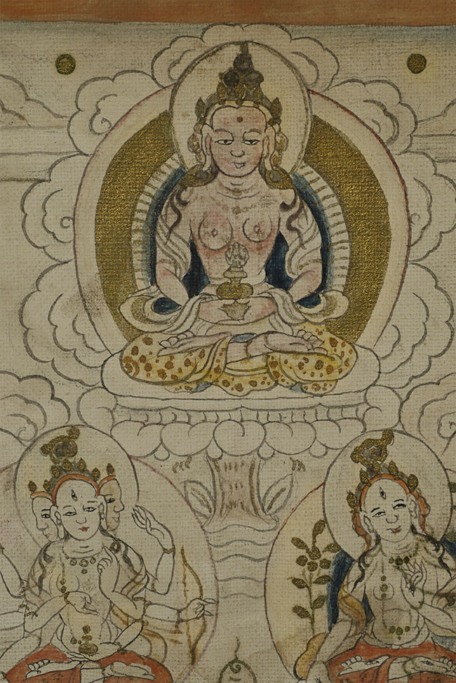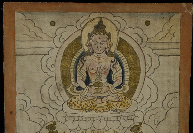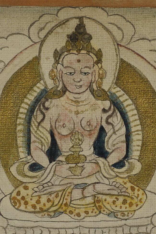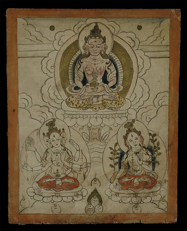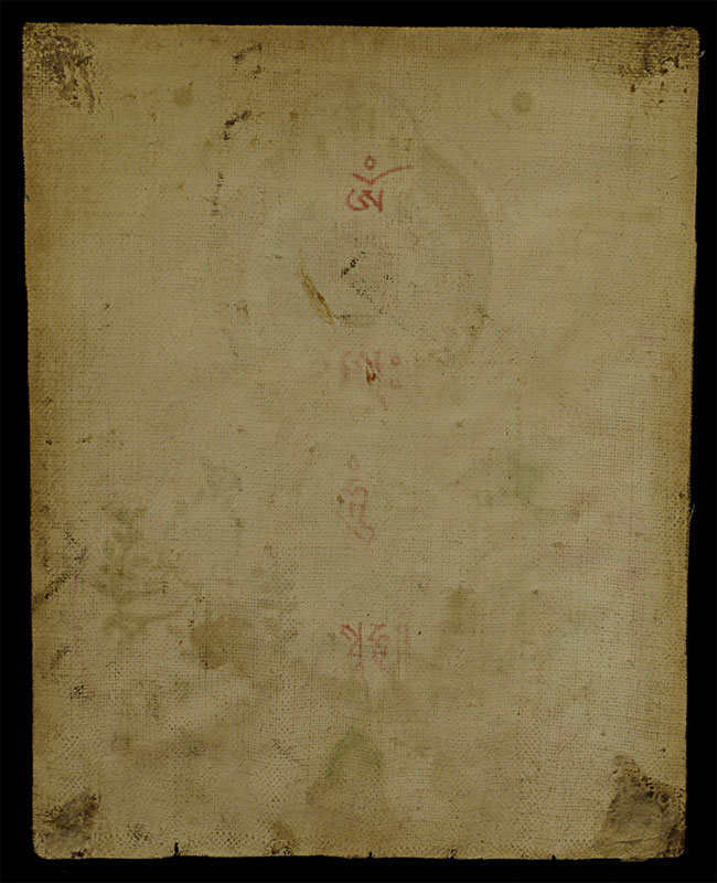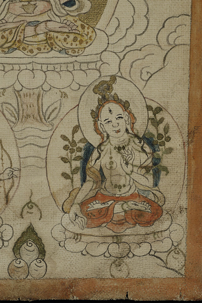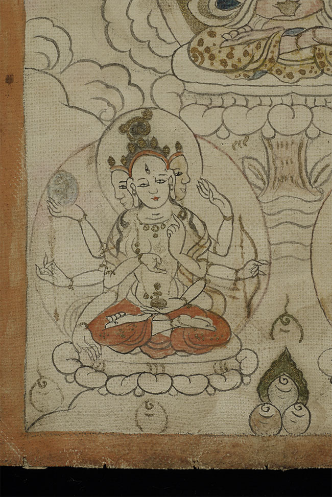 This 3.5 x 4.5-inch antique Mongolian thangka presents a serene and finely detailed deity seated in meditation, adorned with delicate gold accents that shimmer softly against the natural pigments. The figure’s calm expression, crowned presence, and offering vessel at the center create a compelling sense of spiritual focus. Subtle shading, meticulous linework, and the elegant textile patterns—especially the gold-flecked robes—reflect skilled craftsmanship and traditional Mongolian aesthetics. Despite its intimate scale, the painting carries remarkable presence and warmth. A beautiful, early devotional work perfect for collectors seeking a well-preserved miniature thangka with both refinement and spiritual resonance.