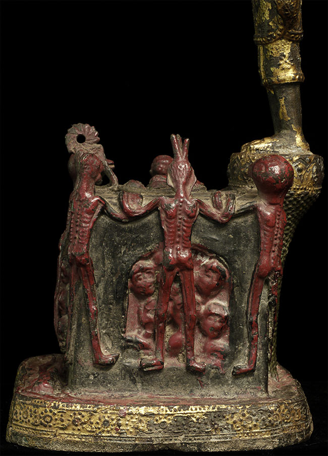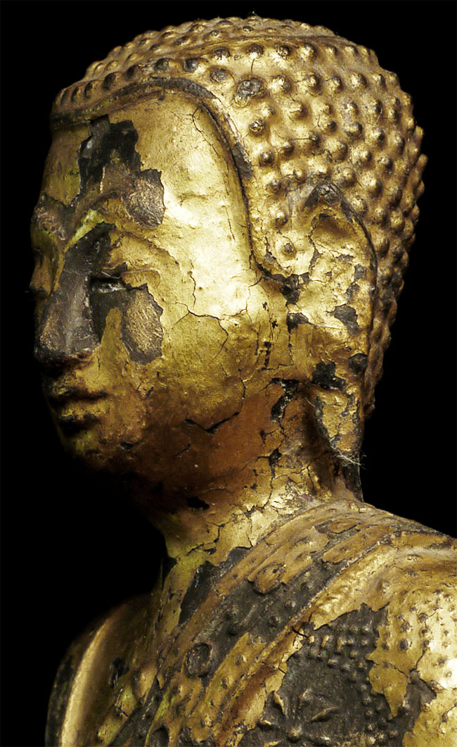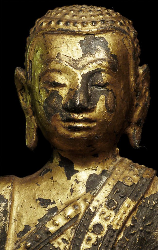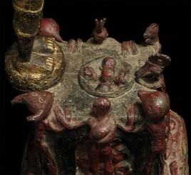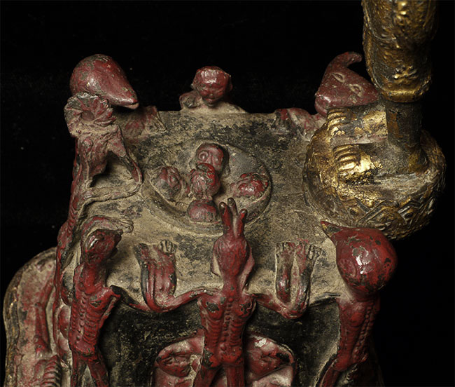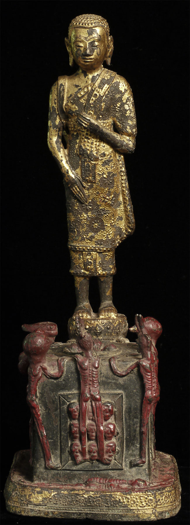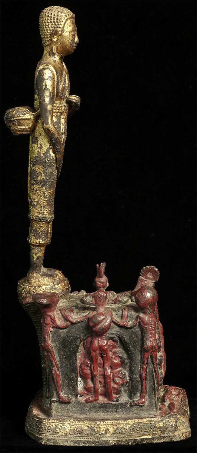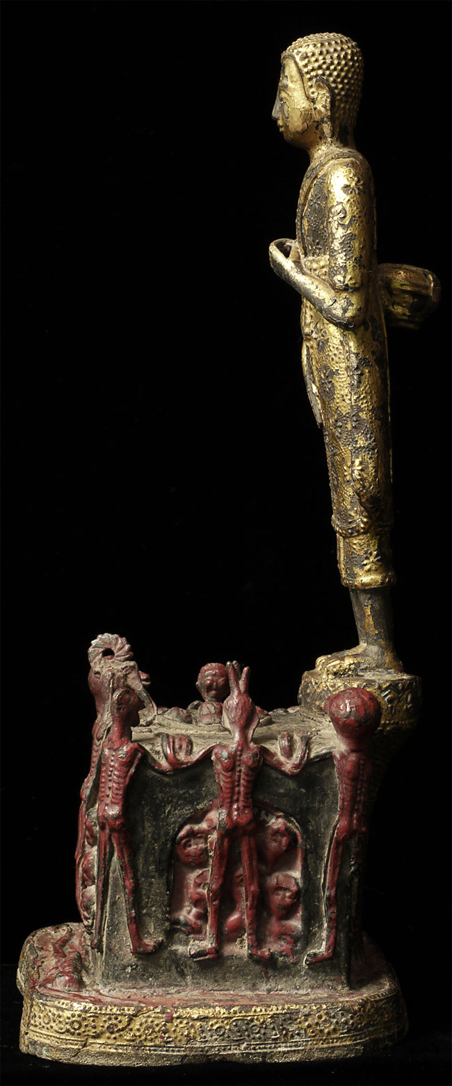 High quality 19thC Rattanakosin "Pra Malai" being tempted by demons while on his journey. A distinctively Thai style subject.10.75 inches tall, base bottom measures 4 x 4.25 inches