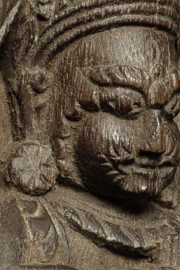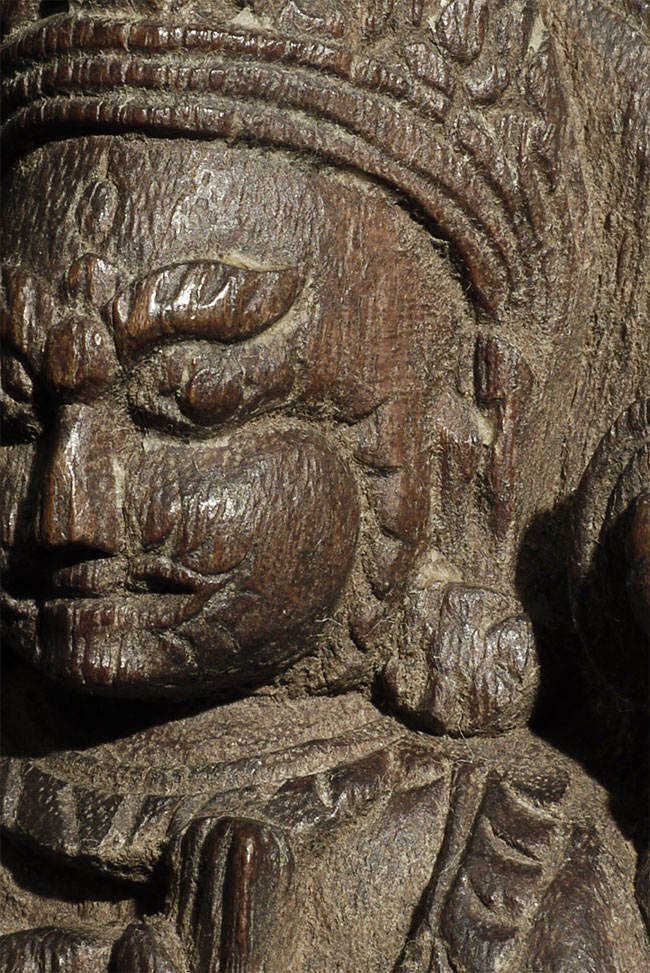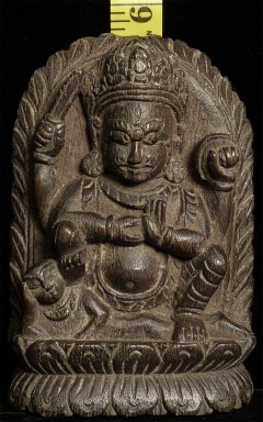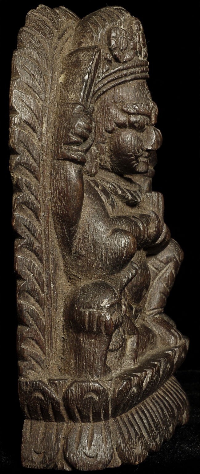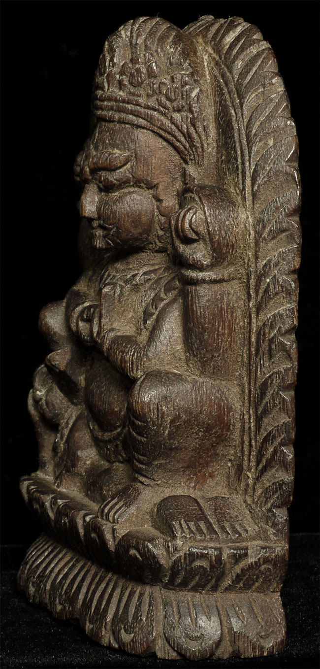 Antique Tibetan deity carved in hard wood. Nice old patina. Size is 5 5/8 inches tall, 1.5 inches deep and 3.75 inches wide. Appears to be consecrated on the bottom (and formerly on the back as well)