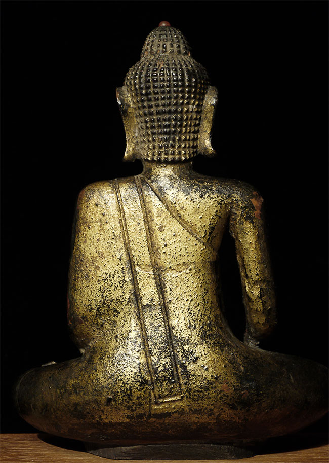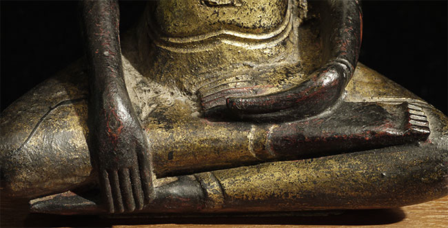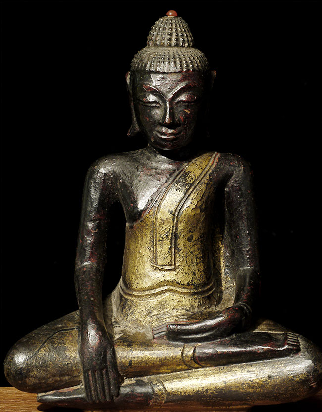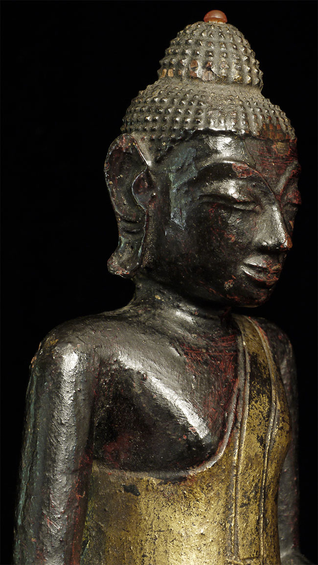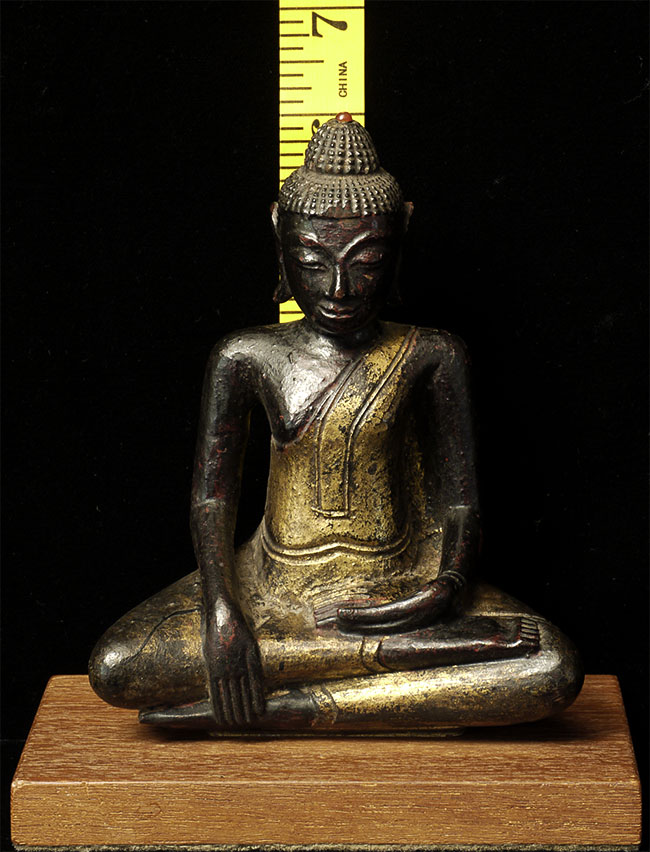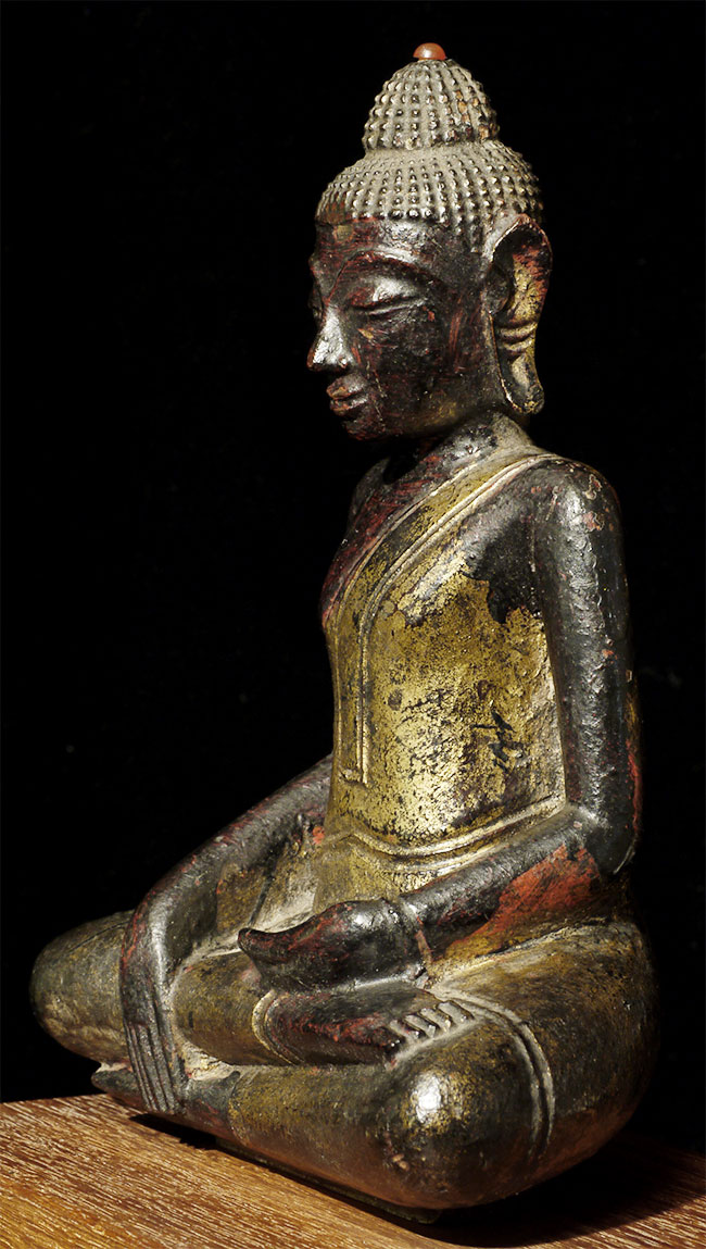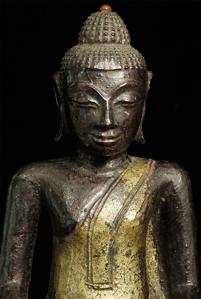 Exceptional antique Thai figure sculpted in wood. From the collection of a famous sculptor and artist. Total height is 6 inches, attached stand is 5/8 inches. Bottom of stand measures 3.5 inches x 5.5 inches