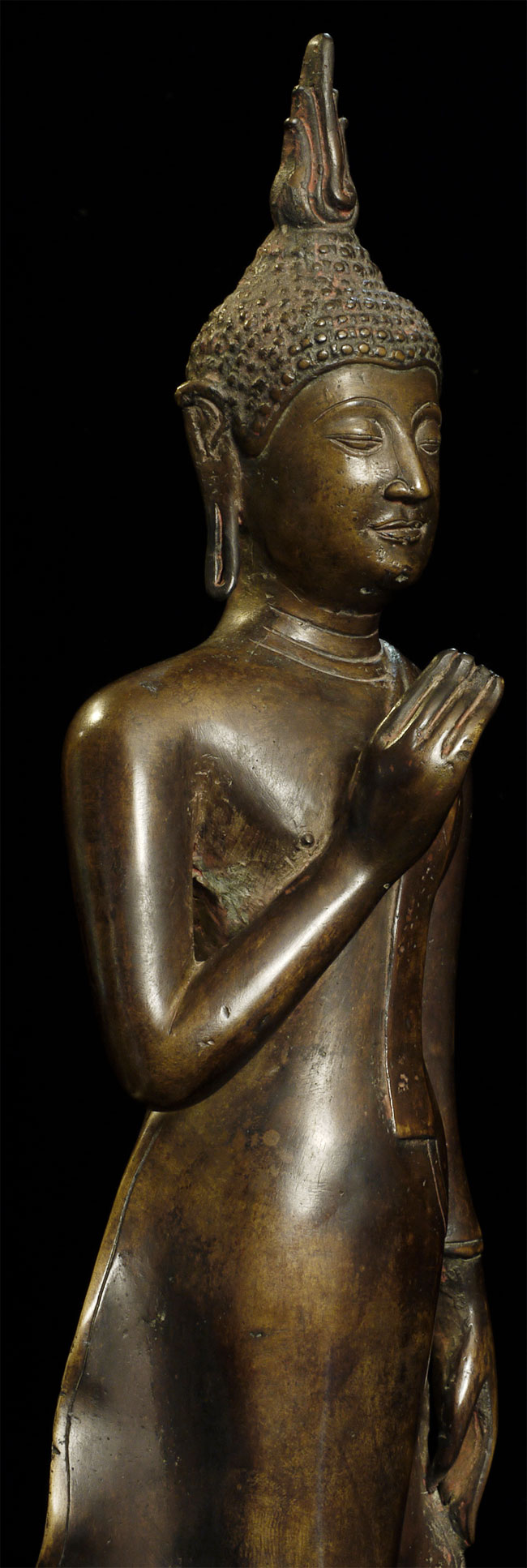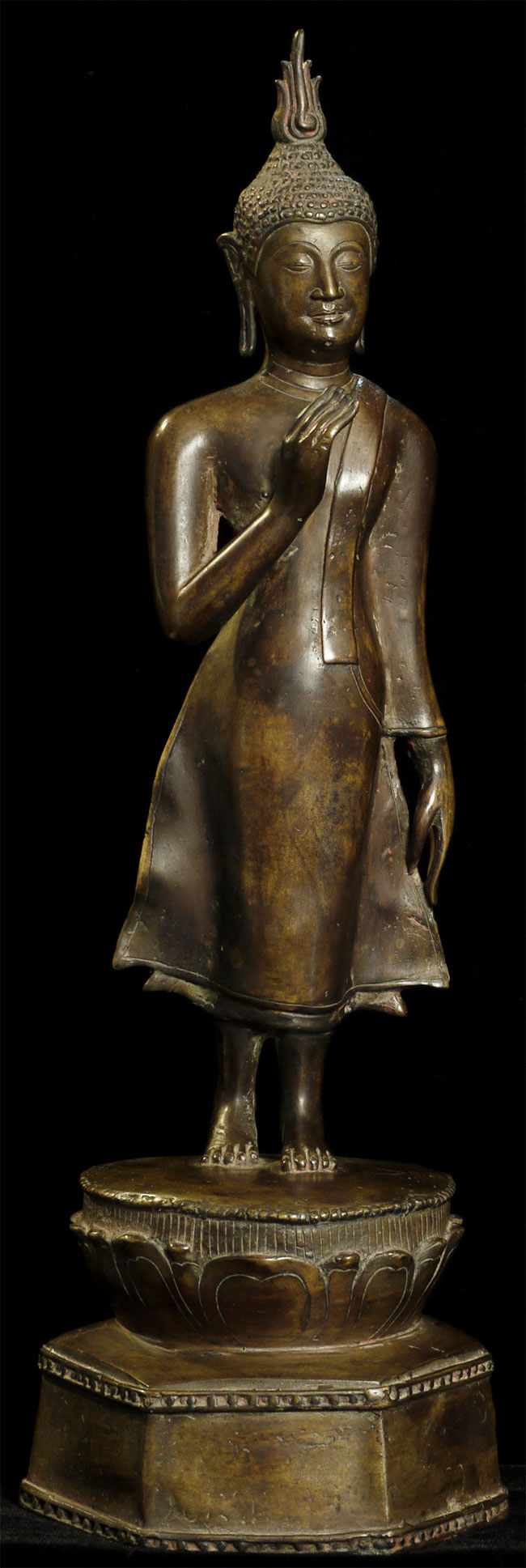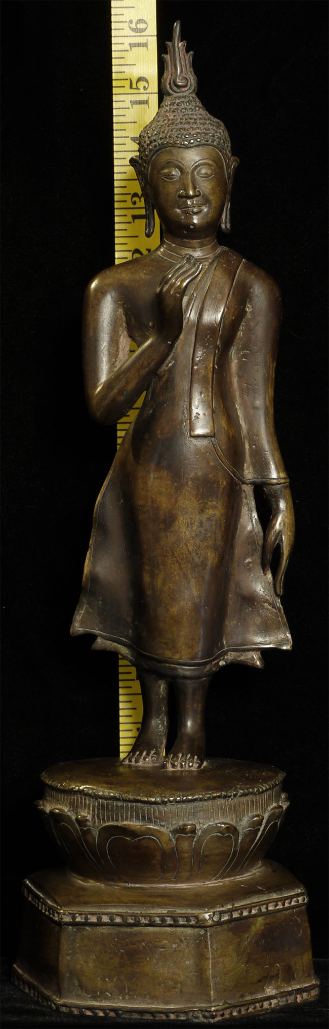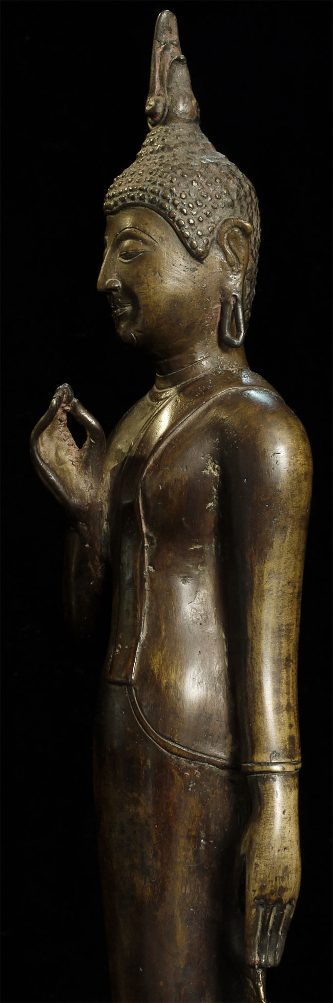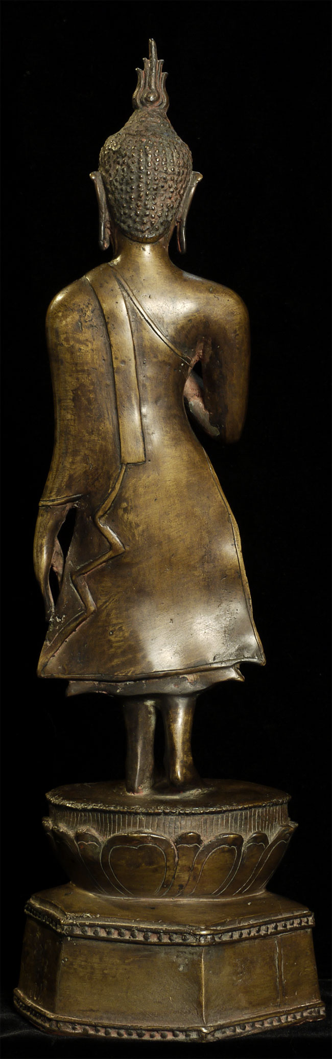 Probably 17/18thC Thai Walking Buddha from an European collection. The vast number of this type were made during the reign of Rama V in the last part of the 19th century and first part of the 20th. I believe this is not a period (13/14th) piece, but that it is a rare and beautiful Ayuthaya period emulation. Excellent quality, and very hard to find. 16 1/8" tall, bottom of base has an approximate diameter of 4.75 inches